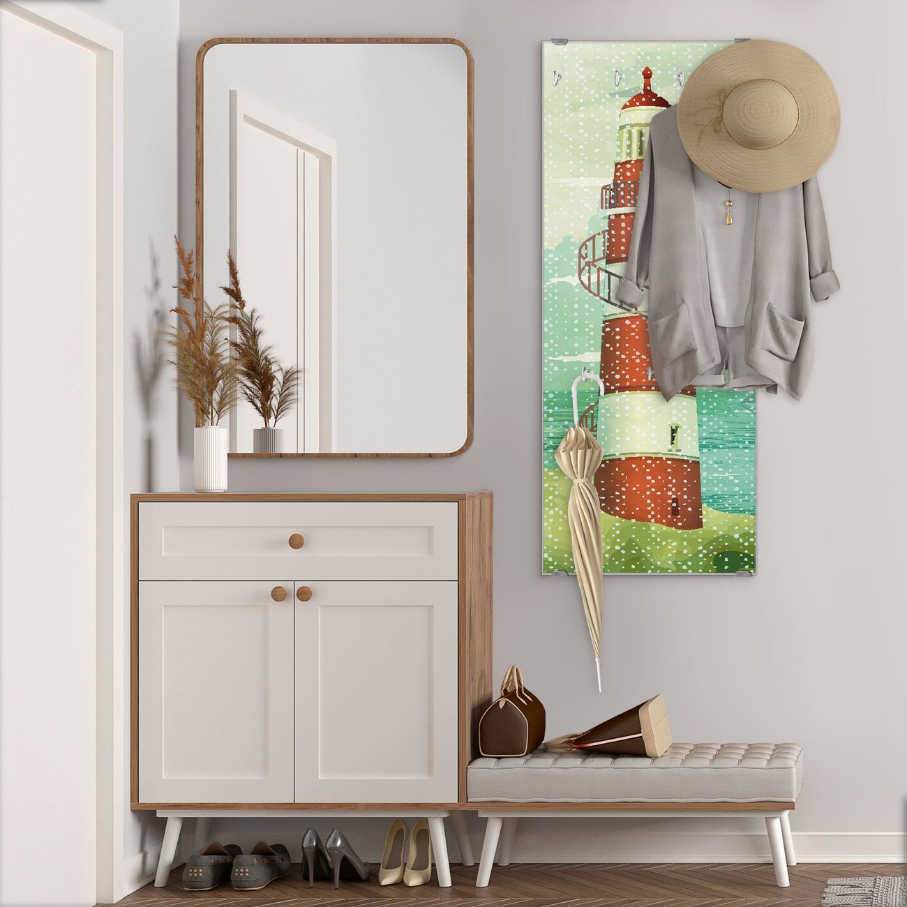 FUNKTION: Die banjado Wandgarderobe mit Motiv Alter Leuchtturm ist Ihr täglicher Begleiter. Zuverlässig hängen hier Ihre Jacken und Mäntel griffbereit. Das Echtglas ist Ihr Paneel auch beschreibbar und wieder abwischbar. DESIGN: Sie erhalten eine Garderobenleiste aus elegantem Echtglas mit dem Farbbrillanten Motiv Alter Leuchtturm hinterklebt. Das Design ist zeitlos klassisch, ohne dabei auf Funktionalität zu verzichten. Suchen Sie aus einer Vielzahl von Motiven das für Ihre Einrichtung Passende aus. DETAILS: Die Flurgarderobe besteht aus 4mm gehärtetem Sicherheitsglas. Sie ist 50cm breit, 125cm hoch und 6cm tief. Die Garderobenhaken zur Selbstmontage präsentieren sich in Edelstahl-Optik, ebenso die Abstandshalter für die Wandmontage. Ihre neue Garderobe ist sofort einsatzbereit. NUTZEN: Ihre neue Garderobe hält nicht nur zuverlässig Ihre Kleidung, sie ist auch optisch ein Blickfang. Durch das Glas können Sie an der Garderobe mit wasserlöslichen Kreidestiften oder Whiteboard-Markern auch Nachrichten hinterlassen. BANJADO: Wir sind ein kleines kreatives Team aus Sachsen und entwickeln Produkte die Design und Funktionalität verbinden sollen. Viel Freude mit Ihrer neuen Garderobe wünscht das banjado-Team!
