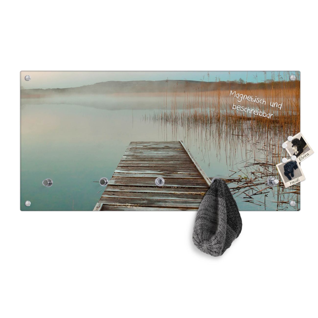 Bitte beachten Sie, dass an dieser Garderobe nur starke Neodym-Magnete halten! FUNKTION: Die banjado Wandgarderobe mit Motiv Alter Steg ist Ihr täglicher Begleiter. Zuverlässig hängen hier Ihre Jacken und Mäntel griffbereit. Gleichzeitig ist die Design Garderobe magnetisch, Sie können Notizen anheften und durch das Echtglas ist Ihr Paneel auch beschreibbar und wieder abwischbar. DESIGN: Sie erhalten eine Garderobenleiste aus elegantem Echtglas mit dem Farbbrillanten Motiv Alter Steg hinterklebt. Das Design ist zeitlos klassisch, ohne dabei auf Funktionalität zu verzichten. Suchen Sie aus einer Vielzahl von Motiven das für Ihre Einrichtung Passende aus. DETAILS: Die Flurgarderobe besteht aus 4mm gehärtetem Sicherheitsglas. Sie ist 80cm breit, 40cm hoch und 6cm tief. Die Garderobenhaken zur Selbstmontage präsentieren sich in Edelstahl-Optik, ebenso die Abstandshalter für die Wandmontage. Ihre neue Garderobe ist sofort einsatzbereit. NUTZEN: Ihre neue Garderobe hält nicht nur zuverlässig Ihre Kleidung, sie ist auch optisch ein Blickfang. Durch die magnetische Wirkung können Sie mit 4 beigefügten extrastarken Neodym-Magneten Notizen anheften und mit wasserlöslichen Kreidestiften oder Whiteboard-Markern auch Nachrichten hinterlassen. BANJADO: Wir sind ein kleines kreatives Team aus Sachsen und entwickeln Produkte die Design und Funktionalität verbinden sollen. Viel Freude mit Ihrer neuen Garderobe wünscht das banjado-Team!