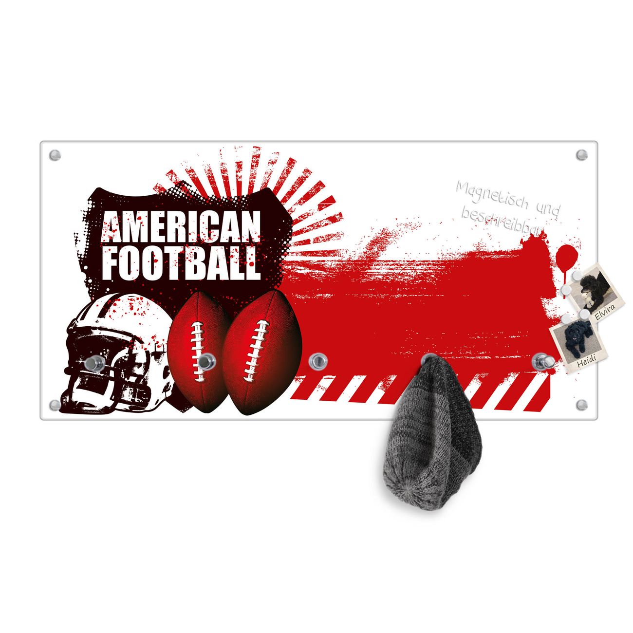 Bitte beachten Sie, dass an dieser Garderobe nur starke Neodym-Magnete halten! FUNKTION: Die banjado Wandgarderobe mit Motiv American Football ist Ihr täglicher Begleiter. Zuverlässig hängen hier Ihre Jacken und Mäntel griffbereit. Gleichzeitig ist die Design Garderobe magnetisch, Sie können Notizen anheften und durch das Echtglas ist Ihr Paneel auch beschreibbar und wieder abwischbar. DESIGN: Sie erhalten eine Garderobenleiste aus elegantem Echtglas mit dem Farbbrillanten Motiv American Football hinterklebt. Das Design ist zeitlos klassisch, ohne dabei auf Funktionalität zu verzichten. Suchen Sie aus einer Vielzahl von Motiven das für Ihre Einrichtung Passende aus. DETAILS: Die Flurgarderobe besteht aus 4mm gehärtetem Sicherheitsglas. Sie ist 80cm breit, 40cm hoch und 6cm tief. Die Garderobenhaken zur Selbstmontage präsentieren sich in Edelstahl-Optik, ebenso die Abstandshalter für die Wandmontage. Ihre neue Garderobe ist sofort einsatzbereit. NUTZEN: Ihre neue Garderobe hält nicht nur zuverlässig Ihre Kleidung, sie ist auch optisch ein Blickfang. Durch die magnetische Wirkung können Sie mit 4 beigefügten extrastarken Neodym-Magneten Notizen anheften und mit wasserlöslichen Kreidestiften oder Whiteboard-Markern auch Nachrichten hinterlassen. BANJADO: Wir sind ein kleines kreatives Team aus Sachsen und entwickeln Produkte die Design und Funktionalität verbinden sollen. Viel Freude mit Ihrer neuen Garderobe wünscht das banjado-Team!