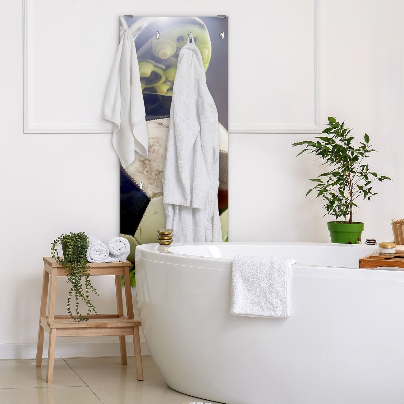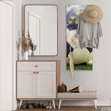 FUNKTION: Die banjado Wandgarderobe mit Motiv Anpfiff ist Ihr täglicher Begleiter. Zuverlässig hängen hier Ihre Jacken und Mäntel griffbereit. Das Echtglas ist Ihr Paneel auch beschreibbar und wieder abwischbar. DESIGN: Sie erhalten eine Garderobenleiste aus elegantem Echtglas mit dem Farbbrillanten Motiv Anpfiff hinterklebt. Das Design ist zeitlos klassisch, ohne dabei auf Funktionalität zu verzichten. Suchen Sie aus einer Vielzahl von Motiven das für Ihre Einrichtung Passende aus. DETAILS: Die Flurgarderobe besteht aus 4mm gehärtetem Sicherheitsglas. Sie ist 50cm breit, 125cm hoch und 6cm tief. Die Garderobenhaken zur Selbstmontage präsentieren sich in Edelstahl-Optik, ebenso die Abstandshalter für die Wandmontage. Ihre neue Garderobe ist sofort einsatzbereit. NUTZEN: Ihre neue Garderobe hält nicht nur zuverlässig Ihre Kleidung, sie ist auch optisch ein Blickfang. Durch das Glas können Sie an der Garderobe mit wasserlöslichen Kreidestiften oder Whiteboard-Markern auch Nachrichten hinterlassen. BANJADO: Wir sind ein kleines kreatives Team aus Sachsen und entwickeln Produkte die Design und Funktionalität verbinden sollen. Viel Freude mit Ihrer neuen Garderobe wünscht das banjado-Team!