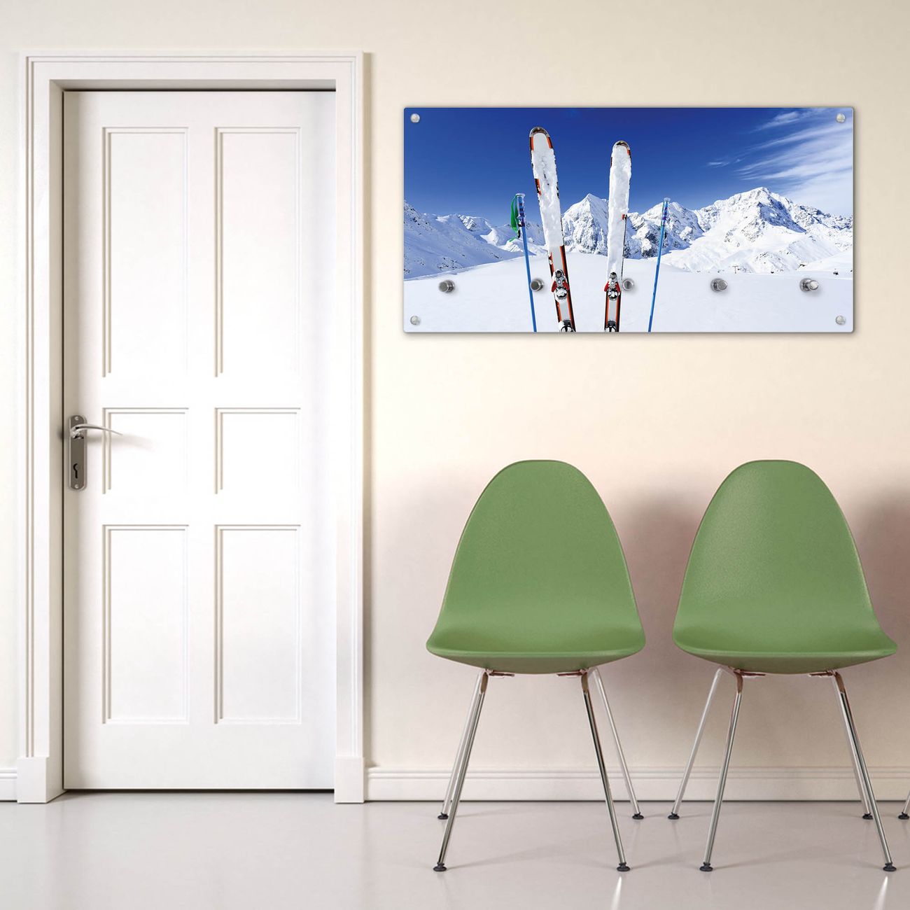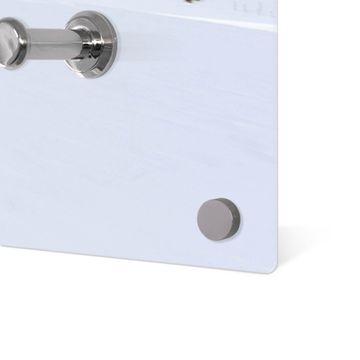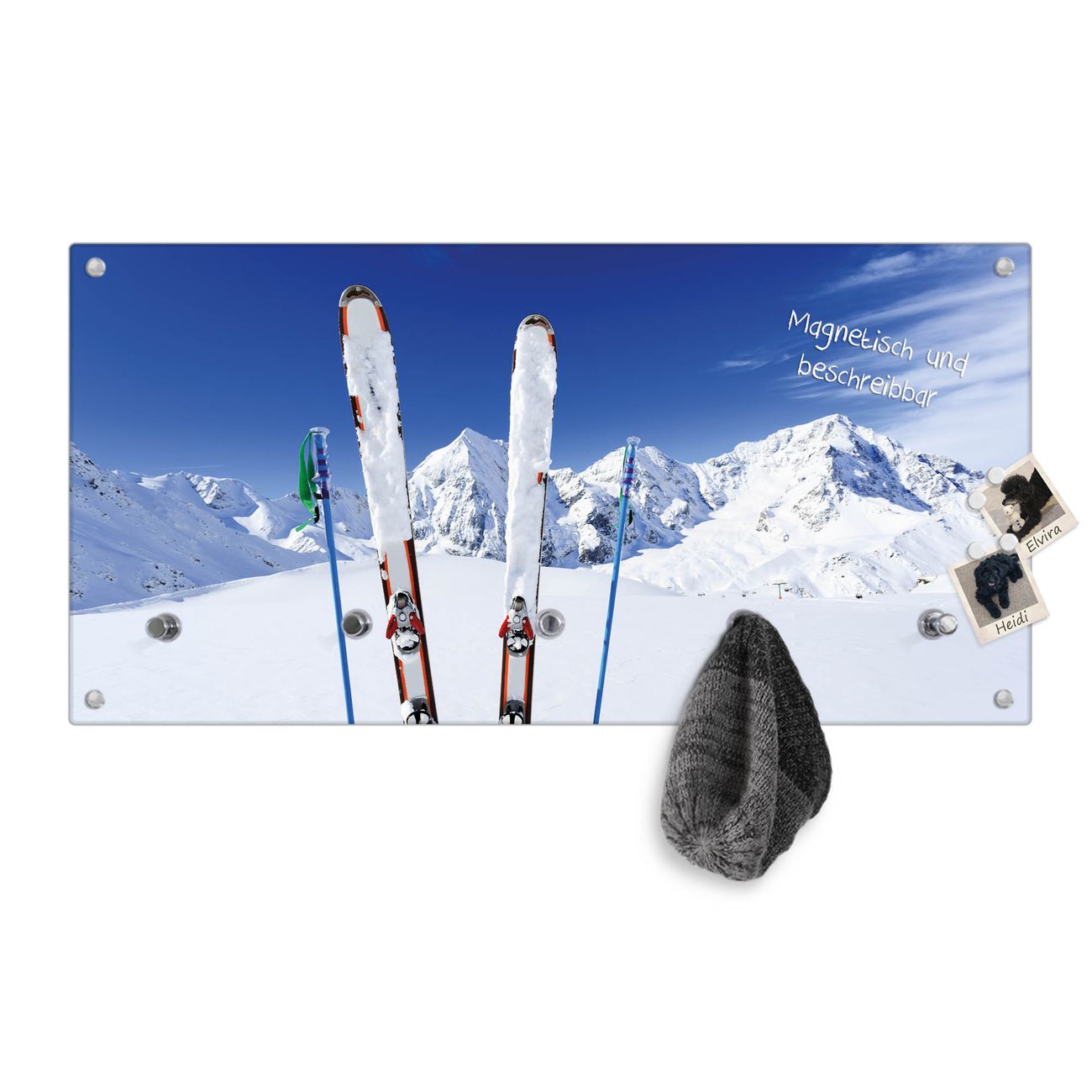 Bitte beachten Sie, dass an dieser Garderobe nur starke Neodym-Magnete halten! FUNKTION: Die banjado Wandgarderobe mit Motiv Apres Ski ist Ihr täglicher Begleiter. Zuverlässig hängen hier Ihre Jacken und Mäntel griffbereit. Gleichzeitig ist die Design Garderobe magnetisch, Sie können Notizen anheften und durch das Echtglas ist Ihr Paneel auch beschreibbar und wieder abwischbar. DESIGN: Sie erhalten eine Garderobenleiste aus elegantem Echtglas mit dem Farbbrillanten Motiv Apres Ski hinterklebt. Das Design ist zeitlos klassisch, ohne dabei auf Funktionalität zu verzichten. Suchen Sie aus einer Vielzahl von Motiven das für Ihre Einrichtung Passende aus. DETAILS: Die Flurgarderobe besteht aus 4mm gehärtetem Sicherheitsglas. Sie ist 80cm breit, 40cm hoch und 6cm tief. Die Garderobenhaken zur Selbstmontage präsentieren sich in Edelstahl-Optik, ebenso die Abstandshalter für die Wandmontage. Ihre neue Garderobe ist sofort einsatzbereit. NUTZEN: Ihre neue Garderobe hält nicht nur zuverlässig Ihre Kleidung, sie ist auch optisch ein Blickfang. Durch die magnetische Wirkung können Sie mit 4 beigefügten extrastarken Neodym-Magneten Notizen anheften und mit wasserlöslichen Kreidestiften oder Whiteboard-Markern auch Nachrichten hinterlassen. BANJADO: Wir sind ein kleines kreatives Team aus Sachsen und entwickeln Produkte die Design und Funktionalität verbinden sollen. Viel Freude mit Ihrer neuen Garderobe wünscht das banjado-Team!