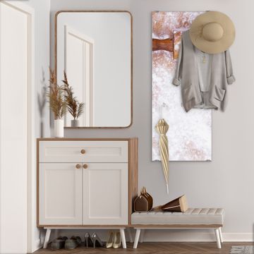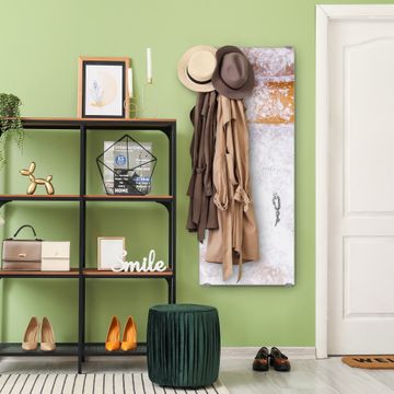 FUNKTION: Die banjado Wandgarderobe mit Motiv Backen ist Ihr täglicher Begleiter. Zuverlässig hängen hier Ihre Jacken und Mäntel griffbereit. Das Echtglas ist Ihr Paneel auch beschreibbar und wieder abwischbar. DESIGN: Sie erhalten eine Garderobenleiste aus elegantem Echtglas mit dem Farbbrillanten Motiv Backen hinterklebt. Das Design ist zeitlos klassisch, ohne dabei auf Funktionalität zu verzichten. Suchen Sie aus einer Vielzahl von Motiven das für Ihre Einrichtung Passende aus. DETAILS: Die Flurgarderobe besteht aus 4mm gehärtetem Sicherheitsglas. Sie ist 50cm breit, 125cm hoch und 6cm tief. Die Garderobenhaken zur Selbstmontage präsentieren sich in Edelstahl-Optik, ebenso die Abstandshalter für die Wandmontage. Ihre neue Garderobe ist sofort einsatzbereit. NUTZEN: Ihre neue Garderobe hält nicht nur zuverlässig Ihre Kleidung, sie ist auch optisch ein Blickfang. Durch das Glas können Sie an der Garderobe mit wasserlöslichen Kreidestiften oder Whiteboard-Markern auch Nachrichten hinterlassen. BANJADO: Wir sind ein kleines kreatives Team aus Sachsen und entwickeln Produkte die Design und Funktionalität verbinden sollen. Viel Freude mit Ihrer neuen Garderobe wünscht das banjado-Team!