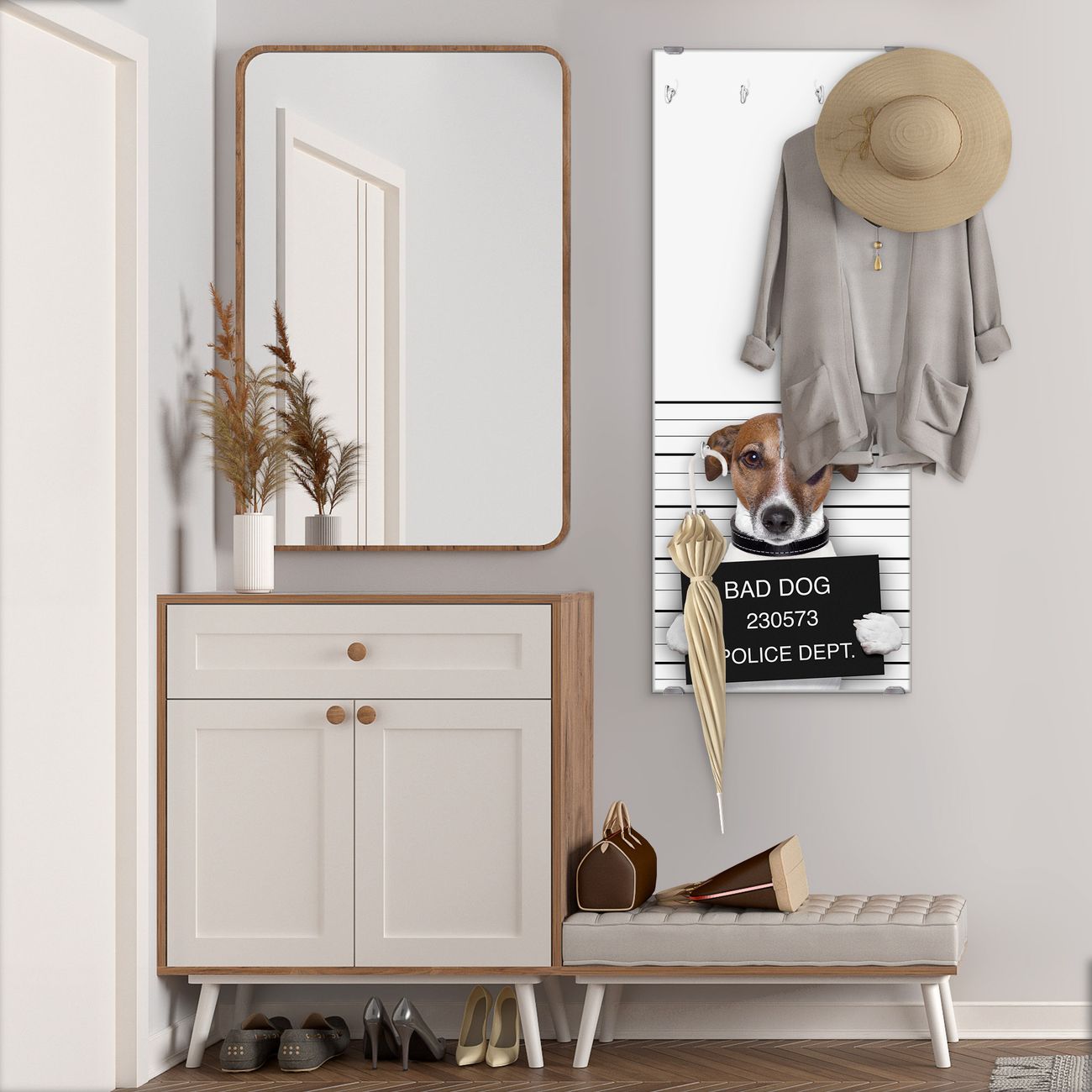 FUNKTION: Die banjado Wandgarderobe mit Motiv Bad Dog Jack Russel ist Ihr täglicher Begleiter. Zuverlässig hängen hier Ihre Jacken und Mäntel griffbereit. Das Echtglas ist Ihr Paneel auch beschreibbar und wieder abwischbar. DESIGN: Sie erhalten eine Garderobenleiste aus elegantem Echtglas mit dem Farbbrillanten Motiv Bad Dog Jack Russel hinterklebt. Das Design ist zeitlos klassisch, ohne dabei auf Funktionalität zu verzichten. Suchen Sie aus einer Vielzahl von Motiven das für Ihre Einrichtung Passende aus. DETAILS: Die Flurgarderobe besteht aus 4mm gehärtetem Sicherheitsglas. Sie ist 50cm breit, 125cm hoch und 6cm tief. Die Garderobenhaken zur Selbstmontage präsentieren sich in Edelstahl-Optik, ebenso die Abstandshalter für die Wandmontage. Ihre neue Garderobe ist sofort einsatzbereit. NUTZEN: Ihre neue Garderobe hält nicht nur zuverlässig Ihre Kleidung, sie ist auch optisch ein Blickfang. Durch das Glas können Sie an der Garderobe mit wasserlöslichen Kreidestiften oder Whiteboard-Markern auch Nachrichten hinterlassen. BANJADO: Wir sind ein kleines kreatives Team aus Sachsen und entwickeln Produkte die Design und Funktionalität verbinden sollen. Viel Freude mit Ihrer neuen Garderobe wünscht das banjado-Team!