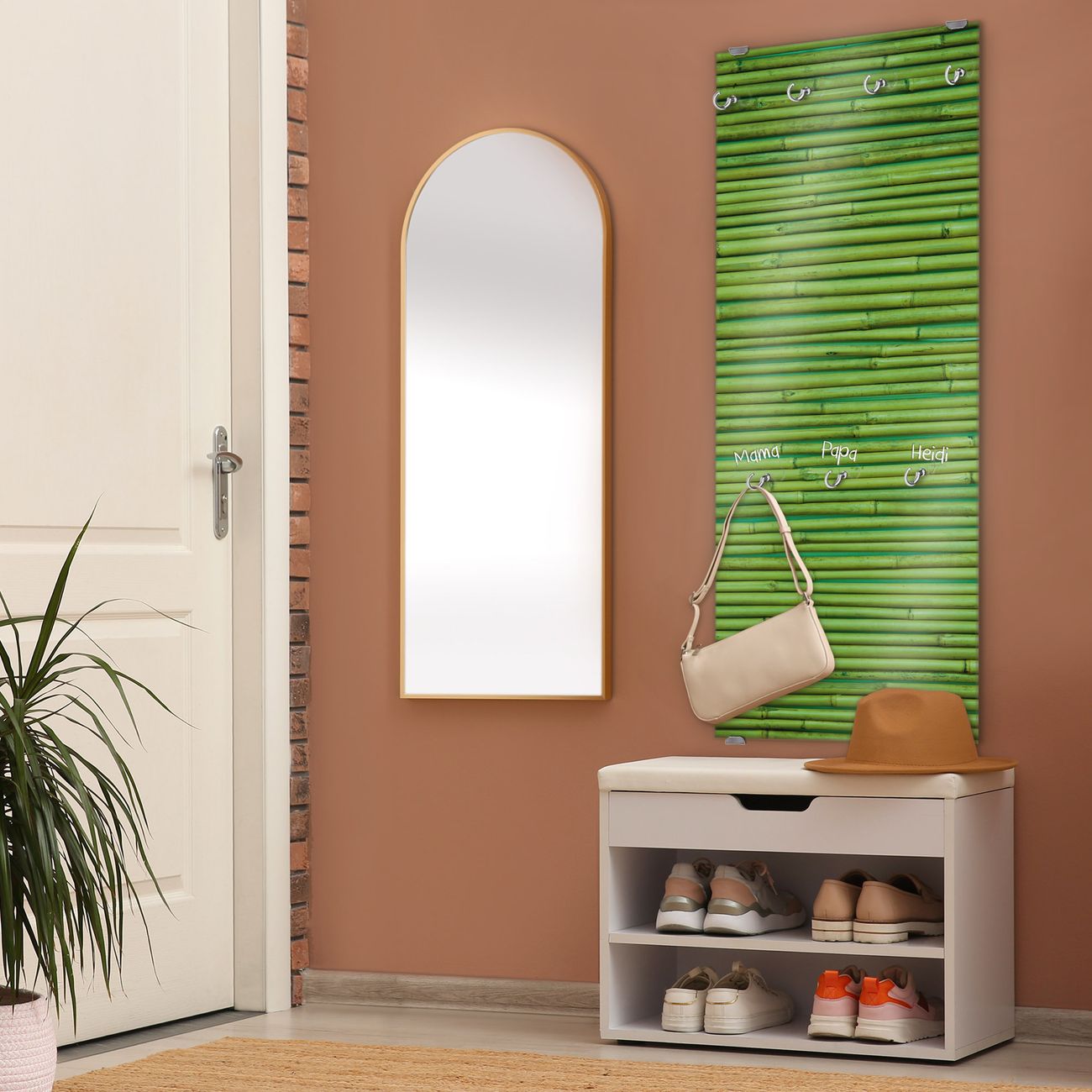 FUNKTION: Die banjado Wandgarderobe mit Motiv Bambus Grün ist Ihr täglicher Begleiter. Zuverlässig hängen hier Ihre Jacken und Mäntel griffbereit. Das Echtglas ist Ihr Paneel auch beschreibbar und wieder abwischbar. DESIGN: Sie erhalten eine Garderobenleiste aus elegantem Echtglas mit dem Farbbrillanten Motiv Bambus Grün hinterklebt. Das Design ist zeitlos klassisch, ohne dabei auf Funktionalität zu verzichten. Suchen Sie aus einer Vielzahl von Motiven das für Ihre Einrichtung Passende aus. DETAILS: Die Flurgarderobe besteht aus 4mm gehärtetem Sicherheitsglas. Sie ist 50cm breit, 125cm hoch und 6cm tief. Die Garderobenhaken zur Selbstmontage präsentieren sich in Edelstahl-Optik, ebenso die Abstandshalter für die Wandmontage. Ihre neue Garderobe ist sofort einsatzbereit. NUTZEN: Ihre neue Garderobe hält nicht nur zuverlässig Ihre Kleidung, sie ist auch optisch ein Blickfang. Durch das Glas können Sie an der Garderobe mit wasserlöslichen Kreidestiften oder Whiteboard-Markern auch Nachrichten hinterlassen. BANJADO: Wir sind ein kleines kreatives Team aus Sachsen und entwickeln Produkte die Design und Funktionalität verbinden sollen. Viel Freude mit Ihrer neuen Garderobe wünscht das banjado-Team!