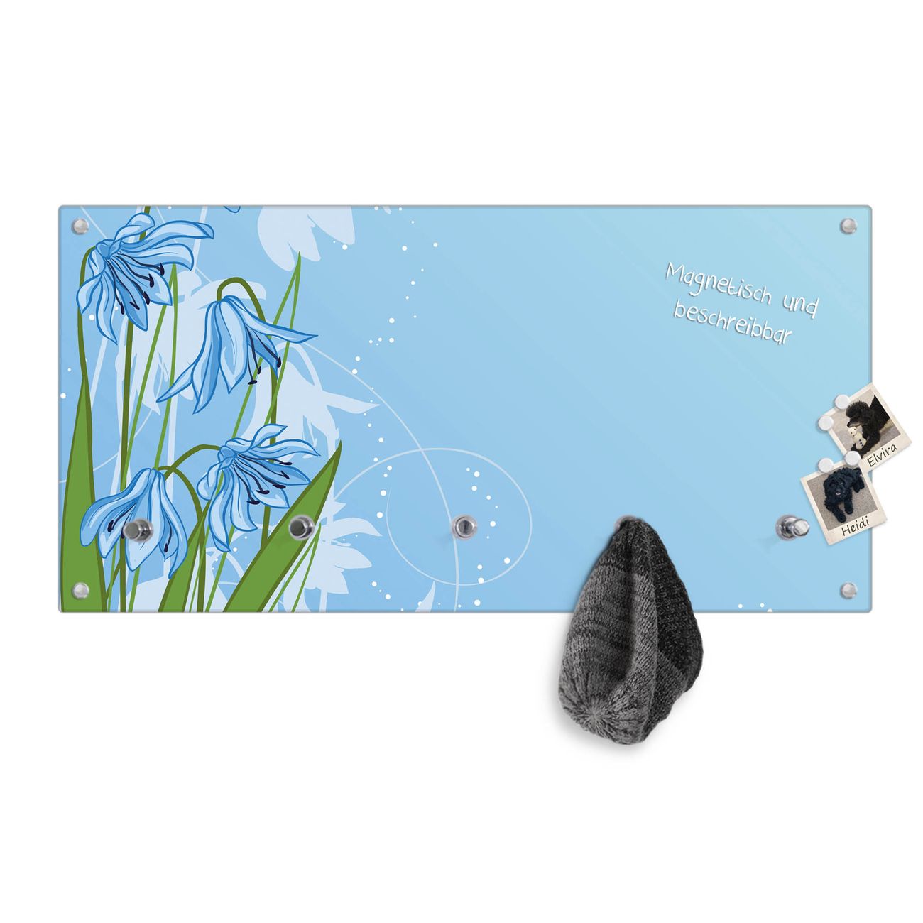 Bitte beachten Sie, dass an dieser Garderobe nur starke Neodym-Magnete halten! FUNKTION: Die banjado Wandgarderobe mit Motiv Bergblaulilie ist Ihr täglicher Begleiter. Zuverlässig hängen hier Ihre Jacken und Mäntel griffbereit. Gleichzeitig ist die Design Garderobe magnetisch, Sie können Notizen anheften und durch das Echtglas ist Ihr Paneel auch beschreibbar und wieder abwischbar. DESIGN: Sie erhalten eine Garderobenleiste aus elegantem Echtglas mit dem Farbbrillanten Motiv Bergblaulilie hinterklebt. Das Design ist zeitlos klassisch, ohne dabei auf Funktionalität zu verzichten. Suchen Sie aus einer Vielzahl von Motiven das für Ihre Einrichtung Passende aus. DETAILS: Die Flurgarderobe besteht aus 4mm gehärtetem Sicherheitsglas. Sie ist 80cm breit, 40cm hoch und 6cm tief. Die Garderobenhaken zur Selbstmontage präsentieren sich in Edelstahl-Optik, ebenso die Abstandshalter für die Wandmontage. Ihre neue Garderobe ist sofort einsatzbereit. NUTZEN: Ihre neue Garderobe hält nicht nur zuverlässig Ihre Kleidung, sie ist auch optisch ein Blickfang. Durch die magnetische Wirkung können Sie mit 4 beigefügten extrastarken Neodym-Magneten Notizen anheften und mit wasserlöslichen Kreidestiften oder Whiteboard-Markern auch Nachrichten hinterlassen. BANJADO: Wir sind ein kleines kreatives Team aus Sachsen und entwickeln Produkte die Design und Funktionalität verbinden sollen. Viel Freude mit Ihrer neuen Garderobe wünscht das banjado-Team!