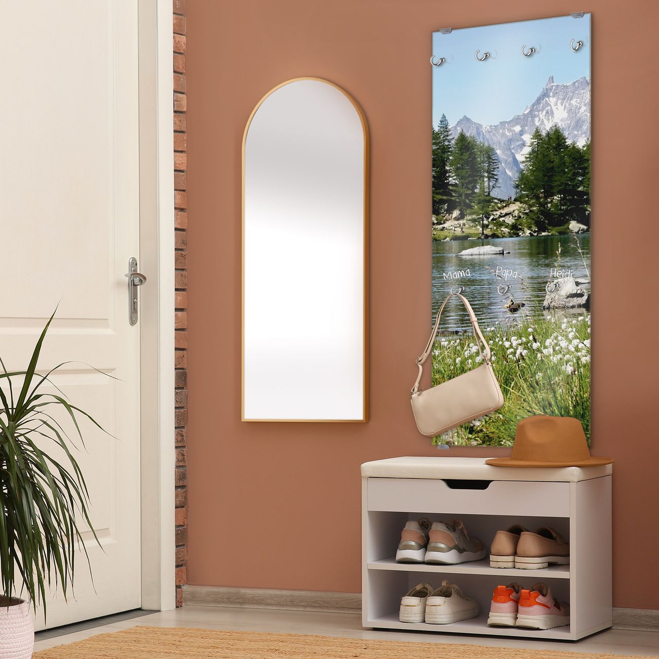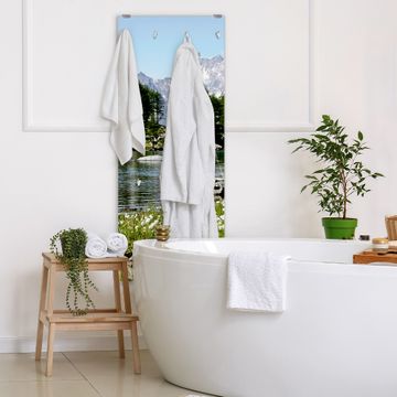 FUNKTION: Die banjado Wandgarderobe mit Motiv Bergidylle ist Ihr täglicher Begleiter. Zuverlässig hängen hier Ihre Jacken und Mäntel griffbereit. Das Echtglas ist Ihr Paneel auch beschreibbar und wieder abwischbar. DESIGN: Sie erhalten eine Garderobenleiste aus elegantem Echtglas mit dem Farbbrillanten Motiv Bergidylle hinterklebt. Das Design ist zeitlos klassisch, ohne dabei auf Funktionalität zu verzichten. Suchen Sie aus einer Vielzahl von Motiven das für Ihre Einrichtung Passende aus. DETAILS: Die Flurgarderobe besteht aus 4mm gehärtetem Sicherheitsglas. Sie ist 50cm breit, 125cm hoch und 6cm tief. Die Garderobenhaken zur Selbstmontage präsentieren sich in Edelstahl-Optik, ebenso die Abstandshalter für die Wandmontage. Ihre neue Garderobe ist sofort einsatzbereit. NUTZEN: Ihre neue Garderobe hält nicht nur zuverlässig Ihre Kleidung, sie ist auch optisch ein Blickfang. Durch das Glas können Sie an der Garderobe mit wasserlöslichen Kreidestiften oder Whiteboard-Markern auch Nachrichten hinterlassen. BANJADO: Wir sind ein kleines kreatives Team aus Sachsen und entwickeln Produkte die Design und Funktionalität verbinden sollen. Viel Freude mit Ihrer neuen Garderobe wünscht das banjado-Team!