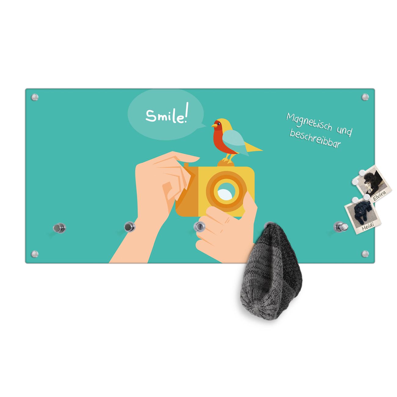 Bitte beachten Sie, dass an dieser Garderobe nur starke Neodym-Magnete halten! FUNKTION: Die banjado Wandgarderobe mit Motiv Bitte Lächeln 2 ist Ihr täglicher Begleiter. Zuverlässig hängen hier Ihre Jacken und Mäntel griffbereit. Gleichzeitig ist die Design Garderobe magnetisch, Sie können Notizen anheften und durch das Echtglas ist Ihr Paneel auch beschreibbar und wieder abwischbar. DESIGN: Sie erhalten eine Garderobenleiste aus elegantem Echtglas mit dem Farbbrillanten Motiv Bitte Lächeln 2 hinterklebt. Das Design ist zeitlos klassisch, ohne dabei auf Funktionalität zu verzichten. Suchen Sie aus einer Vielzahl von Motiven das für Ihre Einrichtung Passende aus. DETAILS: Die Flurgarderobe besteht aus 4mm gehärtetem Sicherheitsglas. Sie ist 80cm breit, 40cm hoch und 6cm tief. Die Garderobenhaken zur Selbstmontage präsentieren sich in Edelstahl-Optik, ebenso die Abstandshalter für die Wandmontage. Ihre neue Garderobe ist sofort einsatzbereit. NUTZEN: Ihre neue Garderobe hält nicht nur zuverlässig Ihre Kleidung, sie ist auch optisch ein Blickfang. Durch die magnetische Wirkung können Sie mit 4 beigefügten extrastarken Neodym-Magneten Notizen anheften und mit wasserlöslichen Kreidestiften oder Whiteboard-Markern auch Nachrichten hinterlassen. BANJADO: Wir sind ein kleines kreatives Team aus Sachsen und entwickeln Produkte die Design und Funktionalität verbinden sollen. Viel Freude mit Ihrer neuen Garderobe wünscht das banjado-Team!