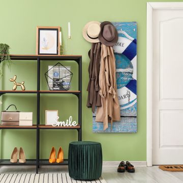 FUNKTION: Die banjado Wandgarderobe mit Motiv Blauer Rettungsring ist Ihr täglicher Begleiter. Zuverlässig hängen hier Ihre Jacken und Mäntel griffbereit. Das Echtglas ist Ihr Paneel auch beschreibbar und wieder abwischbar. DESIGN: Sie erhalten eine Garderobenleiste aus elegantem Echtglas mit dem Farbbrillanten Motiv Blauer Rettungsring hinterklebt. Das Design ist zeitlos klassisch, ohne dabei auf Funktionalität zu verzichten. Suchen Sie aus einer Vielzahl von Motiven das für Ihre Einrichtung Passende aus. DETAILS: Die Flurgarderobe besteht aus 4mm gehärtetem Sicherheitsglas. Sie ist 50cm breit, 125cm hoch und 6cm tief. Die Garderobenhaken zur Selbstmontage präsentieren sich in Edelstahl-Optik, ebenso die Abstandshalter für die Wandmontage. Ihre neue Garderobe ist sofort einsatzbereit. NUTZEN: Ihre neue Garderobe hält nicht nur zuverlässig Ihre Kleidung, sie ist auch optisch ein Blickfang. Durch das Glas können Sie an der Garderobe mit wasserlöslichen Kreidestiften oder Whiteboard-Markern auch Nachrichten hinterlassen. BANJADO: Wir sind ein kleines kreatives Team aus Sachsen und entwickeln Produkte die Design und Funktionalität verbinden sollen. Viel Freude mit Ihrer neuen Garderobe wünscht das banjado-Team!