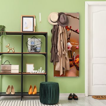 FUNKTION: Die banjado Wandgarderobe mit Motiv Blühender Kirschzweig ist Ihr täglicher Begleiter. Zuverlässig hängen hier Ihre Jacken und Mäntel griffbereit. Das Echtglas ist Ihr Paneel auch beschreibbar und wieder abwischbar. DESIGN: Sie erhalten eine Garderobenleiste aus elegantem Echtglas mit dem Farbbrillanten Motiv Blühender Kirschzweig hinterklebt. Das Design ist zeitlos klassisch, ohne dabei auf Funktionalität zu verzichten. Suchen Sie aus einer Vielzahl von Motiven das für Ihre Einrichtung Passende aus. DETAILS: Die Flurgarderobe besteht aus 4mm gehärtetem Sicherheitsglas. Sie ist 50cm breit, 125cm hoch und 6cm tief. Die Garderobenhaken zur Selbstmontage präsentieren sich in Edelstahl-Optik, ebenso die Abstandshalter für die Wandmontage. Ihre neue Garderobe ist sofort einsatzbereit. NUTZEN: Ihre neue Garderobe hält nicht nur zuverlässig Ihre Kleidung, sie ist auch optisch ein Blickfang. Durch das Glas können Sie an der Garderobe mit wasserlöslichen Kreidestiften oder Whiteboard-Markern auch Nachrichten hinterlassen. BANJADO: Wir sind ein kleines kreatives Team aus Sachsen und entwickeln Produkte die Design und Funktionalität verbinden sollen. Viel Freude mit Ihrer neuen Garderobe wünscht das banjado-Team!