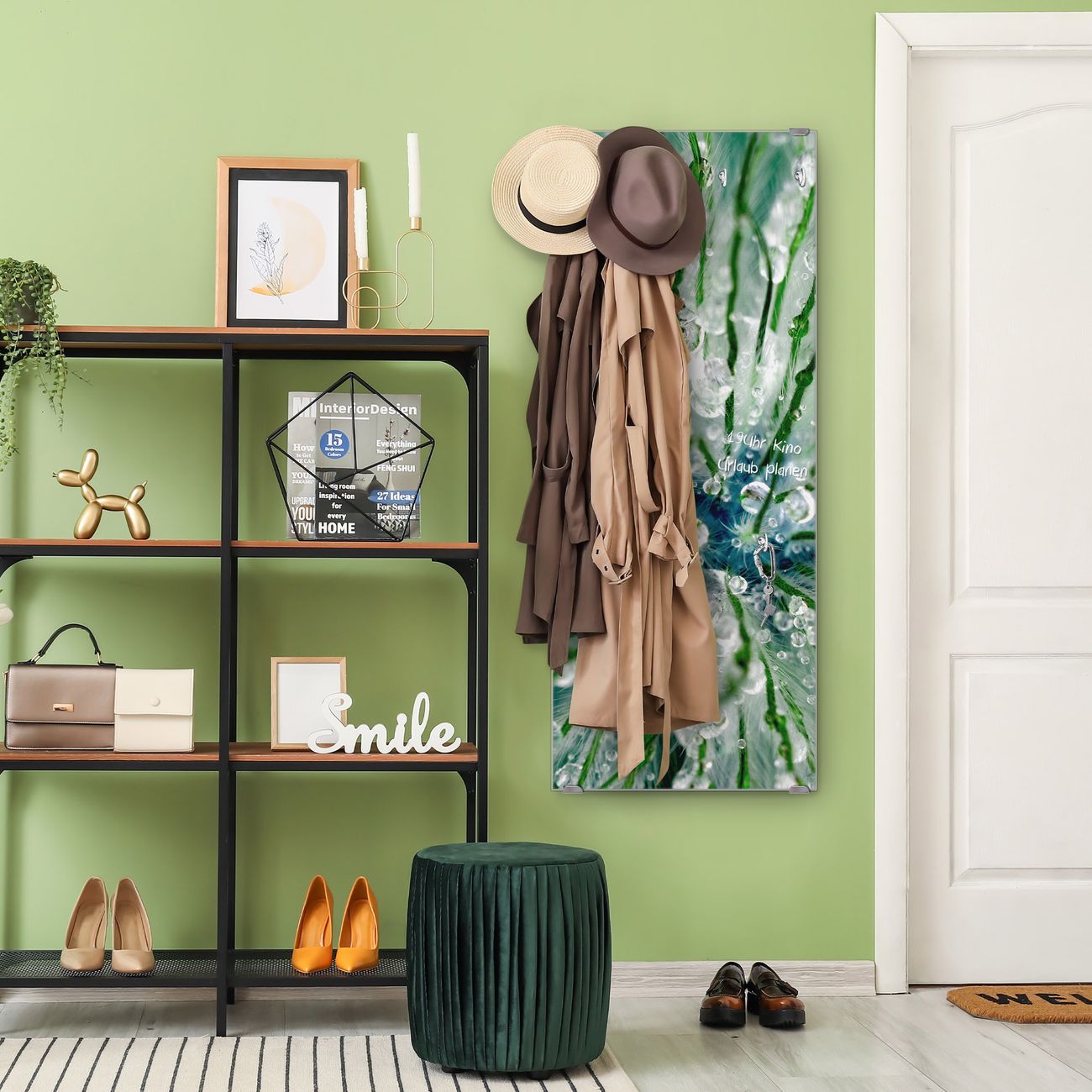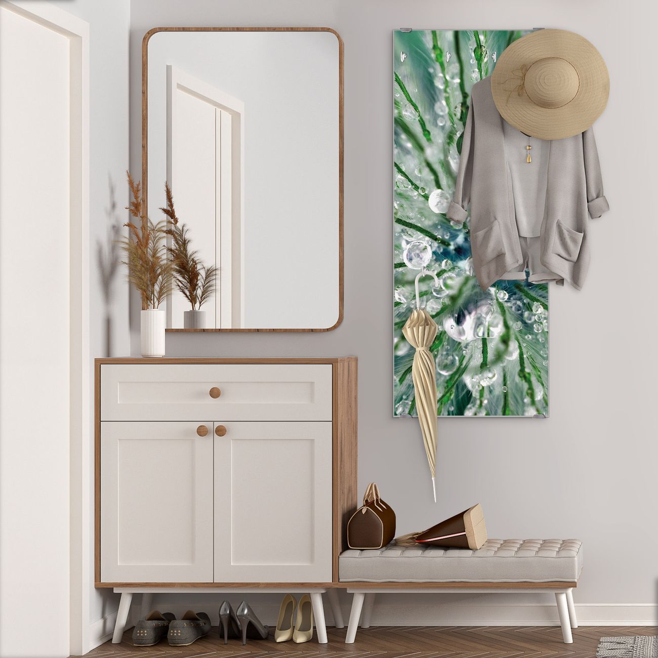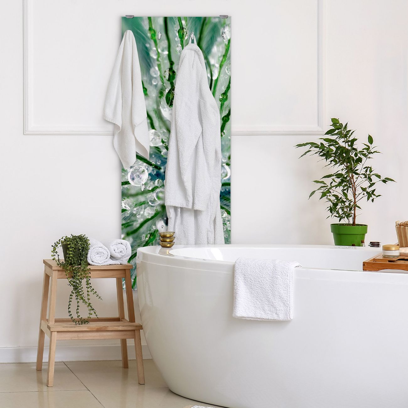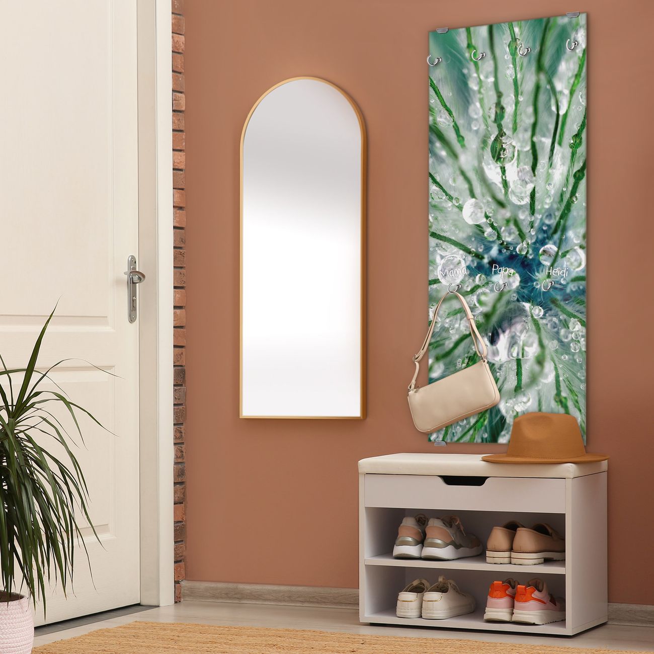 FUNKTION: Die banjado Wandgarderobe mit Motiv Blüte Mit Tautropfen ist Ihr täglicher Begleiter. Zuverlässig hängen hier Ihre Jacken und Mäntel griffbereit. Das Echtglas ist Ihr Paneel auch beschreibbar und wieder abwischbar. DESIGN: Sie erhalten eine Garderobenleiste aus elegantem Echtglas mit dem Farbbrillanten Motiv Blüte Mit Tautropfen hinterklebt. Das Design ist zeitlos klassisch, ohne dabei auf Funktionalität zu verzichten. Suchen Sie aus einer Vielzahl von Motiven das für Ihre Einrichtung Passende aus. DETAILS: Die Flurgarderobe besteht aus 4mm gehärtetem Sicherheitsglas. Sie ist 50cm breit, 125cm hoch und 6cm tief. Die Garderobenhaken zur Selbstmontage präsentieren sich in Edelstahl-Optik, ebenso die Abstandshalter für die Wandmontage. Ihre neue Garderobe ist sofort einsatzbereit. NUTZEN: Ihre neue Garderobe hält nicht nur zuverlässig Ihre Kleidung, sie ist auch optisch ein Blickfang. Durch das Glas können Sie an der Garderobe mit wasserlöslichen Kreidestiften oder Whiteboard-Markern auch Nachrichten hinterlassen. BANJADO: Wir sind ein kleines kreatives Team aus Sachsen und entwickeln Produkte die Design und Funktionalität verbinden sollen. Viel Freude mit Ihrer neuen Garderobe wünscht das banjado-Team!