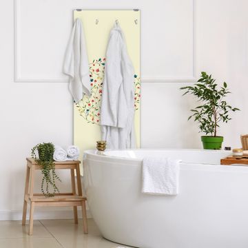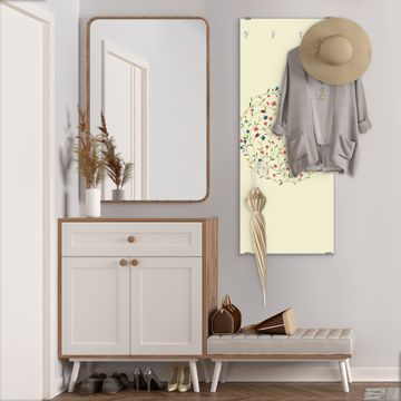 FUNKTION: Die banjado Wandgarderobe mit Motiv Blumenreigen ist Ihr täglicher Begleiter. Zuverlässig hängen hier Ihre Jacken und Mäntel griffbereit. Das Echtglas ist Ihr Paneel auch beschreibbar und wieder abwischbar. DESIGN: Sie erhalten eine Garderobenleiste aus elegantem Echtglas mit dem Farbbrillanten Motiv Blumenreigen hinterklebt. Das Design ist zeitlos klassisch, ohne dabei auf Funktionalität zu verzichten. Suchen Sie aus einer Vielzahl von Motiven das für Ihre Einrichtung Passende aus. DETAILS: Die Flurgarderobe besteht aus 4mm gehärtetem Sicherheitsglas. Sie ist 50cm breit, 125cm hoch und 6cm tief. Die Garderobenhaken zur Selbstmontage präsentieren sich in Edelstahl-Optik, ebenso die Abstandshalter für die Wandmontage. Ihre neue Garderobe ist sofort einsatzbereit. NUTZEN: Ihre neue Garderobe hält nicht nur zuverlässig Ihre Kleidung, sie ist auch optisch ein Blickfang. Durch das Glas können Sie an der Garderobe mit wasserlöslichen Kreidestiften oder Whiteboard-Markern auch Nachrichten hinterlassen. BANJADO: Wir sind ein kleines kreatives Team aus Sachsen und entwickeln Produkte die Design und Funktionalität verbinden sollen. Viel Freude mit Ihrer neuen Garderobe wünscht das banjado-Team!