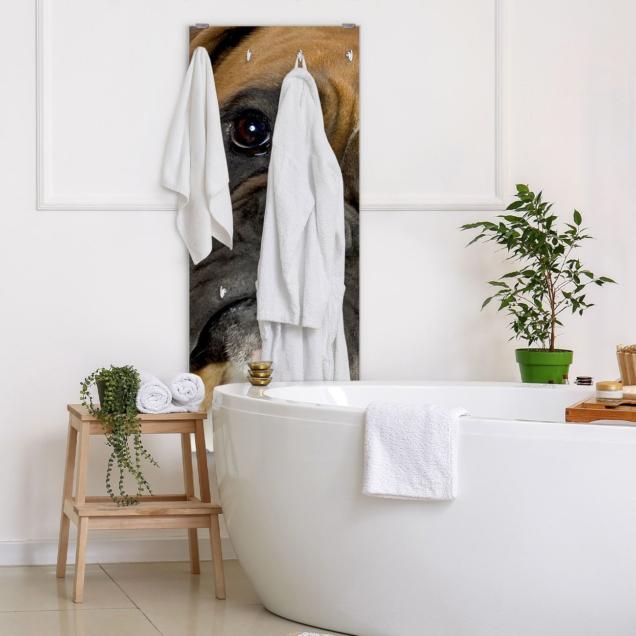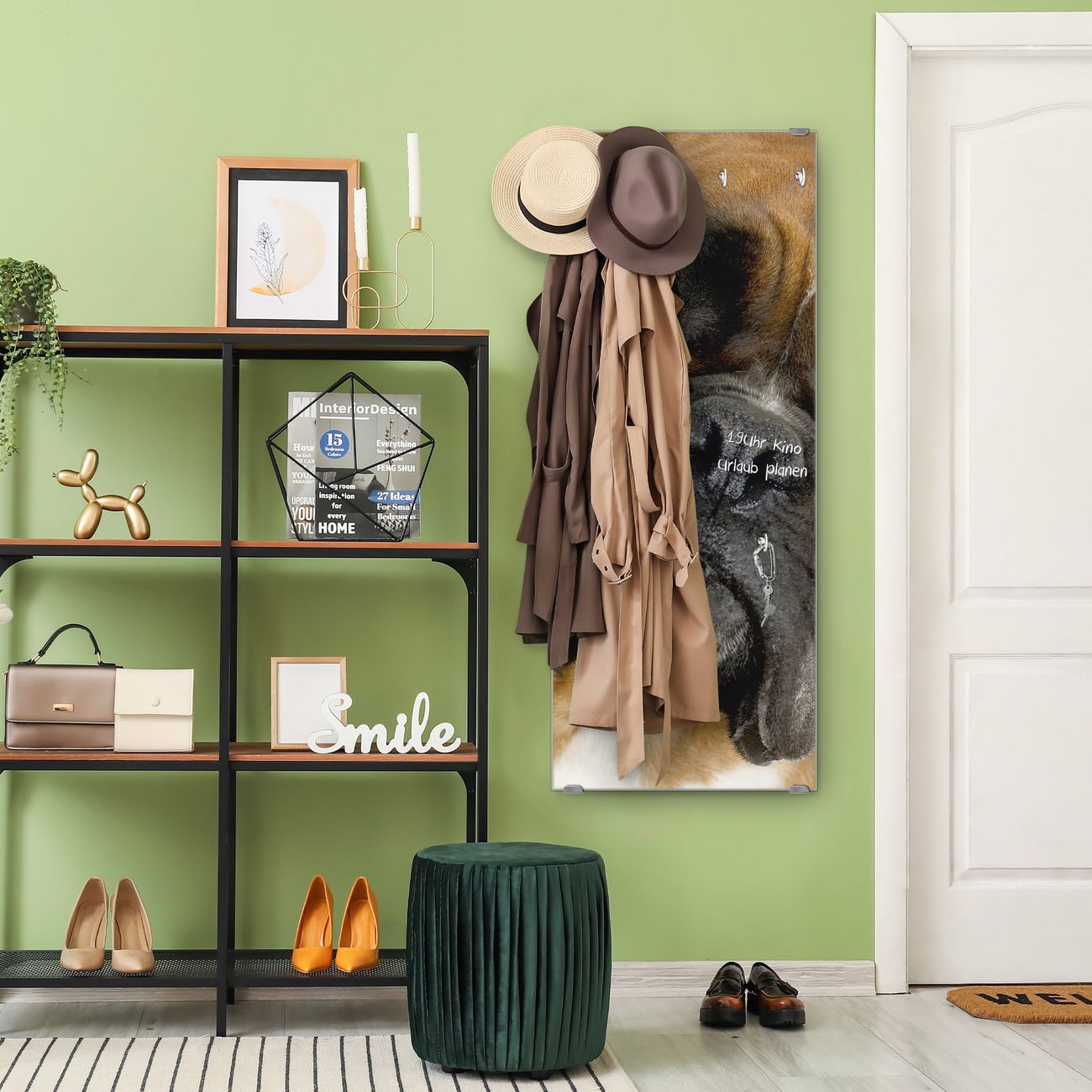 FUNKTION: Die banjado Wandgarderobe mit Motiv Boxer ist Ihr täglicher Begleiter. Zuverlässig hängen hier Ihre Jacken und Mäntel griffbereit. Das Echtglas ist Ihr Paneel auch beschreibbar und wieder abwischbar. DESIGN: Sie erhalten eine Garderobenleiste aus elegantem Echtglas mit dem Farbbrillanten Motiv Boxer hinterklebt. Das Design ist zeitlos klassisch, ohne dabei auf Funktionalität zu verzichten. Suchen Sie aus einer Vielzahl von Motiven das für Ihre Einrichtung Passende aus. DETAILS: Die Flurgarderobe besteht aus 4mm gehärtetem Sicherheitsglas. Sie ist 50cm breit, 125cm hoch und 6cm tief. Die Garderobenhaken zur Selbstmontage präsentieren sich in Edelstahl-Optik, ebenso die Abstandshalter für die Wandmontage. Ihre neue Garderobe ist sofort einsatzbereit. NUTZEN: Ihre neue Garderobe hält nicht nur zuverlässig Ihre Kleidung, sie ist auch optisch ein Blickfang. Durch das Glas können Sie an der Garderobe mit wasserlöslichen Kreidestiften oder Whiteboard-Markern auch Nachrichten hinterlassen. BANJADO: Wir sind ein kleines kreatives Team aus Sachsen und entwickeln Produkte die Design und Funktionalität verbinden sollen. Viel Freude mit Ihrer neuen Garderobe wünscht das banjado-Team!