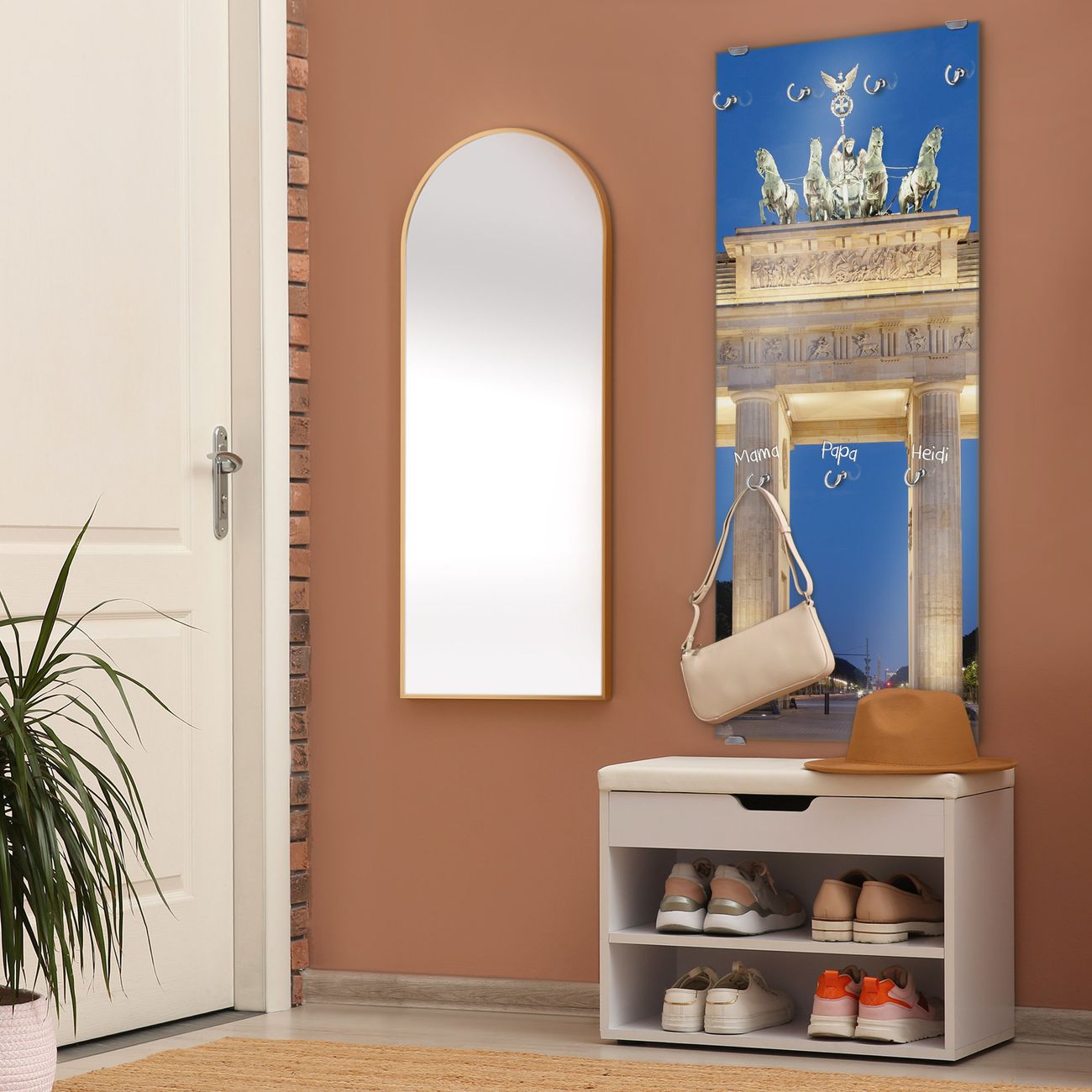 FUNKTION: Die banjado Wandgarderobe mit Motiv Brandenburger Tor 2 ist Ihr täglicher Begleiter. Zuverlässig hängen hier Ihre Jacken und Mäntel griffbereit. Das Echtglas ist Ihr Paneel auch beschreibbar und wieder abwischbar. DESIGN: Sie erhalten eine Garderobenleiste aus elegantem Echtglas mit dem Farbbrillanten Motiv Brandenburger Tor 2 hinterklebt. Das Design ist zeitlos klassisch, ohne dabei auf Funktionalität zu verzichten. Suchen Sie aus einer Vielzahl von Motiven das für Ihre Einrichtung Passende aus. DETAILS: Die Flurgarderobe besteht aus 4mm gehärtetem Sicherheitsglas. Sie ist 50cm breit, 125cm hoch und 6cm tief. Die Garderobenhaken zur Selbstmontage präsentieren sich in Edelstahl-Optik, ebenso die Abstandshalter für die Wandmontage. Ihre neue Garderobe ist sofort einsatzbereit. NUTZEN: Ihre neue Garderobe hält nicht nur zuverlässig Ihre Kleidung, sie ist auch optisch ein Blickfang. Durch das Glas können Sie an der Garderobe mit wasserlöslichen Kreidestiften oder Whiteboard-Markern auch Nachrichten hinterlassen. BANJADO: Wir sind ein kleines kreatives Team aus Sachsen und entwickeln Produkte die Design und Funktionalität verbinden sollen. Viel Freude mit Ihrer neuen Garderobe wünscht das banjado-Team!