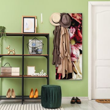 FUNKTION: Die banjado Wandgarderobe mit Motiv Brautstrauss ist Ihr täglicher Begleiter. Zuverlässig hängen hier Ihre Jacken und Mäntel griffbereit. Das Echtglas ist Ihr Paneel auch beschreibbar und wieder abwischbar. DESIGN: Sie erhalten eine Garderobenleiste aus elegantem Echtglas mit dem Farbbrillanten Motiv Brautstrauss hinterklebt. Das Design ist zeitlos klassisch, ohne dabei auf Funktionalität zu verzichten. Suchen Sie aus einer Vielzahl von Motiven das für Ihre Einrichtung Passende aus. DETAILS: Die Flurgarderobe besteht aus 4mm gehärtetem Sicherheitsglas. Sie ist 50cm breit, 125cm hoch und 6cm tief. Die Garderobenhaken zur Selbstmontage präsentieren sich in Edelstahl-Optik, ebenso die Abstandshalter für die Wandmontage. Ihre neue Garderobe ist sofort einsatzbereit. NUTZEN: Ihre neue Garderobe hält nicht nur zuverlässig Ihre Kleidung, sie ist auch optisch ein Blickfang. Durch das Glas können Sie an der Garderobe mit wasserlöslichen Kreidestiften oder Whiteboard-Markern auch Nachrichten hinterlassen. BANJADO: Wir sind ein kleines kreatives Team aus Sachsen und entwickeln Produkte die Design und Funktionalität verbinden sollen. Viel Freude mit Ihrer neuen Garderobe wünscht das banjado-Team!