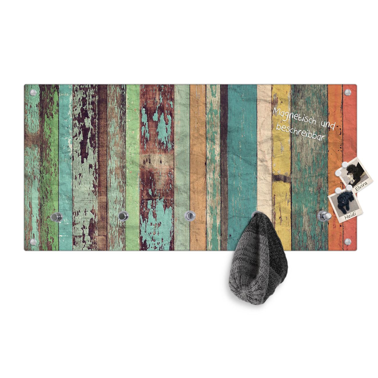 Bitte beachten Sie, dass an dieser Garderobe nur starke Neodym-Magnete halten! FUNKTION: Die banjado Wandgarderobe mit Motiv Bunte Bretterwand ist Ihr täglicher Begleiter. Zuverlässig hängen hier Ihre Jacken und Mäntel griffbereit. Gleichzeitig ist die Design Garderobe magnetisch, Sie können Notizen anheften und durch das Echtglas ist Ihr Paneel auch beschreibbar und wieder abwischbar. DESIGN: Sie erhalten eine Garderobenleiste aus elegantem Echtglas mit dem Farbbrillanten Motiv Bunte Bretterwand hinterklebt. Das Design ist zeitlos klassisch, ohne dabei auf Funktionalität zu verzichten. Suchen Sie aus einer Vielzahl von Motiven das für Ihre Einrichtung Passende aus. DETAILS: Die Flurgarderobe besteht aus 4mm gehärtetem Sicherheitsglas. Sie ist 80cm breit, 40cm hoch und 6cm tief. Die Garderobenhaken zur Selbstmontage präsentieren sich in Edelstahl-Optik, ebenso die Abstandshalter für die Wandmontage. Ihre neue Garderobe ist sofort einsatzbereit. NUTZEN: Ihre neue Garderobe hält nicht nur zuverlässig Ihre Kleidung, sie ist auch optisch ein Blickfang. Durch die magnetische Wirkung können Sie mit 4 beigefügten extrastarken Neodym-Magneten Notizen anheften und mit wasserlöslichen Kreidestiften oder Whiteboard-Markern auch Nachrichten hinterlassen. BANJADO: Wir sind ein kleines kreatives Team aus Sachsen und entwickeln Produkte die Design und Funktionalität verbinden sollen. Viel Freude mit Ihrer neuen Garderobe wünscht das banjado-Team!