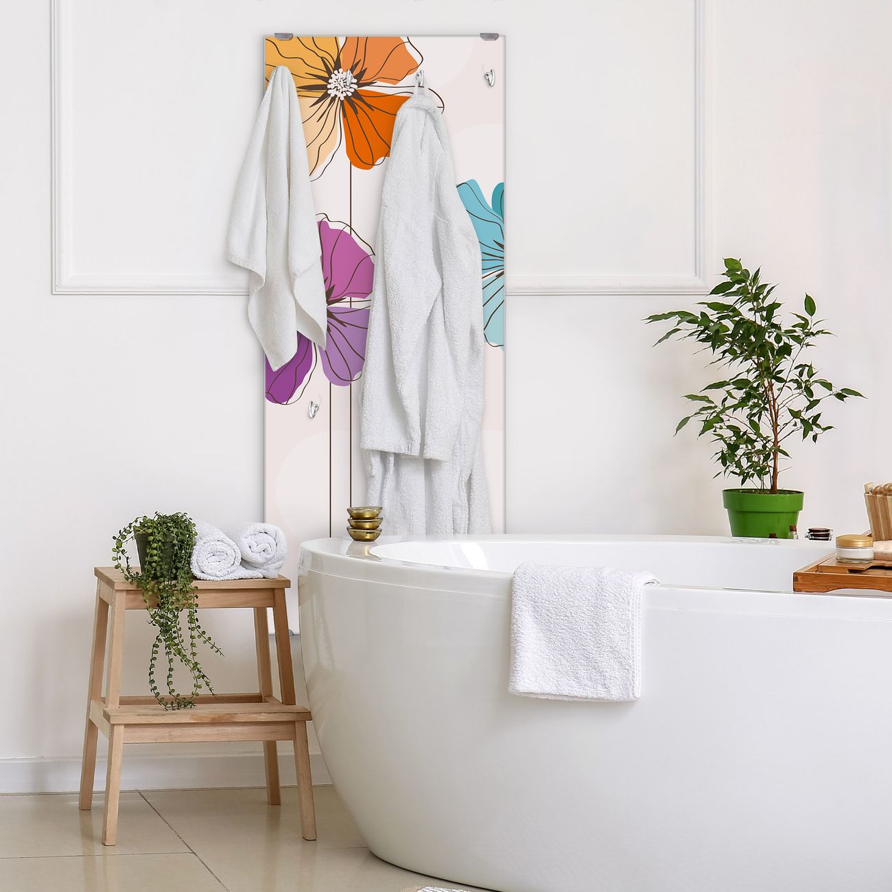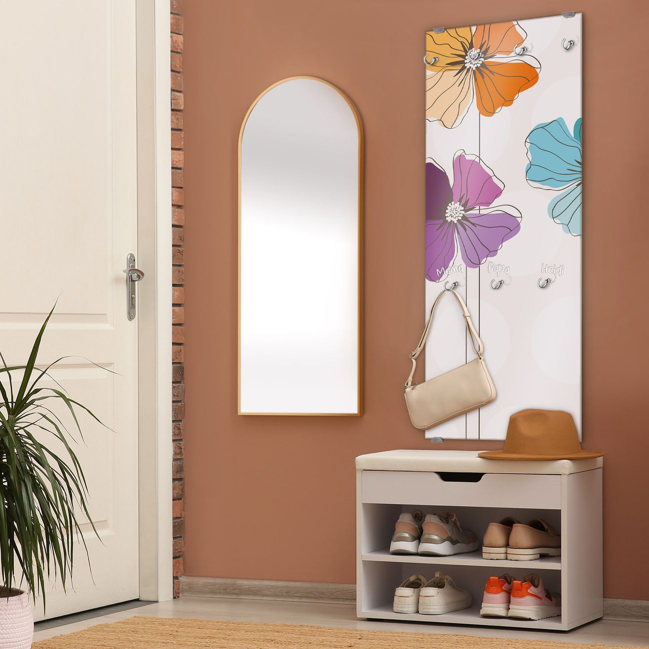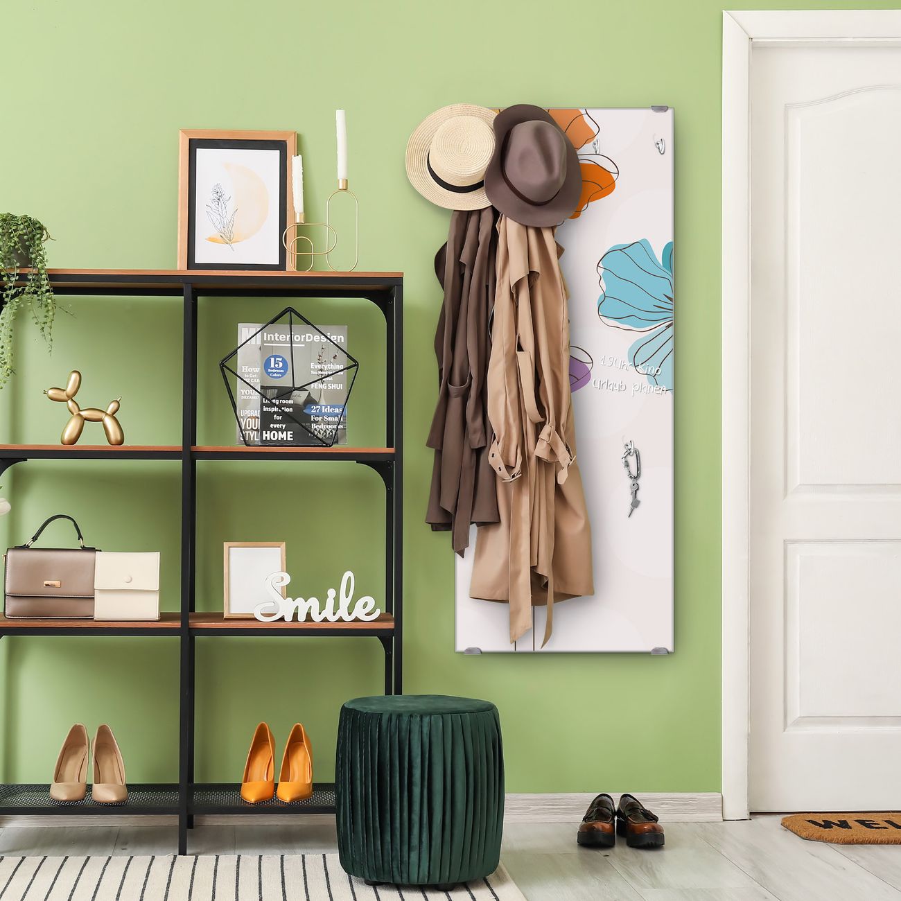 FUNKTION: Die banjado Wandgarderobe mit Motiv Bunter Mohn ist Ihr täglicher Begleiter. Zuverlässig hängen hier Ihre Jacken und Mäntel griffbereit. Das Echtglas ist Ihr Paneel auch beschreibbar und wieder abwischbar. DESIGN: Sie erhalten eine Garderobenleiste aus elegantem Echtglas mit dem Farbbrillanten Motiv Bunter Mohn hinterklebt. Das Design ist zeitlos klassisch, ohne dabei auf Funktionalität zu verzichten. Suchen Sie aus einer Vielzahl von Motiven das für Ihre Einrichtung Passende aus. DETAILS: Die Flurgarderobe besteht aus 4mm gehärtetem Sicherheitsglas. Sie ist 50cm breit, 125cm hoch und 6cm tief. Die Garderobenhaken zur Selbstmontage präsentieren sich in Edelstahl-Optik, ebenso die Abstandshalter für die Wandmontage. Ihre neue Garderobe ist sofort einsatzbereit. NUTZEN: Ihre neue Garderobe hält nicht nur zuverlässig Ihre Kleidung, sie ist auch optisch ein Blickfang. Durch das Glas können Sie an der Garderobe mit wasserlöslichen Kreidestiften oder Whiteboard-Markern auch Nachrichten hinterlassen. BANJADO: Wir sind ein kleines kreatives Team aus Sachsen und entwickeln Produkte die Design und Funktionalität verbinden sollen. Viel Freude mit Ihrer neuen Garderobe wünscht das banjado-Team!
