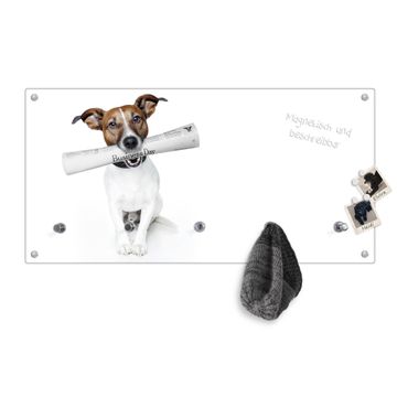 Bitte beachten Sie, dass an dieser Garderobe nur starke Neodym-Magnete halten! FUNKTION: Die banjado Wandgarderobe mit Motiv Business Day ist Ihr täglicher Begleiter. Zuverlässig hängen hier Ihre Jacken und Mäntel griffbereit. Gleichzeitig ist die Design Garderobe magnetisch, Sie können Notizen anheften und durch das Echtglas ist Ihr Paneel auch beschreibbar und wieder abwischbar. DESIGN: Sie erhalten eine Garderobenleiste aus elegantem Echtglas mit dem Farbbrillanten Motiv Business Day hinterklebt. Das Design ist zeitlos klassisch, ohne dabei auf Funktionalität zu verzichten. Suchen Sie aus einer Vielzahl von Motiven das für Ihre Einrichtung Passende aus. DETAILS: Die Flurgarderobe besteht aus 4mm gehärtetem Sicherheitsglas. Sie ist 80cm breit, 40cm hoch und 6cm tief. Die Garderobenhaken zur Selbstmontage präsentieren sich in Edelstahl-Optik, ebenso die Abstandshalter für die Wandmontage. Ihre neue Garderobe ist sofort einsatzbereit. NUTZEN: Ihre neue Garderobe hält nicht nur zuverlässig Ihre Kleidung, sie ist auch optisch ein Blickfang. Durch die magnetische Wirkung können Sie mit 4 beigefügten extrastarken Neodym-Magneten Notizen anheften und mit wasserlöslichen Kreidestiften oder Whiteboard-Markern auch Nachrichten hinterlassen. BANJADO: Wir sind ein kleines kreatives Team aus Sachsen und entwickeln Produkte die Design und Funktionalität verbinden sollen. Viel Freude mit Ihrer neuen Garderobe wünscht das banjado-Team!