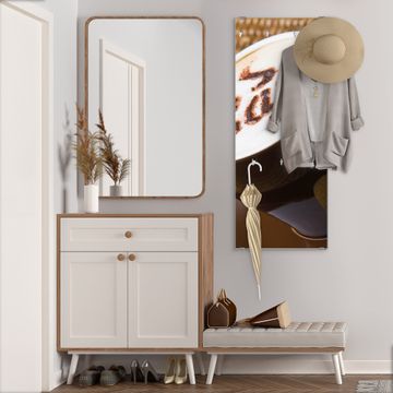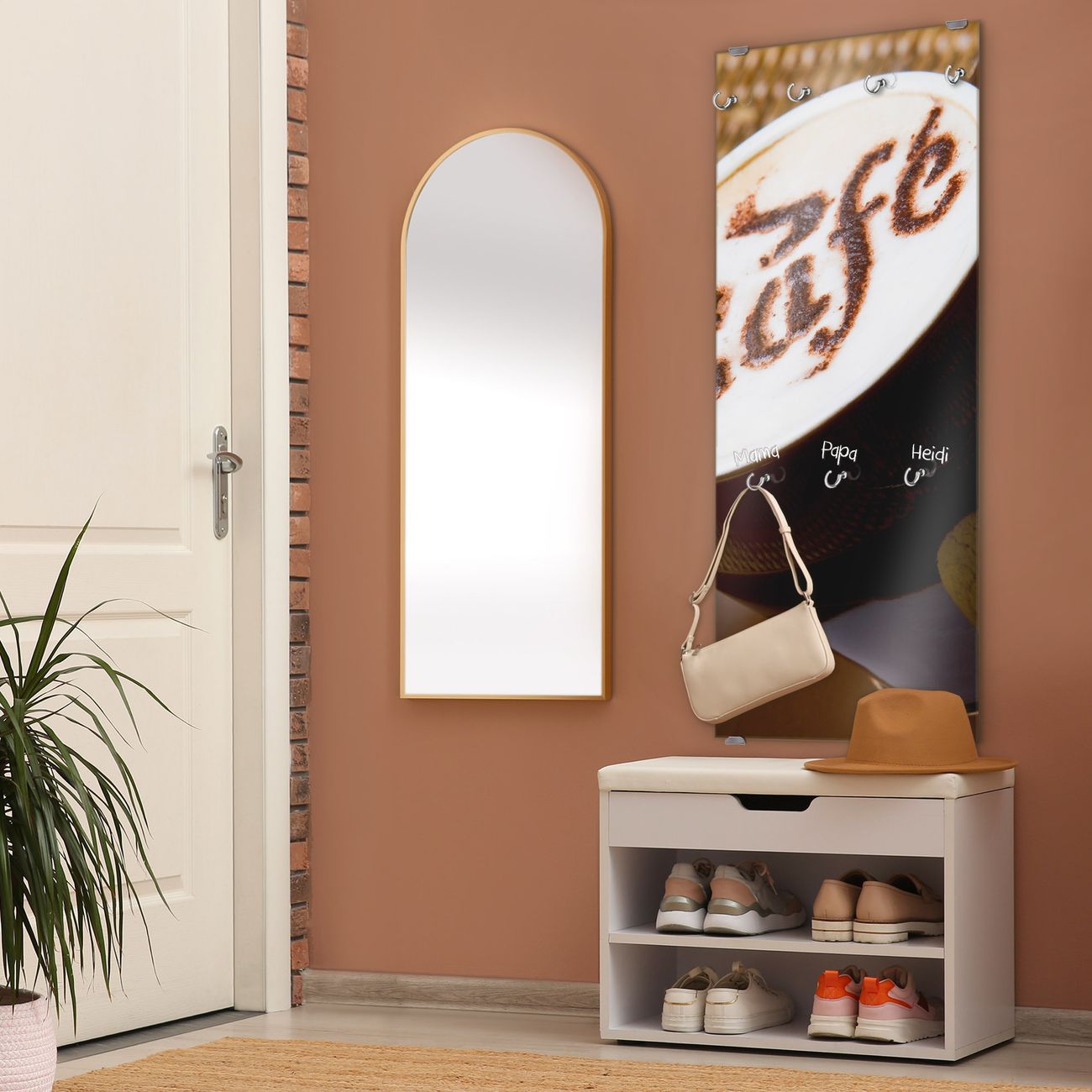 FUNKTION: Die banjado Wandgarderobe mit Motiv Cafe ist Ihr täglicher Begleiter. Zuverlässig hängen hier Ihre Jacken und Mäntel griffbereit. Das Echtglas ist Ihr Paneel auch beschreibbar und wieder abwischbar. DESIGN: Sie erhalten eine Garderobenleiste aus elegantem Echtglas mit dem Farbbrillanten Motiv Cafe hinterklebt. Das Design ist zeitlos klassisch, ohne dabei auf Funktionalität zu verzichten. Suchen Sie aus einer Vielzahl von Motiven das für Ihre Einrichtung Passende aus. DETAILS: Die Flurgarderobe besteht aus 4mm gehärtetem Sicherheitsglas. Sie ist 50cm breit, 125cm hoch und 6cm tief. Die Garderobenhaken zur Selbstmontage präsentieren sich in Edelstahl-Optik, ebenso die Abstandshalter für die Wandmontage. Ihre neue Garderobe ist sofort einsatzbereit. NUTZEN: Ihre neue Garderobe hält nicht nur zuverlässig Ihre Kleidung, sie ist auch optisch ein Blickfang. Durch das Glas können Sie an der Garderobe mit wasserlöslichen Kreidestiften oder Whiteboard-Markern auch Nachrichten hinterlassen. BANJADO: Wir sind ein kleines kreatives Team aus Sachsen und entwickeln Produkte die Design und Funktionalität verbinden sollen. Viel Freude mit Ihrer neuen Garderobe wünscht das banjado-Team!