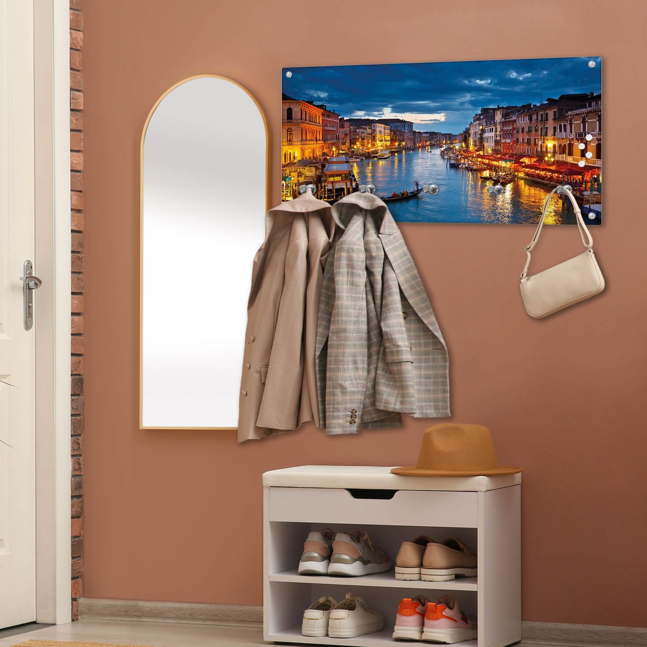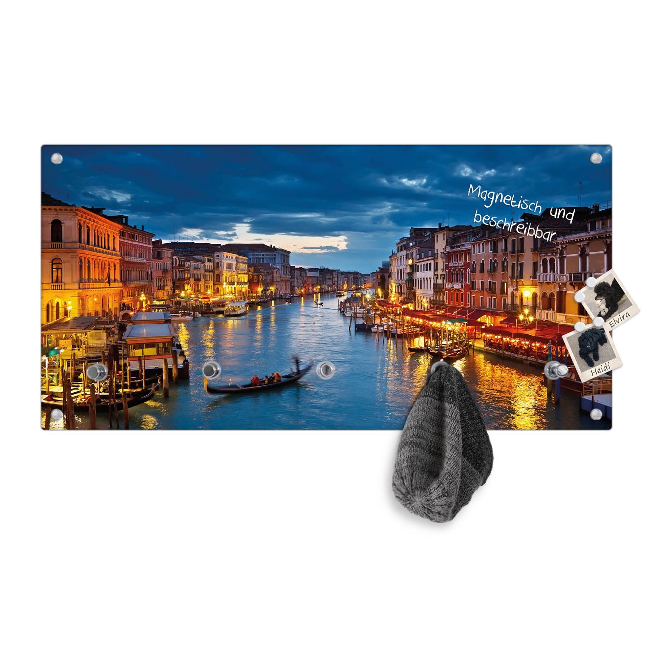 Bitte beachten Sie, dass an dieser Garderobe nur starke Neodym-Magnete halten! FUNKTION: Die banjado Wandgarderobe mit Motiv Canale Grande Bei Nacht ist Ihr täglicher Begleiter. Zuverlässig hängen hier Ihre Jacken und Mäntel griffbereit. Gleichzeitig ist die Design Garderobe magnetisch, Sie können Notizen anheften und durch das Echtglas ist Ihr Paneel auch beschreibbar und wieder abwischbar. DESIGN: Sie erhalten eine Garderobenleiste aus elegantem Echtglas mit dem Farbbrillanten Motiv Canale Grande Bei Nacht hinterklebt. Das Design ist zeitlos klassisch, ohne dabei auf Funktionalität zu verzichten. Suchen Sie aus einer Vielzahl von Motiven das für Ihre Einrichtung Passende aus. DETAILS: Die Flurgarderobe besteht aus 4mm gehärtetem Sicherheitsglas. Sie ist 80cm breit, 40cm hoch und 6cm tief. Die Garderobenhaken zur Selbstmontage präsentieren sich in Edelstahl-Optik, ebenso die Abstandshalter für die Wandmontage. Ihre neue Garderobe ist sofort einsatzbereit. NUTZEN: Ihre neue Garderobe hält nicht nur zuverlässig Ihre Kleidung, sie ist auch optisch ein Blickfang. Durch die magnetische Wirkung können Sie mit 4 beigefügten extrastarken Neodym-Magneten Notizen anheften und mit wasserlöslichen Kreidestiften oder Whiteboard-Markern auch Nachrichten hinterlassen. BANJADO: Wir sind ein kleines kreatives Team aus Sachsen und entwickeln Produkte die Design und Funktionalität verbinden sollen. Viel Freude mit Ihrer neuen Garderobe wünscht das banjado-Team!