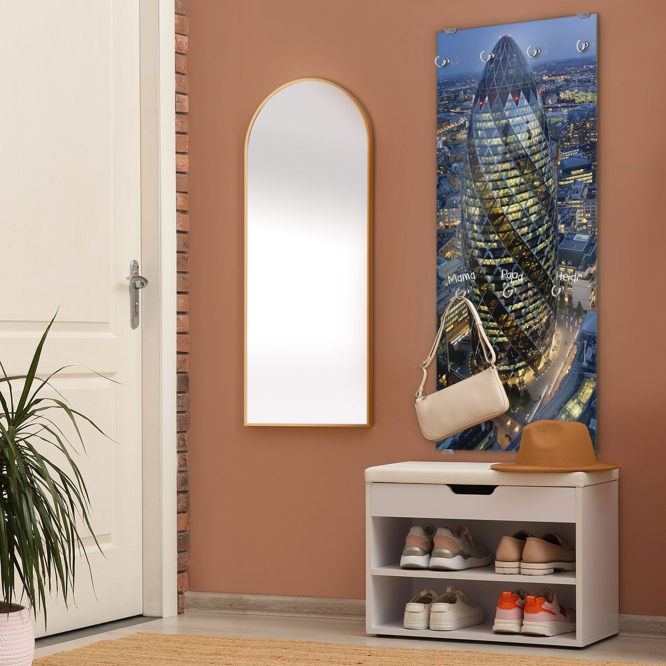 FUNKTION: Die banjado Wandgarderobe mit Motiv City Of London ist Ihr täglicher Begleiter. Zuverlässig hängen hier Ihre Jacken und Mäntel griffbereit. Das Echtglas ist Ihr Paneel auch beschreibbar und wieder abwischbar. DESIGN: Sie erhalten eine Garderobenleiste aus elegantem Echtglas mit dem Farbbrillanten Motiv City Of London hinterklebt. Das Design ist zeitlos klassisch, ohne dabei auf Funktionalität zu verzichten. Suchen Sie aus einer Vielzahl von Motiven das für Ihre Einrichtung Passende aus. DETAILS: Die Flurgarderobe besteht aus 4mm gehärtetem Sicherheitsglas. Sie ist 50cm breit, 125cm hoch und 6cm tief. Die Garderobenhaken zur Selbstmontage präsentieren sich in Edelstahl-Optik, ebenso die Abstandshalter für die Wandmontage. Ihre neue Garderobe ist sofort einsatzbereit. NUTZEN: Ihre neue Garderobe hält nicht nur zuverlässig Ihre Kleidung, sie ist auch optisch ein Blickfang. Durch das Glas können Sie an der Garderobe mit wasserlöslichen Kreidestiften oder Whiteboard-Markern auch Nachrichten hinterlassen. BANJADO: Wir sind ein kleines kreatives Team aus Sachsen und entwickeln Produkte die Design und Funktionalität verbinden sollen. Viel Freude mit Ihrer neuen Garderobe wünscht das banjado-Team!