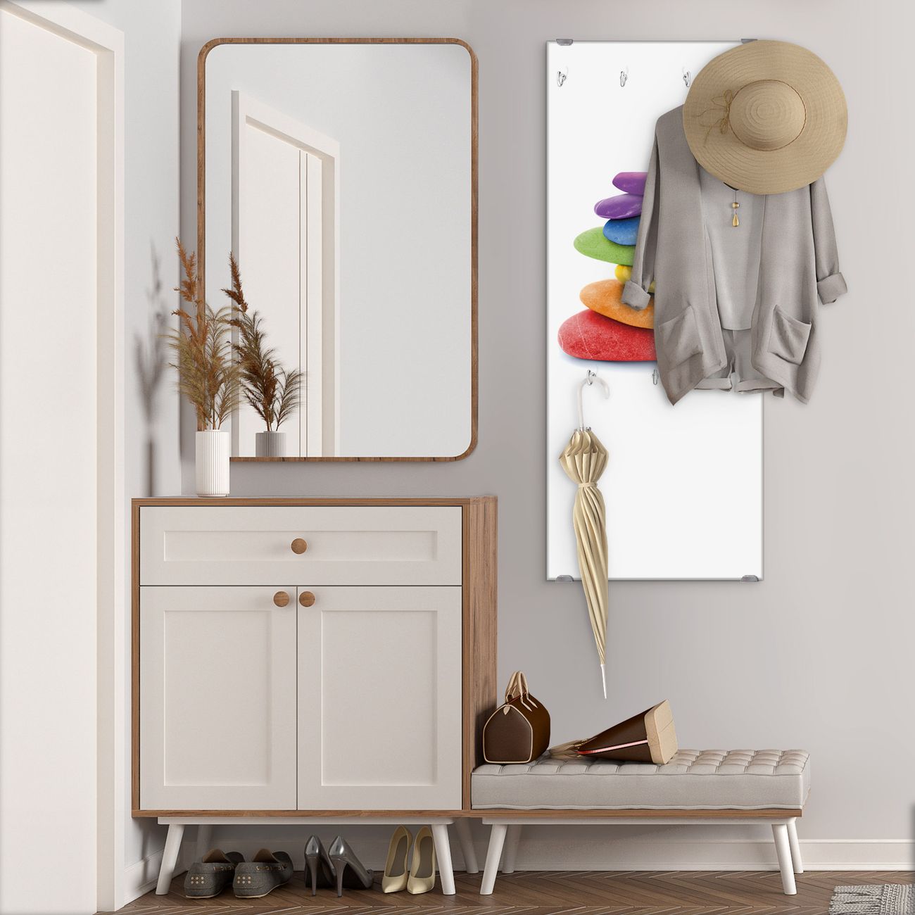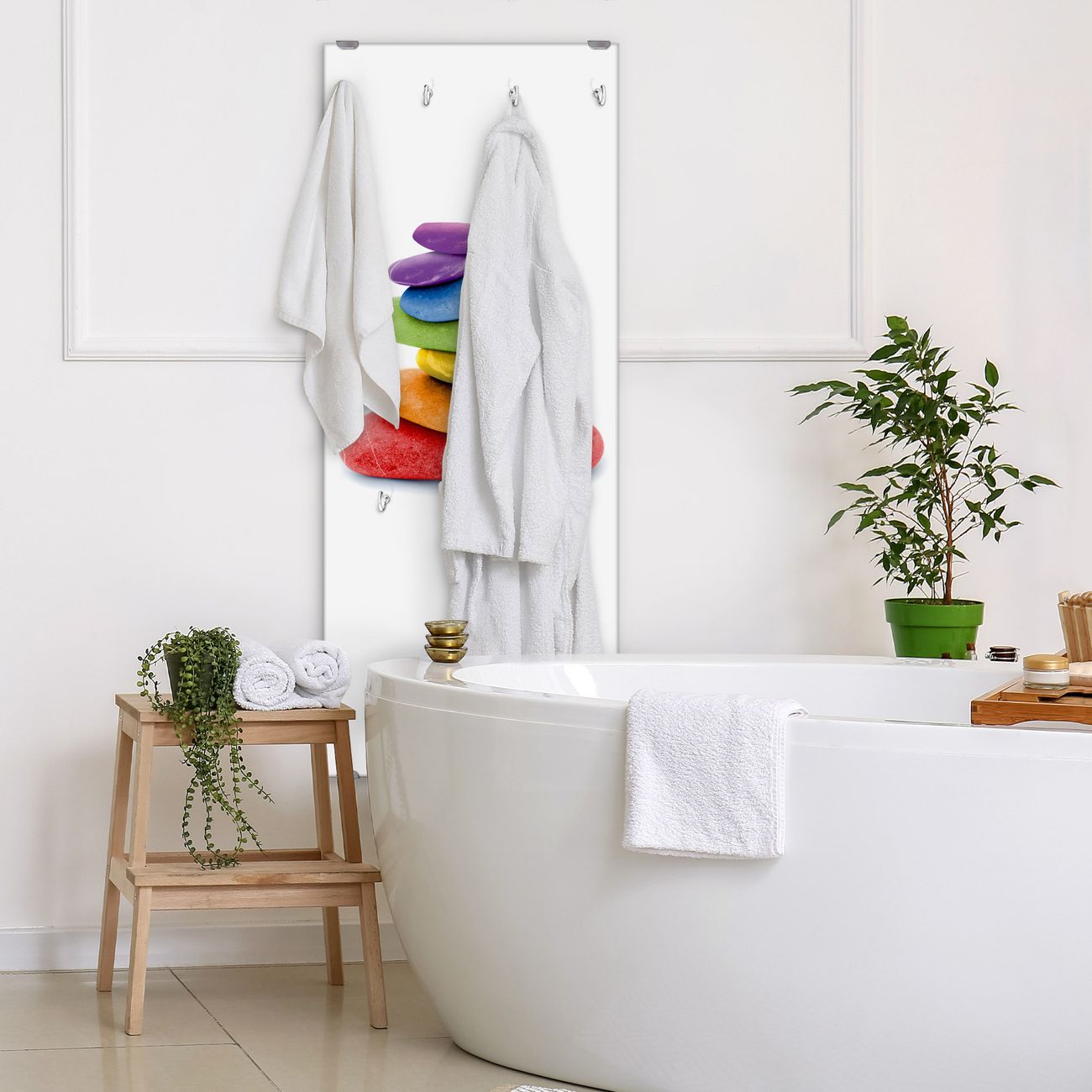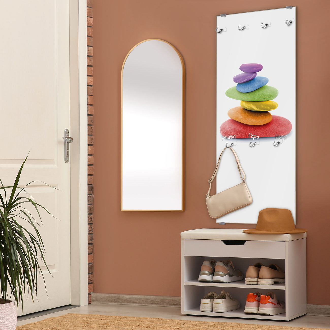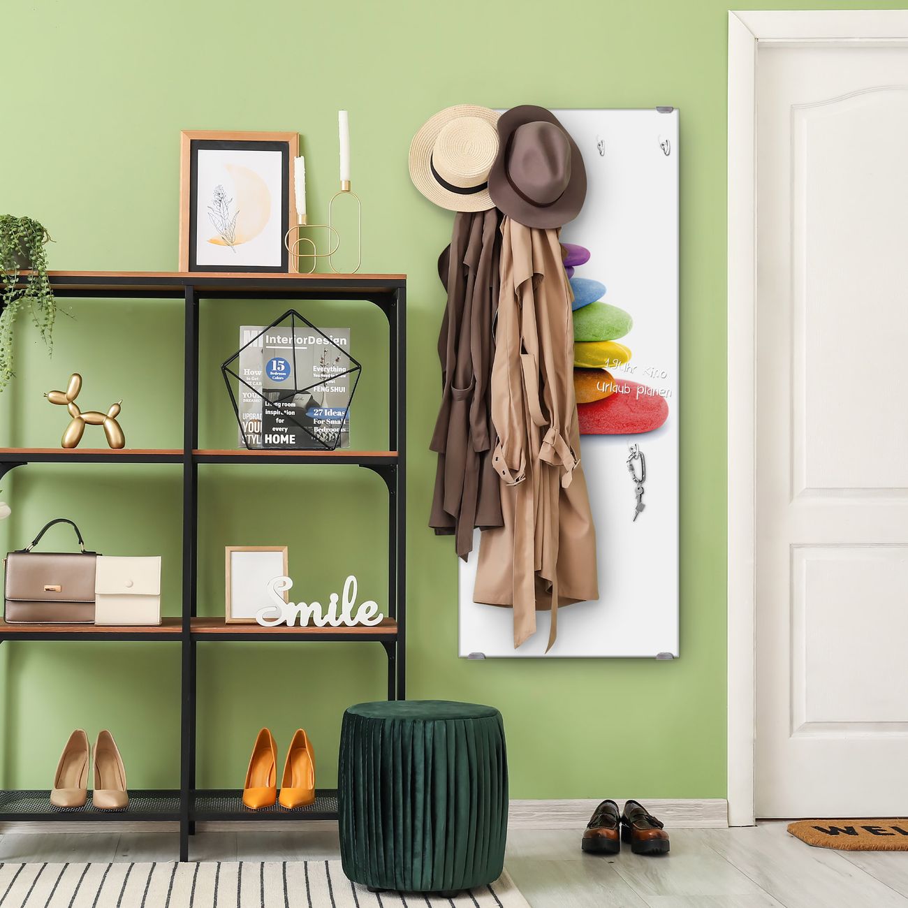 FUNKTION: Die banjado Wandgarderobe mit Motiv Coloured Stone ist Ihr täglicher Begleiter. Zuverlässig hängen hier Ihre Jacken und Mäntel griffbereit. Das Echtglas ist Ihr Paneel auch beschreibbar und wieder abwischbar. DESIGN: Sie erhalten eine Garderobenleiste aus elegantem Echtglas mit dem Farbbrillanten Motiv Coloured Stone hinterklebt. Das Design ist zeitlos klassisch, ohne dabei auf Funktionalität zu verzichten. Suchen Sie aus einer Vielzahl von Motiven das für Ihre Einrichtung Passende aus. DETAILS: Die Flurgarderobe besteht aus 4mm gehärtetem Sicherheitsglas. Sie ist 50cm breit, 125cm hoch und 6cm tief. Die Garderobenhaken zur Selbstmontage präsentieren sich in Edelstahl-Optik, ebenso die Abstandshalter für die Wandmontage. Ihre neue Garderobe ist sofort einsatzbereit. NUTZEN: Ihre neue Garderobe hält nicht nur zuverlässig Ihre Kleidung, sie ist auch optisch ein Blickfang. Durch das Glas können Sie an der Garderobe mit wasserlöslichen Kreidestiften oder Whiteboard-Markern auch Nachrichten hinterlassen. BANJADO: Wir sind ein kleines kreatives Team aus Sachsen und entwickeln Produkte die Design und Funktionalität verbinden sollen. Viel Freude mit Ihrer neuen Garderobe wünscht das banjado-Team!