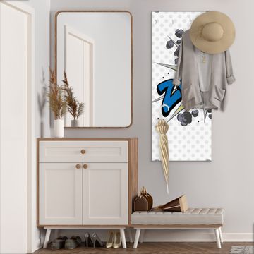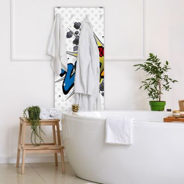 FUNKTION: Die banjado Wandgarderobe mit Motiv Comic ist Ihr täglicher Begleiter. Zuverlässig hängen hier Ihre Jacken und Mäntel griffbereit. Das Echtglas ist Ihr Paneel auch beschreibbar und wieder abwischbar. DESIGN: Sie erhalten eine Garderobenleiste aus elegantem Echtglas mit dem Farbbrillanten Motiv Comic hinterklebt. Das Design ist zeitlos klassisch, ohne dabei auf Funktionalität zu verzichten. Suchen Sie aus einer Vielzahl von Motiven das für Ihre Einrichtung Passende aus. DETAILS: Die Flurgarderobe besteht aus 4mm gehärtetem Sicherheitsglas. Sie ist 50cm breit, 125cm hoch und 6cm tief. Die Garderobenhaken zur Selbstmontage präsentieren sich in Edelstahl-Optik, ebenso die Abstandshalter für die Wandmontage. Ihre neue Garderobe ist sofort einsatzbereit. NUTZEN: Ihre neue Garderobe hält nicht nur zuverlässig Ihre Kleidung, sie ist auch optisch ein Blickfang. Durch das Glas können Sie an der Garderobe mit wasserlöslichen Kreidestiften oder Whiteboard-Markern auch Nachrichten hinterlassen. BANJADO: Wir sind ein kleines kreatives Team aus Sachsen und entwickeln Produkte die Design und Funktionalität verbinden sollen. Viel Freude mit Ihrer neuen Garderobe wünscht das banjado-Team!