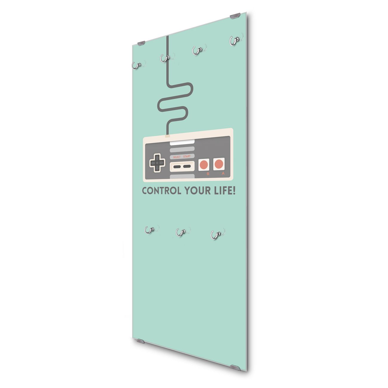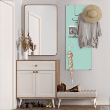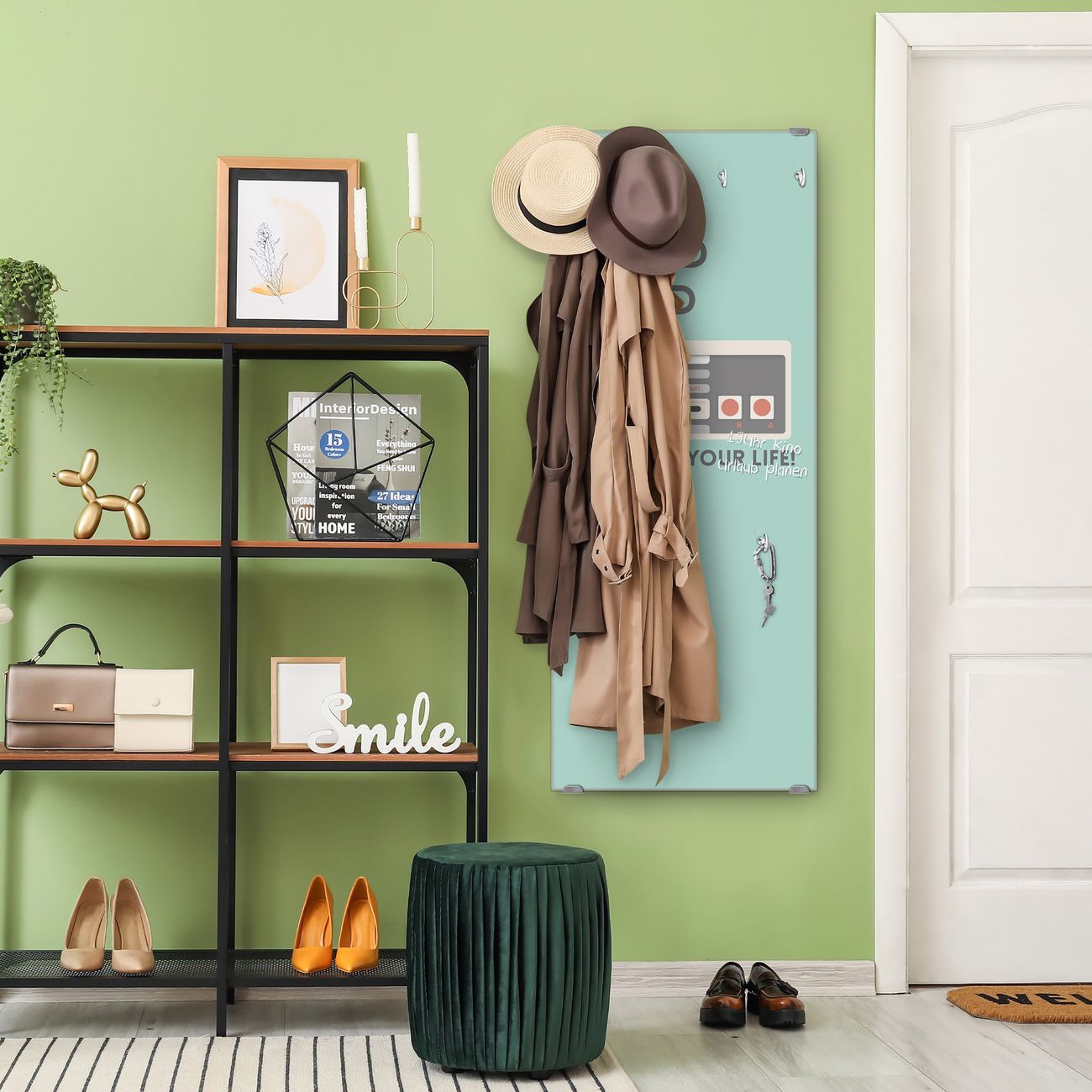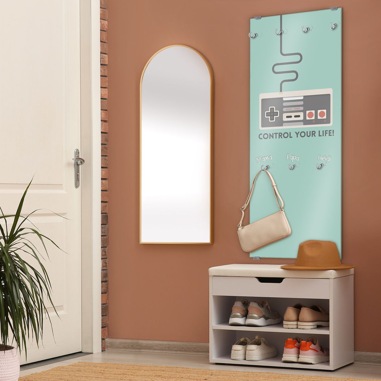 FUNKTION: Die banjado Wandgarderobe mit Motiv Control ist Ihr täglicher Begleiter. Zuverlässig hängen hier Ihre Jacken und Mäntel griffbereit. Das Echtglas ist Ihr Paneel auch beschreibbar und wieder abwischbar. DESIGN: Sie erhalten eine Garderobenleiste aus elegantem Echtglas mit dem Farbbrillanten Motiv Control hinterklebt. Das Design ist zeitlos klassisch, ohne dabei auf Funktionalität zu verzichten. Suchen Sie aus einer Vielzahl von Motiven das für Ihre Einrichtung Passende aus. DETAILS: Die Flurgarderobe besteht aus 4mm gehärtetem Sicherheitsglas. Sie ist 50cm breit, 125cm hoch und 6cm tief. Die Garderobenhaken zur Selbstmontage präsentieren sich in Edelstahl-Optik, ebenso die Abstandshalter für die Wandmontage. Ihre neue Garderobe ist sofort einsatzbereit. NUTZEN: Ihre neue Garderobe hält nicht nur zuverlässig Ihre Kleidung, sie ist auch optisch ein Blickfang. Durch das Glas können Sie an der Garderobe mit wasserlöslichen Kreidestiften oder Whiteboard-Markern auch Nachrichten hinterlassen. BANJADO: Wir sind ein kleines kreatives Team aus Sachsen und entwickeln Produkte die Design und Funktionalität verbinden sollen. Viel Freude mit Ihrer neuen Garderobe wünscht das banjado-Team!
