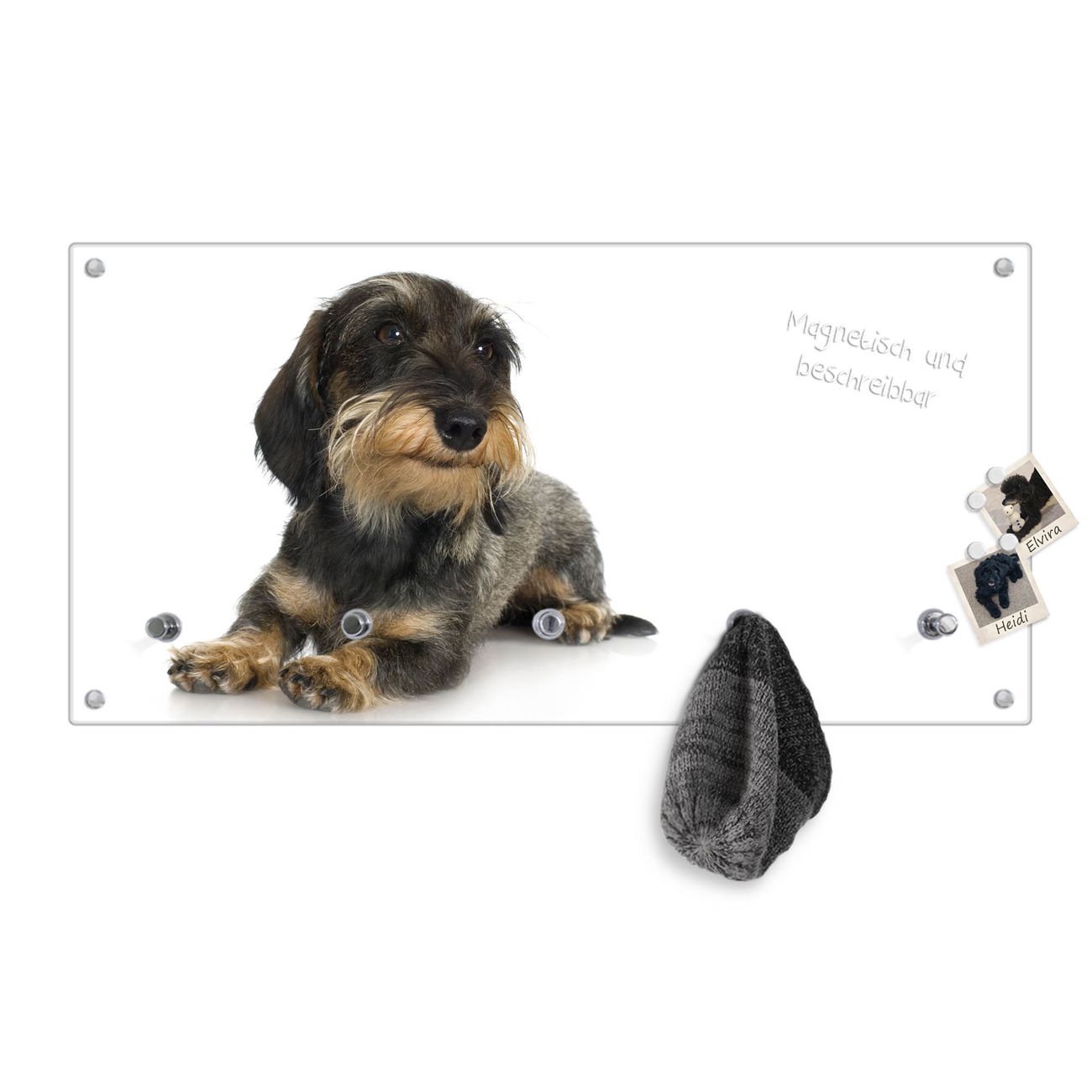 Bitte beachten Sie, dass an dieser Garderobe nur starke Neodym-Magnete halten! FUNKTION: Die banjado Wandgarderobe mit Motiv Dackel ist Ihr täglicher Begleiter. Zuverlässig hängen hier Ihre Jacken und Mäntel griffbereit. Gleichzeitig ist die Design Garderobe magnetisch, Sie können Notizen anheften und durch das Echtglas ist Ihr Paneel auch beschreibbar und wieder abwischbar. DESIGN: Sie erhalten eine Garderobenleiste aus elegantem Echtglas mit dem Farbbrillanten Motiv Dackel hinterklebt. Das Design ist zeitlos klassisch, ohne dabei auf Funktionalität zu verzichten. Suchen Sie aus einer Vielzahl von Motiven das für Ihre Einrichtung Passende aus. DETAILS: Die Flurgarderobe besteht aus 4mm gehärtetem Sicherheitsglas. Sie ist 80cm breit, 40cm hoch und 6cm tief. Die Garderobenhaken zur Selbstmontage präsentieren sich in Edelstahl-Optik, ebenso die Abstandshalter für die Wandmontage. Ihre neue Garderobe ist sofort einsatzbereit. NUTZEN: Ihre neue Garderobe hält nicht nur zuverlässig Ihre Kleidung, sie ist auch optisch ein Blickfang. Durch die magnetische Wirkung können Sie mit 4 beigefügten extrastarken Neodym-Magneten Notizen anheften und mit wasserlöslichen Kreidestiften oder Whiteboard-Markern auch Nachrichten hinterlassen. BANJADO: Wir sind ein kleines kreatives Team aus Sachsen und entwickeln Produkte die Design und Funktionalität verbinden sollen. Viel Freude mit Ihrer neuen Garderobe wünscht das banjado-Team!