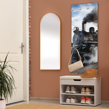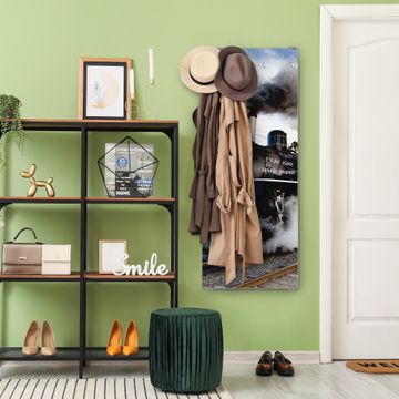 FUNKTION: Die banjado Wandgarderobe mit Motiv Dampflok ist Ihr täglicher Begleiter. Zuverlässig hängen hier Ihre Jacken und Mäntel griffbereit. Das Echtglas ist Ihr Paneel auch beschreibbar und wieder abwischbar. DESIGN: Sie erhalten eine Garderobenleiste aus elegantem Echtglas mit dem Farbbrillanten Motiv Dampflok hinterklebt. Das Design ist zeitlos klassisch, ohne dabei auf Funktionalität zu verzichten. Suchen Sie aus einer Vielzahl von Motiven das für Ihre Einrichtung Passende aus. DETAILS: Die Flurgarderobe besteht aus 4mm gehärtetem Sicherheitsglas. Sie ist 50cm breit, 125cm hoch und 6cm tief. Die Garderobenhaken zur Selbstmontage präsentieren sich in Edelstahl-Optik, ebenso die Abstandshalter für die Wandmontage. Ihre neue Garderobe ist sofort einsatzbereit. NUTZEN: Ihre neue Garderobe hält nicht nur zuverlässig Ihre Kleidung, sie ist auch optisch ein Blickfang. Durch das Glas können Sie an der Garderobe mit wasserlöslichen Kreidestiften oder Whiteboard-Markern auch Nachrichten hinterlassen. BANJADO: Wir sind ein kleines kreatives Team aus Sachsen und entwickeln Produkte die Design und Funktionalität verbinden sollen. Viel Freude mit Ihrer neuen Garderobe wünscht das banjado-Team!