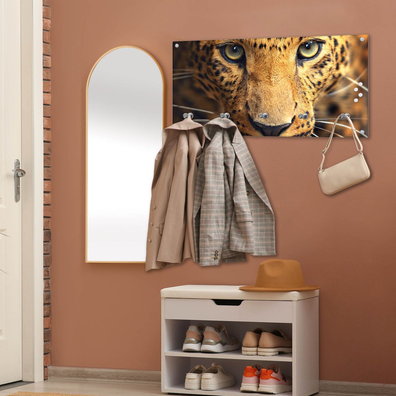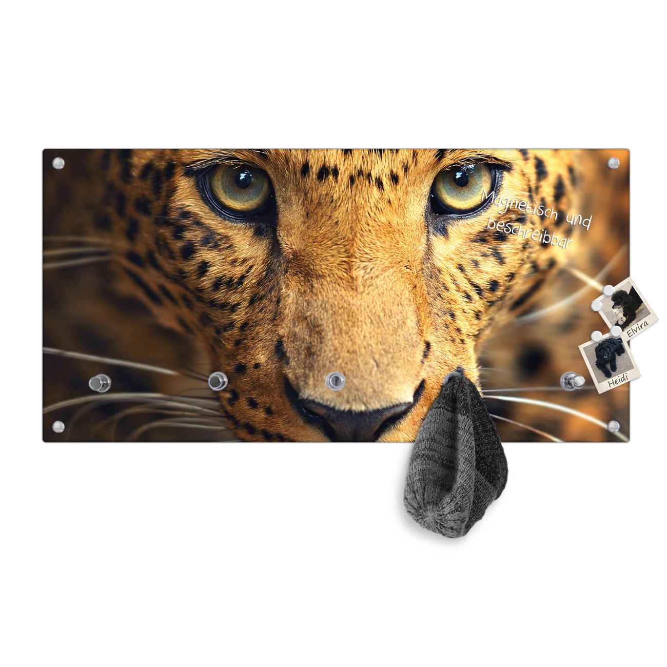 Bitte beachten Sie, dass an dieser Garderobe nur starke Neodym-Magnete halten! FUNKTION: Die banjado Wandgarderobe mit Motiv Daphne ist Ihr täglicher Begleiter. Zuverlässig hängen hier Ihre Jacken und Mäntel griffbereit. Gleichzeitig ist die Design Garderobe magnetisch, Sie können Notizen anheften und durch das Echtglas ist Ihr Paneel auch beschreibbar und wieder abwischbar. DESIGN: Sie erhalten eine Garderobenleiste aus elegantem Echtglas mit dem Farbbrillanten Motiv Daphne hinterklebt. Das Design ist zeitlos klassisch, ohne dabei auf Funktionalität zu verzichten. Suchen Sie aus einer Vielzahl von Motiven das für Ihre Einrichtung Passende aus. DETAILS: Die Flurgarderobe besteht aus 4mm gehärtetem Sicherheitsglas. Sie ist 80cm breit, 40cm hoch und 6cm tief. Die Garderobenhaken zur Selbstmontage präsentieren sich in Edelstahl-Optik, ebenso die Abstandshalter für die Wandmontage. Ihre neue Garderobe ist sofort einsatzbereit. NUTZEN: Ihre neue Garderobe hält nicht nur zuverlässig Ihre Kleidung, sie ist auch optisch ein Blickfang. Durch die magnetische Wirkung können Sie mit 4 beigefügten extrastarken Neodym-Magneten Notizen anheften und mit wasserlöslichen Kreidestiften oder Whiteboard-Markern auch Nachrichten hinterlassen. BANJADO: Wir sind ein kleines kreatives Team aus Sachsen und entwickeln Produkte die Design und Funktionalität verbinden sollen. Viel Freude mit Ihrer neuen Garderobe wünscht das banjado-Team!