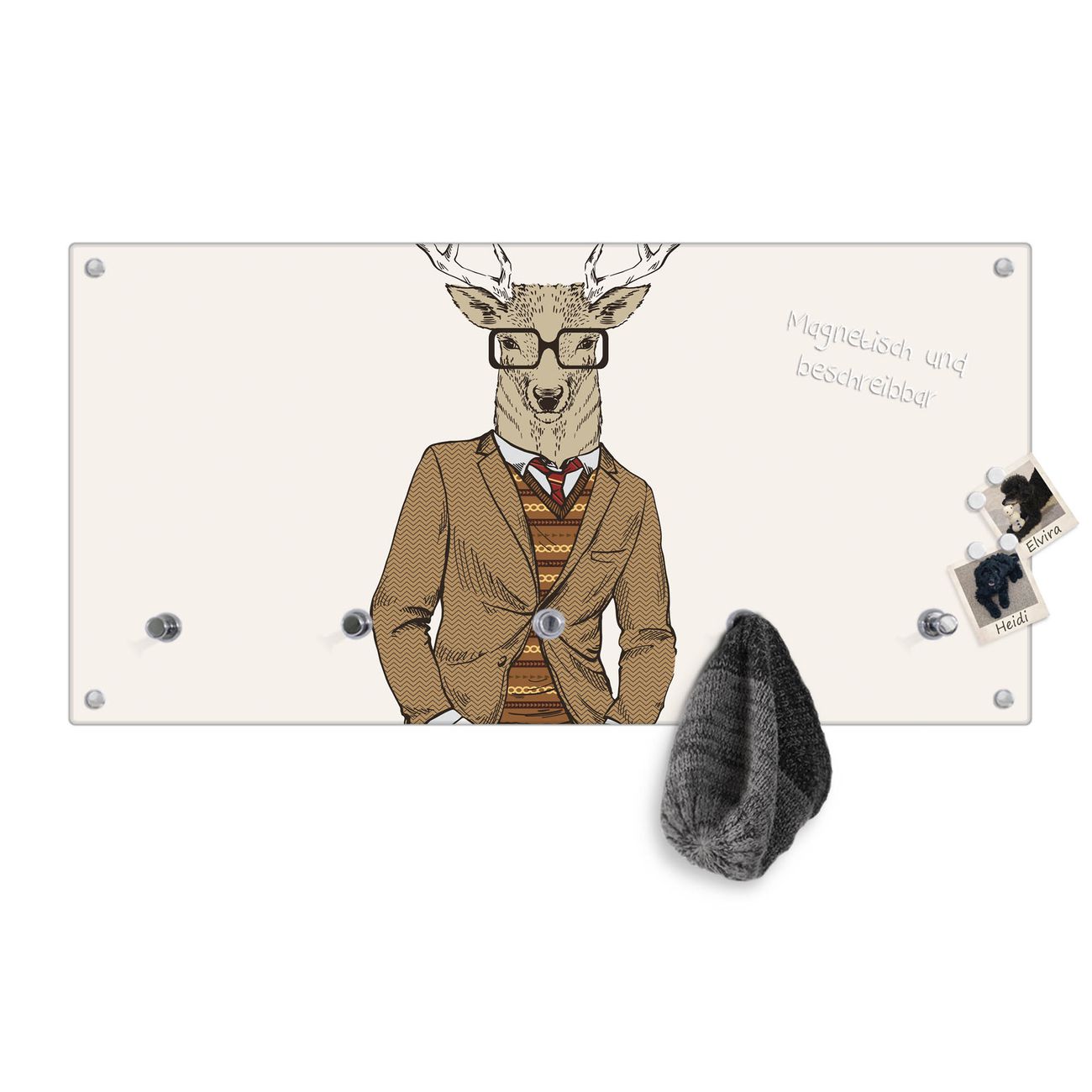 Bitte beachten Sie, dass an dieser Garderobe nur starke Neodym-Magnete halten! FUNKTION: Die banjado Wandgarderobe mit Motiv Doktor Hirsch ist Ihr täglicher Begleiter. Zuverlässig hängen hier Ihre Jacken und Mäntel griffbereit. Gleichzeitig ist die Design Garderobe magnetisch, Sie können Notizen anheften und durch das Echtglas ist Ihr Paneel auch beschreibbar und wieder abwischbar. DESIGN: Sie erhalten eine Garderobenleiste aus elegantem Echtglas mit dem Farbbrillanten Motiv Doktor Hirsch hinterklebt. Das Design ist zeitlos klassisch, ohne dabei auf Funktionalität zu verzichten. Suchen Sie aus einer Vielzahl von Motiven das für Ihre Einrichtung Passende aus. DETAILS: Die Flurgarderobe besteht aus 4mm gehärtetem Sicherheitsglas. Sie ist 80cm breit, 40cm hoch und 6cm tief. Die Garderobenhaken zur Selbstmontage präsentieren sich in Edelstahl-Optik, ebenso die Abstandshalter für die Wandmontage. Ihre neue Garderobe ist sofort einsatzbereit. NUTZEN: Ihre neue Garderobe hält nicht nur zuverlässig Ihre Kleidung, sie ist auch optisch ein Blickfang. Durch die magnetische Wirkung können Sie mit 4 beigefügten extrastarken Neodym-Magneten Notizen anheften und mit wasserlöslichen Kreidestiften oder Whiteboard-Markern auch Nachrichten hinterlassen. BANJADO: Wir sind ein kleines kreatives Team aus Sachsen und entwickeln Produkte die Design und Funktionalität verbinden sollen. Viel Freude mit Ihrer neuen Garderobe wünscht das banjado-Team!