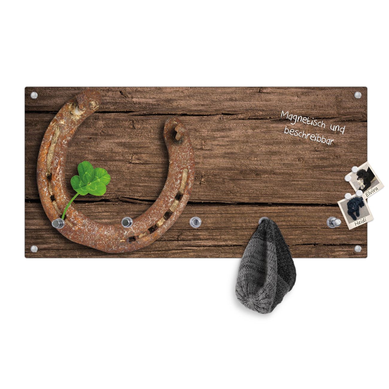 Bitte beachten Sie, dass an dieser Garderobe nur starke Neodym-Magnete halten! FUNKTION: Die banjado Wandgarderobe mit Motiv Doppeltes Glück ist Ihr täglicher Begleiter. Zuverlässig hängen hier Ihre Jacken und Mäntel griffbereit. Gleichzeitig ist die Design Garderobe magnetisch, Sie können Notizen anheften und durch das Echtglas ist Ihr Paneel auch beschreibbar und wieder abwischbar. DESIGN: Sie erhalten eine Garderobenleiste aus elegantem Echtglas mit dem Farbbrillanten Motiv Doppeltes Glück hinterklebt. Das Design ist zeitlos klassisch, ohne dabei auf Funktionalität zu verzichten. Suchen Sie aus einer Vielzahl von Motiven das für Ihre Einrichtung Passende aus. DETAILS: Die Flurgarderobe besteht aus 4mm gehärtetem Sicherheitsglas. Sie ist 80cm breit, 40cm hoch und 6cm tief. Die Garderobenhaken zur Selbstmontage präsentieren sich in Edelstahl-Optik, ebenso die Abstandshalter für die Wandmontage. Ihre neue Garderobe ist sofort einsatzbereit. NUTZEN: Ihre neue Garderobe hält nicht nur zuverlässig Ihre Kleidung, sie ist auch optisch ein Blickfang. Durch die magnetische Wirkung können Sie mit 4 beigefügten extrastarken Neodym-Magneten Notizen anheften und mit wasserlöslichen Kreidestiften oder Whiteboard-Markern auch Nachrichten hinterlassen. BANJADO: Wir sind ein kleines kreatives Team aus Sachsen und entwickeln Produkte die Design und Funktionalität verbinden sollen. Viel Freude mit Ihrer neuen Garderobe wünscht das banjado-Team!