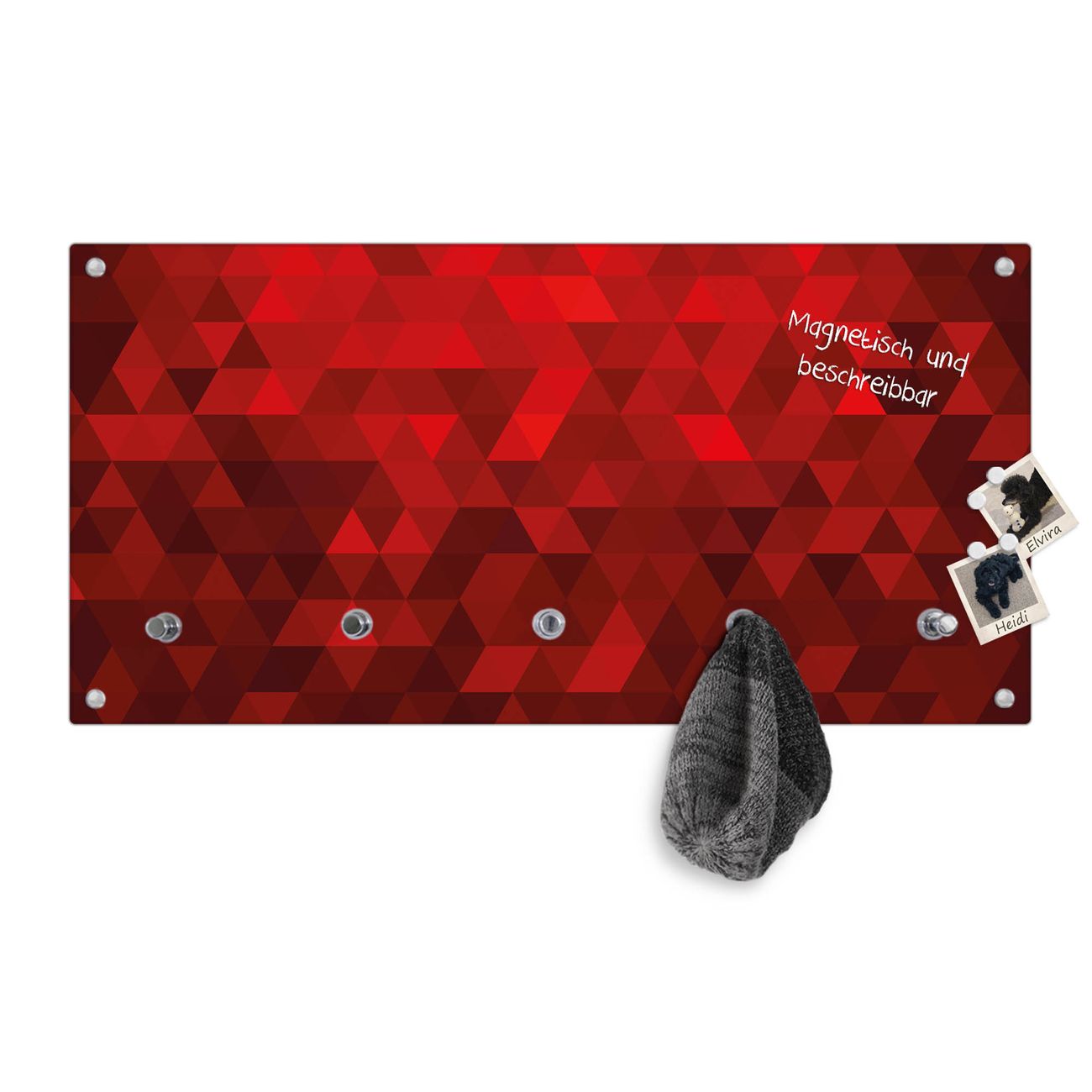 Bitte beachten Sie, dass an dieser Garderobe nur starke Neodym-Magnete halten! FUNKTION: Die banjado Wandgarderobe mit Motiv Dreiecke Rot ist Ihr täglicher Begleiter. Zuverlässig hängen hier Ihre Jacken und Mäntel griffbereit. Gleichzeitig ist die Design Garderobe magnetisch, Sie können Notizen anheften und durch das Echtglas ist Ihr Paneel auch beschreibbar und wieder abwischbar. DESIGN: Sie erhalten eine Garderobenleiste aus elegantem Echtglas mit dem Farbbrillanten Motiv Dreiecke Rot hinterklebt. Das Design ist zeitlos klassisch, ohne dabei auf Funktionalität zu verzichten. Suchen Sie aus einer Vielzahl von Motiven das für Ihre Einrichtung Passende aus. DETAILS: Die Flurgarderobe besteht aus 4mm gehärtetem Sicherheitsglas. Sie ist 80cm breit, 40cm hoch und 6cm tief. Die Garderobenhaken zur Selbstmontage präsentieren sich in Edelstahl-Optik, ebenso die Abstandshalter für die Wandmontage. Ihre neue Garderobe ist sofort einsatzbereit. NUTZEN: Ihre neue Garderobe hält nicht nur zuverlässig Ihre Kleidung, sie ist auch optisch ein Blickfang. Durch die magnetische Wirkung können Sie mit 4 beigefügten extrastarken Neodym-Magneten Notizen anheften und mit wasserlöslichen Kreidestiften oder Whiteboard-Markern auch Nachrichten hinterlassen. BANJADO: Wir sind ein kleines kreatives Team aus Sachsen und entwickeln Produkte die Design und Funktionalität verbinden sollen. Viel Freude mit Ihrer neuen Garderobe wünscht das banjado-Team!