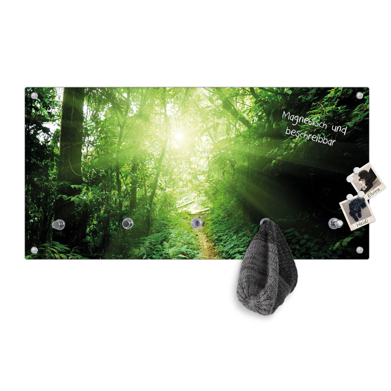 Bitte beachten Sie, dass an dieser Garderobe nur starke Neodym-Magnete halten! FUNKTION: Die banjado Wandgarderobe mit Motiv Dschungel Malaysia ist Ihr täglicher Begleiter. Zuverlässig hängen hier Ihre Jacken und Mäntel griffbereit. Gleichzeitig ist die Design Garderobe magnetisch, Sie können Notizen anheften und durch das Echtglas ist Ihr Paneel auch beschreibbar und wieder abwischbar. DESIGN: Sie erhalten eine Garderobenleiste aus elegantem Echtglas mit dem Farbbrillanten Motiv Dschungel Malaysia hinterklebt. Das Design ist zeitlos klassisch, ohne dabei auf Funktionalität zu verzichten. Suchen Sie aus einer Vielzahl von Motiven das für Ihre Einrichtung Passende aus. DETAILS: Die Flurgarderobe besteht aus 4mm gehärtetem Sicherheitsglas. Sie ist 80cm breit, 40cm hoch und 6cm tief. Die Garderobenhaken zur Selbstmontage präsentieren sich in Edelstahl-Optik, ebenso die Abstandshalter für die Wandmontage. Ihre neue Garderobe ist sofort einsatzbereit. NUTZEN: Ihre neue Garderobe hält nicht nur zuverlässig Ihre Kleidung, sie ist auch optisch ein Blickfang. Durch die magnetische Wirkung können Sie mit 4 beigefügten extrastarken Neodym-Magneten Notizen anheften und mit wasserlöslichen Kreidestiften oder Whiteboard-Markern auch Nachrichten hinterlassen. BANJADO: Wir sind ein kleines kreatives Team aus Sachsen und entwickeln Produkte die Design und Funktionalität verbinden sollen. Viel Freude mit Ihrer neuen Garderobe wünscht das banjado-Team!