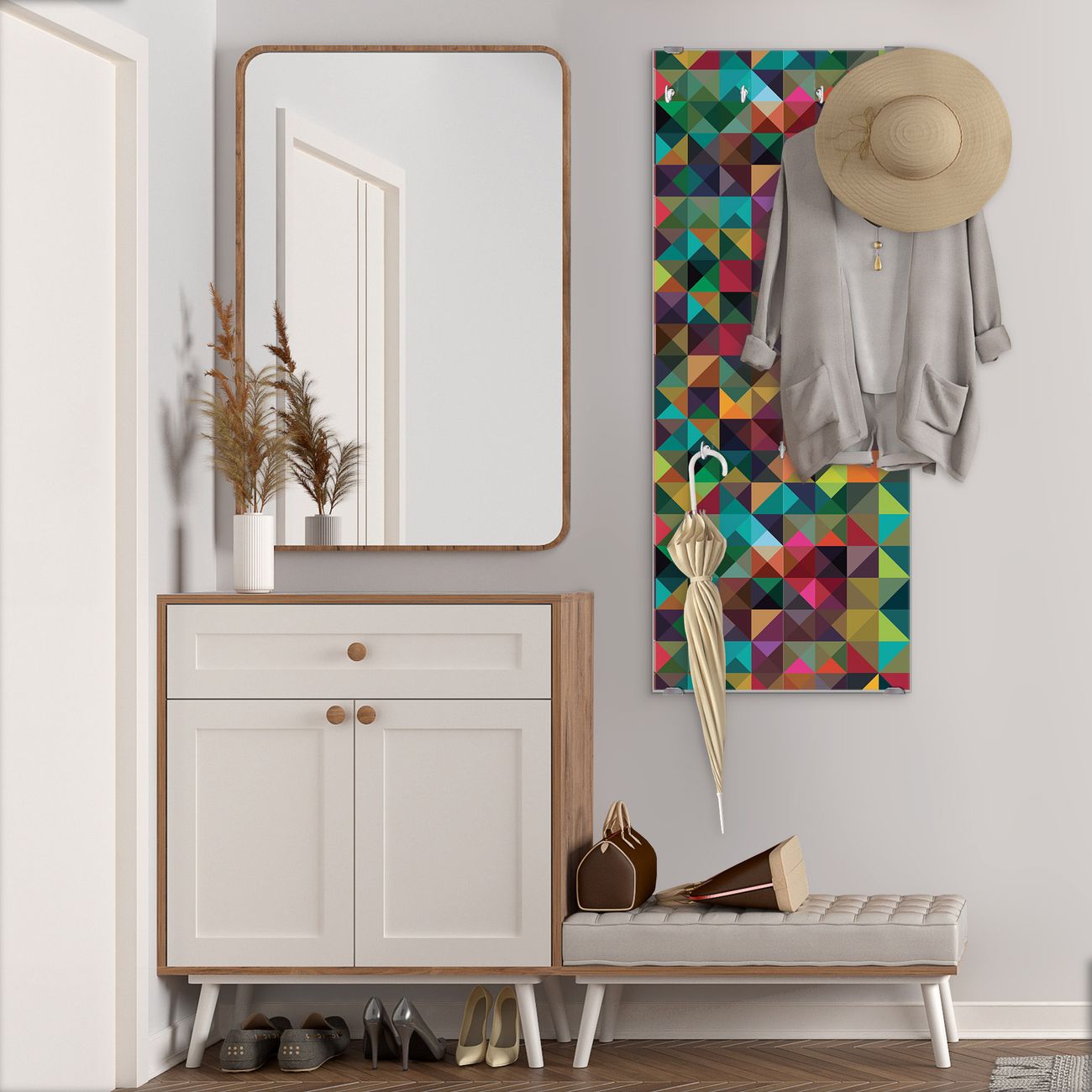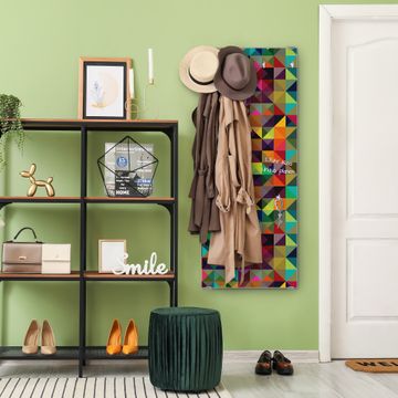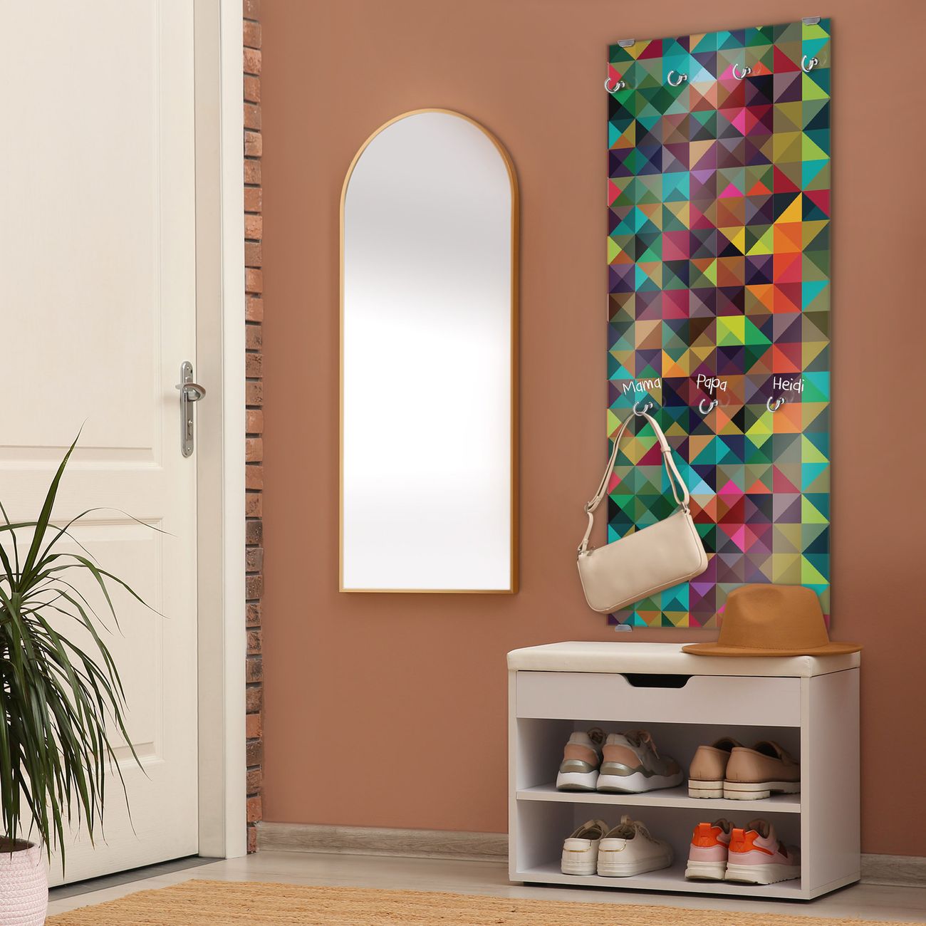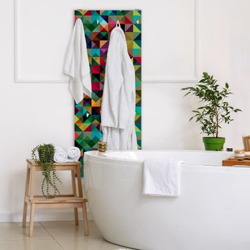 FUNKTION: Die banjado Wandgarderobe mit Motiv Dunkles Kaleidoskop ist Ihr täglicher Begleiter. Zuverlässig hängen hier Ihre Jacken und Mäntel griffbereit. Das Echtglas ist Ihr Paneel auch beschreibbar und wieder abwischbar. DESIGN: Sie erhalten eine Garderobenleiste aus elegantem Echtglas mit dem Farbbrillanten Motiv Dunkles Kaleidoskop hinterklebt. Das Design ist zeitlos klassisch, ohne dabei auf Funktionalität zu verzichten. Suchen Sie aus einer Vielzahl von Motiven das für Ihre Einrichtung Passende aus. DETAILS: Die Flurgarderobe besteht aus 4mm gehärtetem Sicherheitsglas. Sie ist 50cm breit, 125cm hoch und 6cm tief. Die Garderobenhaken zur Selbstmontage präsentieren sich in Edelstahl-Optik, ebenso die Abstandshalter für die Wandmontage. Ihre neue Garderobe ist sofort einsatzbereit. NUTZEN: Ihre neue Garderobe hält nicht nur zuverlässig Ihre Kleidung, sie ist auch optisch ein Blickfang. Durch das Glas können Sie an der Garderobe mit wasserlöslichen Kreidestiften oder Whiteboard-Markern auch Nachrichten hinterlassen. BANJADO: Wir sind ein kleines kreatives Team aus Sachsen und entwickeln Produkte die Design und Funktionalität verbinden sollen. Viel Freude mit Ihrer neuen Garderobe wünscht das banjado-Team!