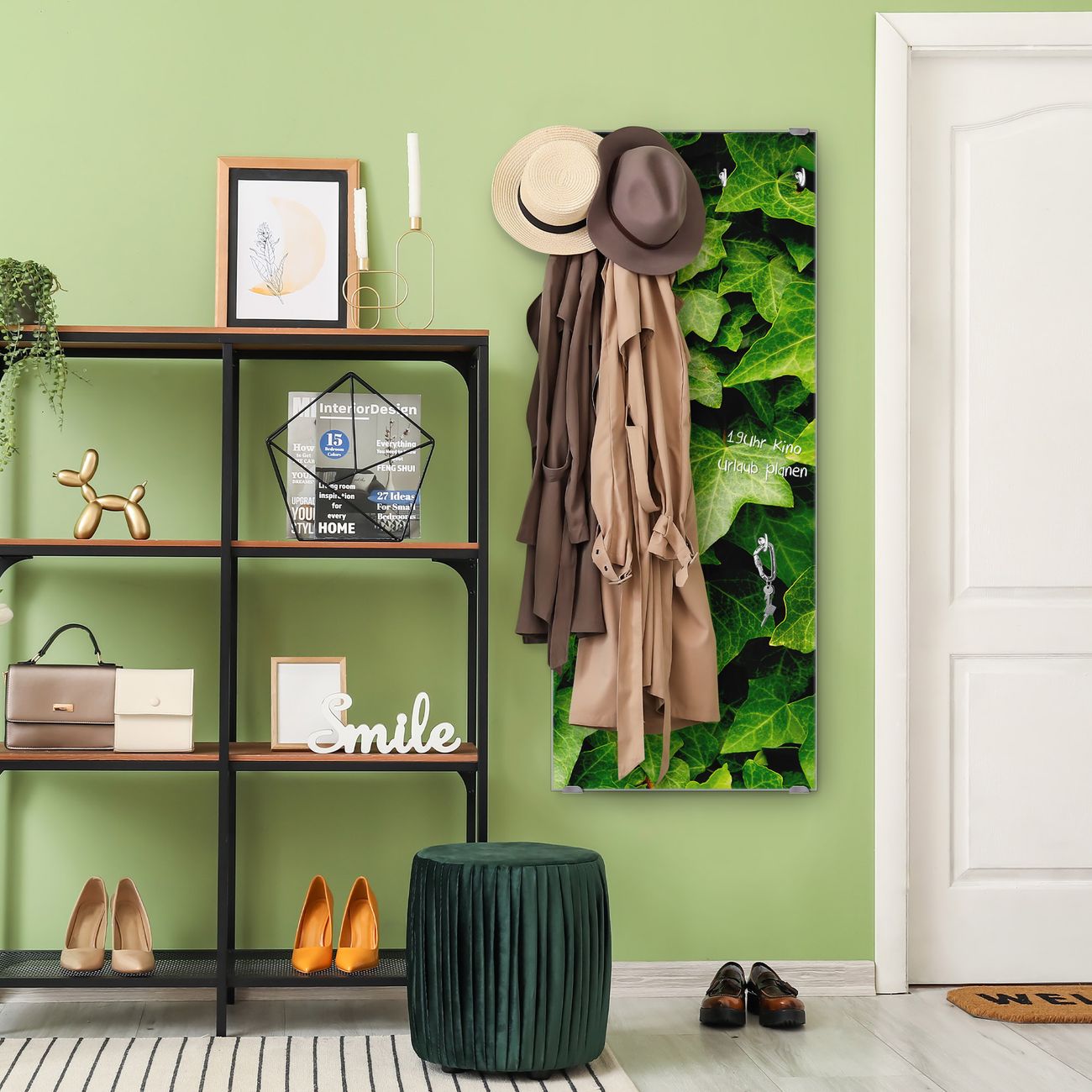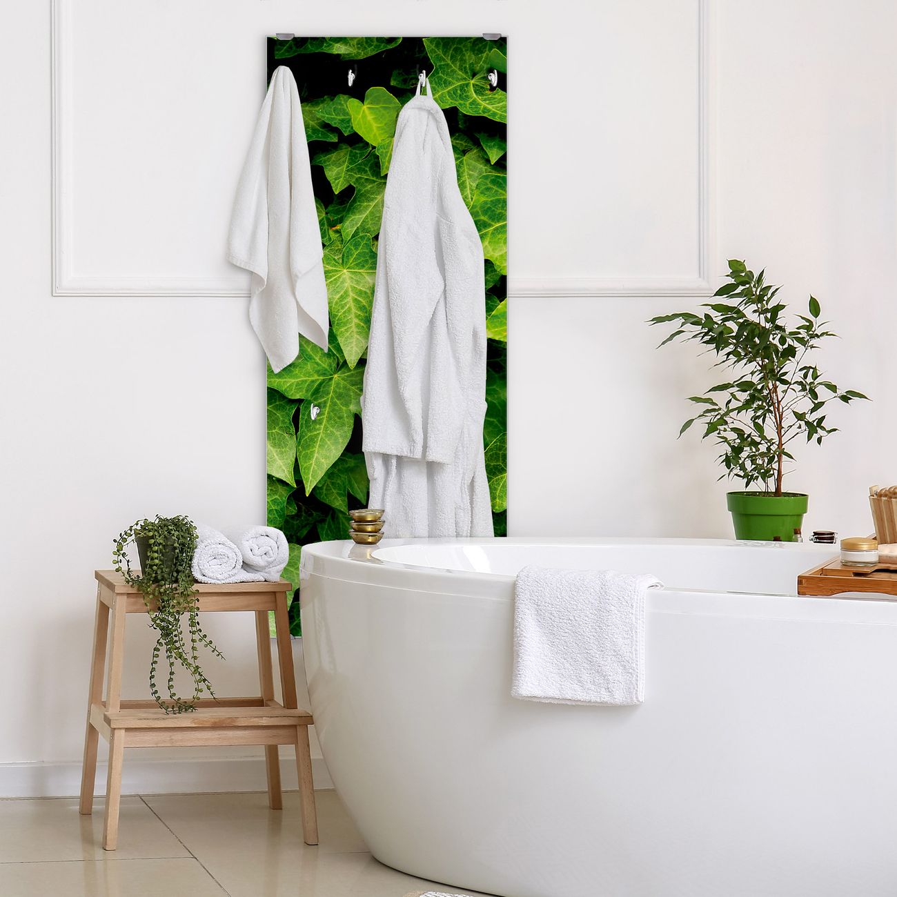 FUNKTION: Die banjado Wandgarderobe mit Motiv Efeu ist Ihr täglicher Begleiter. Zuverlässig hängen hier Ihre Jacken und Mäntel griffbereit. Das Echtglas ist Ihr Paneel auch beschreibbar und wieder abwischbar. DESIGN: Sie erhalten eine Garderobenleiste aus elegantem Echtglas mit dem Farbbrillanten Motiv Efeu hinterklebt. Das Design ist zeitlos klassisch, ohne dabei auf Funktionalität zu verzichten. Suchen Sie aus einer Vielzahl von Motiven das für Ihre Einrichtung Passende aus. DETAILS: Die Flurgarderobe besteht aus 4mm gehärtetem Sicherheitsglas. Sie ist 50cm breit, 125cm hoch und 6cm tief. Die Garderobenhaken zur Selbstmontage präsentieren sich in Edelstahl-Optik, ebenso die Abstandshalter für die Wandmontage. Ihre neue Garderobe ist sofort einsatzbereit. NUTZEN: Ihre neue Garderobe hält nicht nur zuverlässig Ihre Kleidung, sie ist auch optisch ein Blickfang. Durch das Glas können Sie an der Garderobe mit wasserlöslichen Kreidestiften oder Whiteboard-Markern auch Nachrichten hinterlassen. BANJADO: Wir sind ein kleines kreatives Team aus Sachsen und entwickeln Produkte die Design und Funktionalität verbinden sollen. Viel Freude mit Ihrer neuen Garderobe wünscht das banjado-Team!