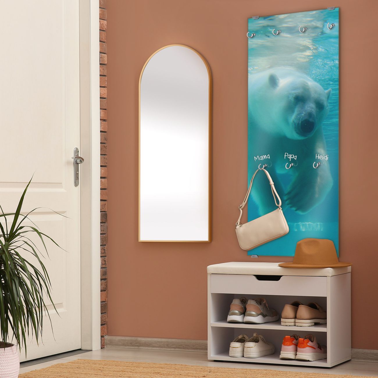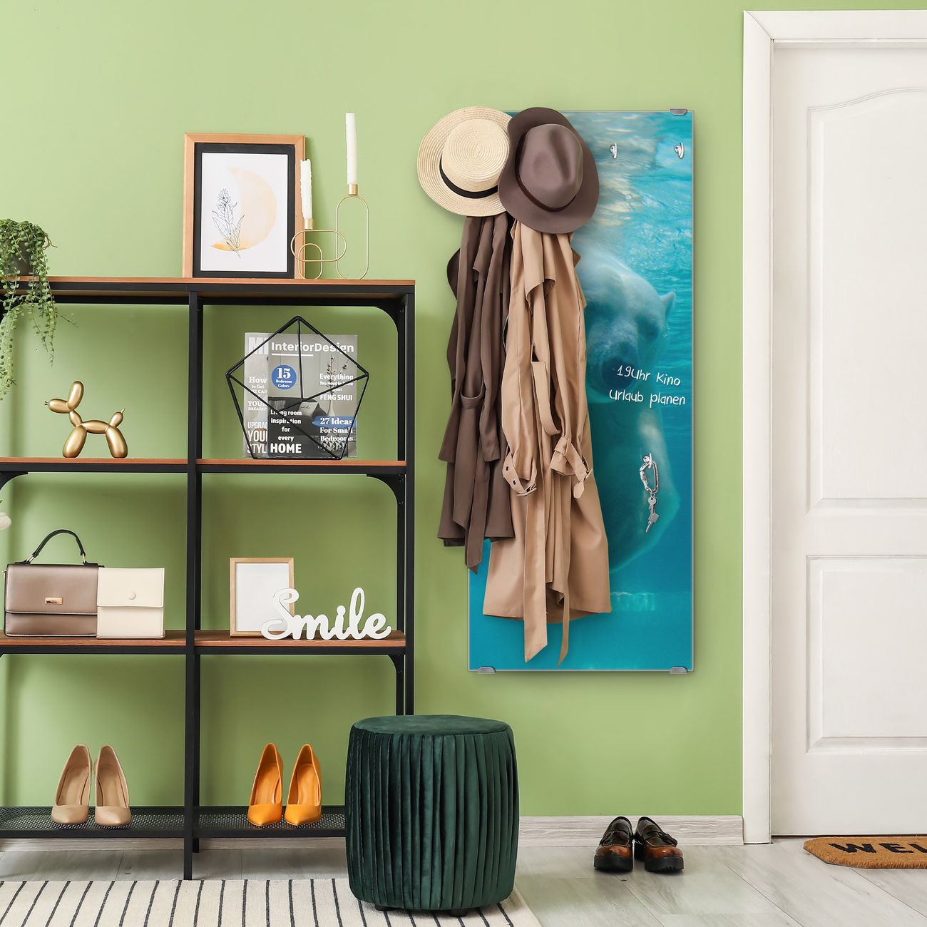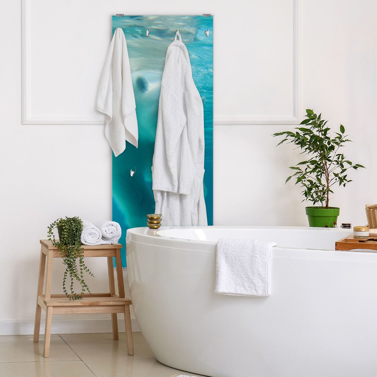FUNKTION: Die banjado Wandgarderobe mit Motiv Eisbär unter Wasser ist Ihr täglicher Begleiter. Zuverlässig hängen hier Ihre Jacken und Mäntel griffbereit. Das Echtglas ist Ihr Paneel auch beschreibbar und wieder abwischbar. DESIGN: Sie erhalten eine Garderobenleiste aus elegantem Echtglas mit dem Farbbrillanten Motiv Eisbär unter Wasser hinterklebt. Das Design ist zeitlos klassisch, ohne dabei auf Funktionalität zu verzichten. Suchen Sie aus einer Vielzahl von Motiven das für Ihre Einrichtung Passende aus. DETAILS: Die Flurgarderobe besteht aus 4mm gehärtetem Sicherheitsglas. Sie ist 50cm breit, 125cm hoch und 6cm tief. Die Garderobenhaken zur Selbstmontage präsentieren sich in Edelstahl-Optik, ebenso die Abstandshalter für die Wandmontage. Ihre neue Garderobe ist sofort einsatzbereit. NUTZEN: Ihre neue Garderobe hält nicht nur zuverlässig Ihre Kleidung, sie ist auch optisch ein Blickfang. Durch das Glas können Sie an der Garderobe mit wasserlöslichen Kreidestiften oder Whiteboard-Markern auch Nachrichten hinterlassen. BANJADO: Wir sind ein kleines kreatives Team aus Sachsen und entwickeln Produkte die Design und Funktionalität verbinden sollen. Viel Freude mit Ihrer neuen Garderobe wünscht das banjado-Team!