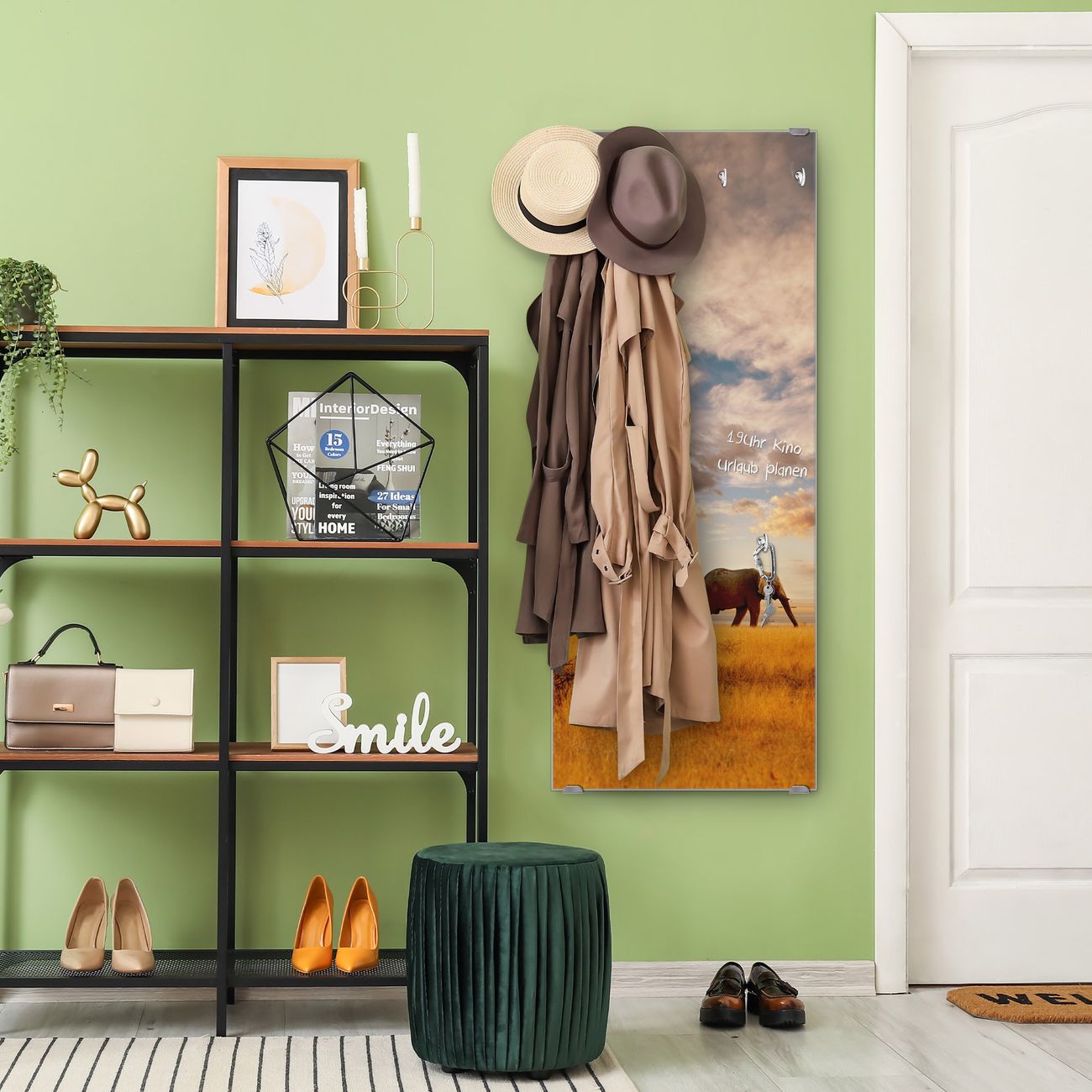 FUNKTION: Die banjado Wandgarderobe mit Motiv Elefanten ist Ihr täglicher Begleiter. Zuverlässig hängen hier Ihre Jacken und Mäntel griffbereit. Das Echtglas ist Ihr Paneel auch beschreibbar und wieder abwischbar. DESIGN: Sie erhalten eine Garderobenleiste aus elegantem Echtglas mit dem Farbbrillanten Motiv Elefanten hinterklebt. Das Design ist zeitlos klassisch, ohne dabei auf Funktionalität zu verzichten. Suchen Sie aus einer Vielzahl von Motiven das für Ihre Einrichtung Passende aus. DETAILS: Die Flurgarderobe besteht aus 4mm gehärtetem Sicherheitsglas. Sie ist 50cm breit, 125cm hoch und 6cm tief. Die Garderobenhaken zur Selbstmontage präsentieren sich in Edelstahl-Optik, ebenso die Abstandshalter für die Wandmontage. Ihre neue Garderobe ist sofort einsatzbereit. NUTZEN: Ihre neue Garderobe hält nicht nur zuverlässig Ihre Kleidung, sie ist auch optisch ein Blickfang. Durch das Glas können Sie an der Garderobe mit wasserlöslichen Kreidestiften oder Whiteboard-Markern auch Nachrichten hinterlassen. BANJADO: Wir sind ein kleines kreatives Team aus Sachsen und entwickeln Produkte die Design und Funktionalität verbinden sollen. Viel Freude mit Ihrer neuen Garderobe wünscht das banjado-Team!