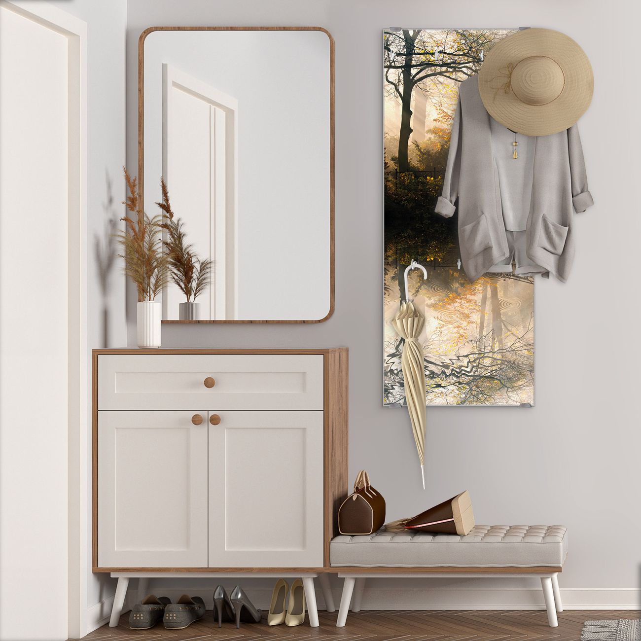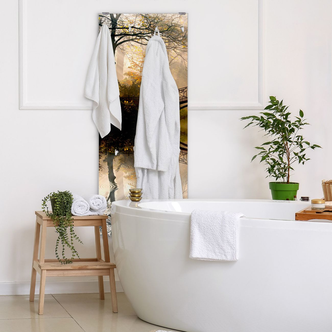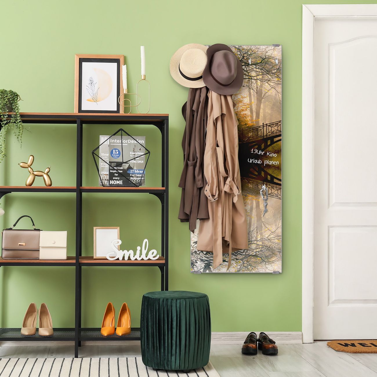 FUNKTION: Die banjado Wandgarderobe mit Motiv Englischer Garten ist Ihr täglicher Begleiter. Zuverlässig hängen hier Ihre Jacken und Mäntel griffbereit. Das Echtglas ist Ihr Paneel auch beschreibbar und wieder abwischbar. DESIGN: Sie erhalten eine Garderobenleiste aus elegantem Echtglas mit dem Farbbrillanten Motiv Englischer Garten hinterklebt. Das Design ist zeitlos klassisch, ohne dabei auf Funktionalität zu verzichten. Suchen Sie aus einer Vielzahl von Motiven das für Ihre Einrichtung Passende aus. DETAILS: Die Flurgarderobe besteht aus 4mm gehärtetem Sicherheitsglas. Sie ist 50cm breit, 125cm hoch und 6cm tief. Die Garderobenhaken zur Selbstmontage präsentieren sich in Edelstahl-Optik, ebenso die Abstandshalter für die Wandmontage. Ihre neue Garderobe ist sofort einsatzbereit. NUTZEN: Ihre neue Garderobe hält nicht nur zuverlässig Ihre Kleidung, sie ist auch optisch ein Blickfang. Durch das Glas können Sie an der Garderobe mit wasserlöslichen Kreidestiften oder Whiteboard-Markern auch Nachrichten hinterlassen. BANJADO: Wir sind ein kleines kreatives Team aus Sachsen und entwickeln Produkte die Design und Funktionalität verbinden sollen. Viel Freude mit Ihrer neuen Garderobe wünscht das banjado-Team!