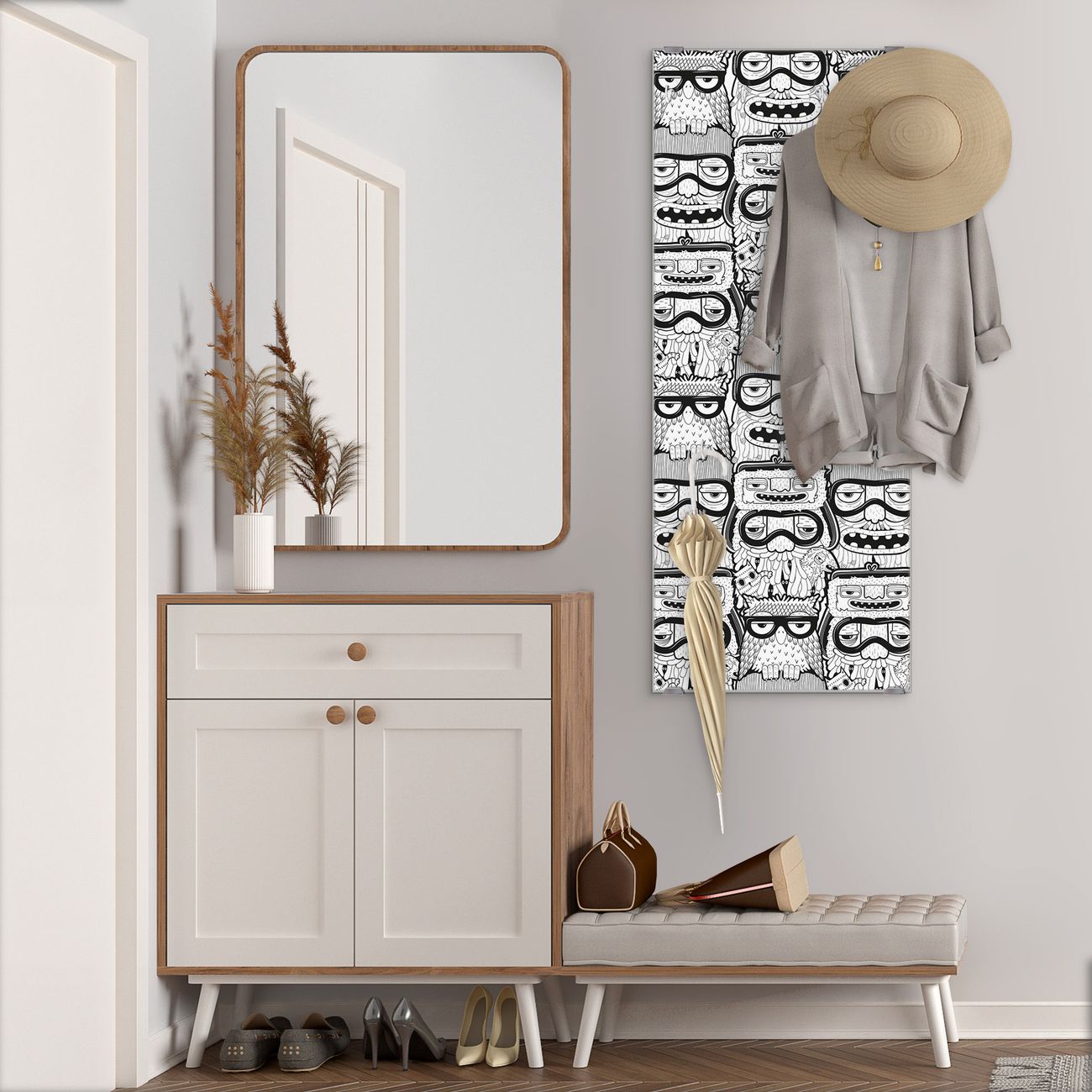 FUNKTION: Die banjado Wandgarderobe mit Motiv Eule und Olaf ist Ihr täglicher Begleiter. Zuverlässig hängen hier Ihre Jacken und Mäntel griffbereit. Das Echtglas ist Ihr Paneel auch beschreibbar und wieder abwischbar. DESIGN: Sie erhalten eine Garderobenleiste aus elegantem Echtglas mit dem Farbbrillanten Motiv Eule und Olaf hinterklebt. Das Design ist zeitlos klassisch, ohne dabei auf Funktionalität zu verzichten. Suchen Sie aus einer Vielzahl von Motiven das für Ihre Einrichtung Passende aus. DETAILS: Die Flurgarderobe besteht aus 4mm gehärtetem Sicherheitsglas. Sie ist 50cm breit, 125cm hoch und 6cm tief. Die Garderobenhaken zur Selbstmontage präsentieren sich in Edelstahl-Optik, ebenso die Abstandshalter für die Wandmontage. Ihre neue Garderobe ist sofort einsatzbereit. NUTZEN: Ihre neue Garderobe hält nicht nur zuverlässig Ihre Kleidung, sie ist auch optisch ein Blickfang. Durch das Glas können Sie an der Garderobe mit wasserlöslichen Kreidestiften oder Whiteboard-Markern auch Nachrichten hinterlassen. BANJADO: Wir sind ein kleines kreatives Team aus Sachsen und entwickeln Produkte die Design und Funktionalität verbinden sollen. Viel Freude mit Ihrer neuen Garderobe wünscht das banjado-Team!