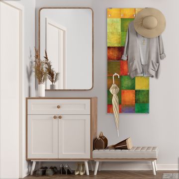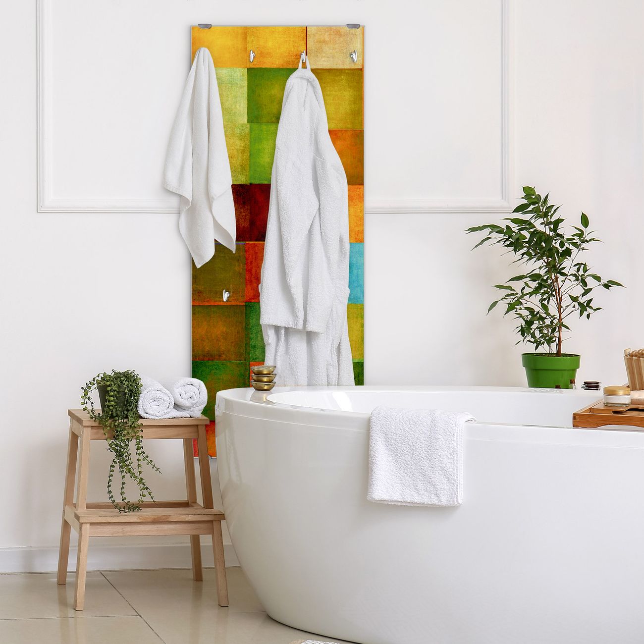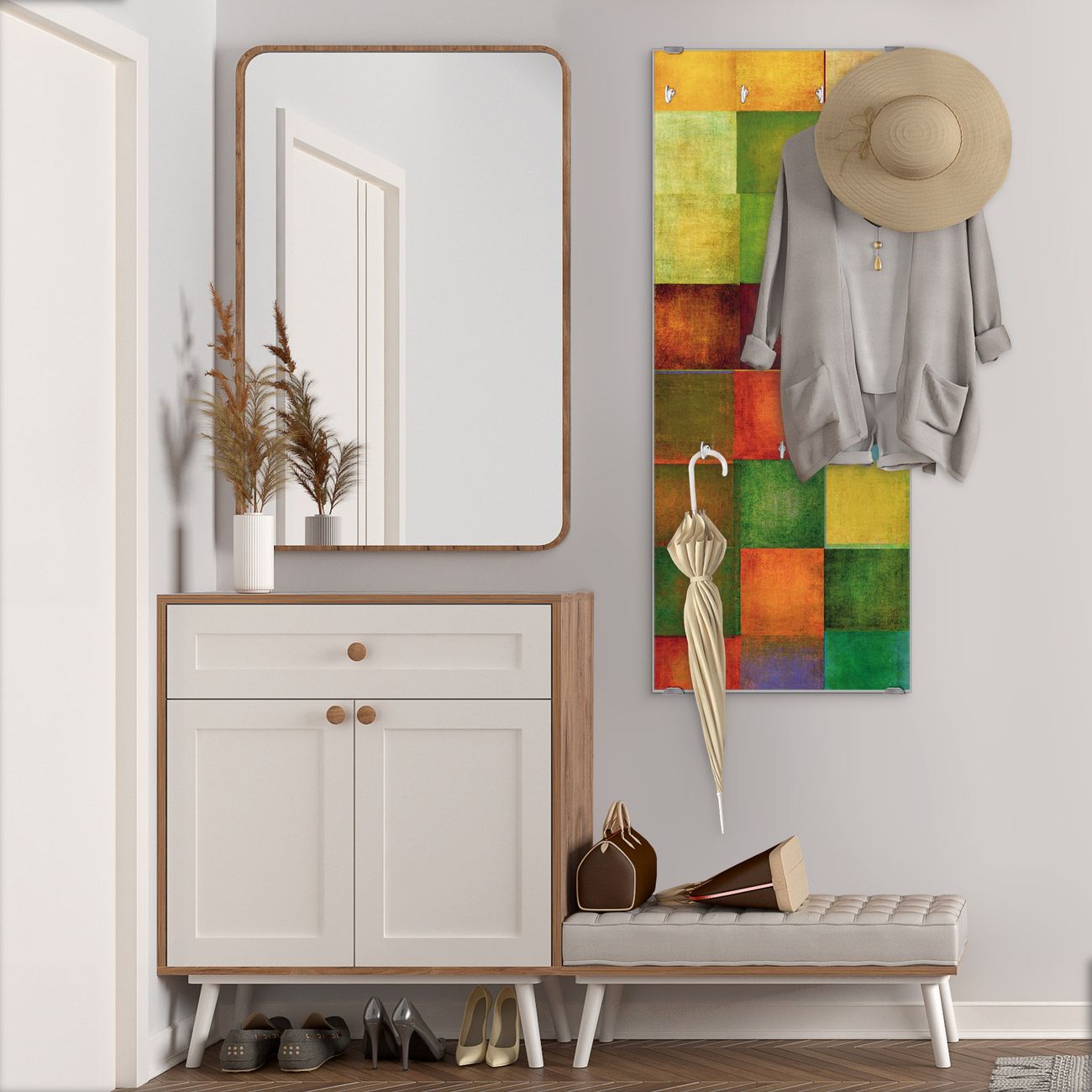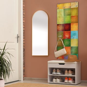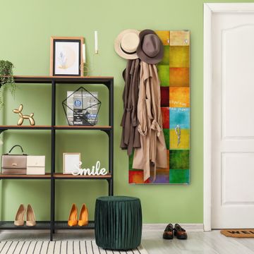 FUNKTION: Die banjado Wandgarderobe mit Motiv Farbkasten 2 ist Ihr täglicher Begleiter. Zuverlässig hängen hier Ihre Jacken und Mäntel griffbereit. Das Echtglas ist Ihr Paneel auch beschreibbar und wieder abwischbar. DESIGN: Sie erhalten eine Garderobenleiste aus elegantem Echtglas mit dem Farbbrillanten Motiv Farbkasten 2 hinterklebt. Das Design ist zeitlos klassisch, ohne dabei auf Funktionalität zu verzichten. Suchen Sie aus einer Vielzahl von Motiven das für Ihre Einrichtung Passende aus. DETAILS: Die Flurgarderobe besteht aus 4mm gehärtetem Sicherheitsglas. Sie ist 50cm breit, 125cm hoch und 6cm tief. Die Garderobenhaken zur Selbstmontage präsentieren sich in Edelstahl-Optik, ebenso die Abstandshalter für die Wandmontage. Ihre neue Garderobe ist sofort einsatzbereit. NUTZEN: Ihre neue Garderobe hält nicht nur zuverlässig Ihre Kleidung, sie ist auch optisch ein Blickfang. Durch das Glas können Sie an der Garderobe mit wasserlöslichen Kreidestiften oder Whiteboard-Markern auch Nachrichten hinterlassen. BANJADO: Wir sind ein kleines kreatives Team aus Sachsen und entwickeln Produkte die Design und Funktionalität verbinden sollen. Viel Freude mit Ihrer neuen Garderobe wünscht das banjado-Team!