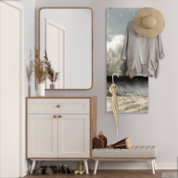 FUNKTION: Die banjado Wandgarderobe mit Motiv Fels In Der Brandung ist Ihr täglicher Begleiter. Zuverlässig hängen hier Ihre Jacken und Mäntel griffbereit. Das Echtglas ist Ihr Paneel auch beschreibbar und wieder abwischbar. DESIGN: Sie erhalten eine Garderobenleiste aus elegantem Echtglas mit dem Farbbrillanten Motiv Fels In Der Brandung hinterklebt. Das Design ist zeitlos klassisch, ohne dabei auf Funktionalität zu verzichten. Suchen Sie aus einer Vielzahl von Motiven das für Ihre Einrichtung Passende aus. DETAILS: Die Flurgarderobe besteht aus 4mm gehärtetem Sicherheitsglas. Sie ist 50cm breit, 125cm hoch und 6cm tief. Die Garderobenhaken zur Selbstmontage präsentieren sich in Edelstahl-Optik, ebenso die Abstandshalter für die Wandmontage. Ihre neue Garderobe ist sofort einsatzbereit. NUTZEN: Ihre neue Garderobe hält nicht nur zuverlässig Ihre Kleidung, sie ist auch optisch ein Blickfang. Durch das Glas können Sie an der Garderobe mit wasserlöslichen Kreidestiften oder Whiteboard-Markern auch Nachrichten hinterlassen. BANJADO: Wir sind ein kleines kreatives Team aus Sachsen und entwickeln Produkte die Design und Funktionalität verbinden sollen. Viel Freude mit Ihrer neuen Garderobe wünscht das banjado-Team!