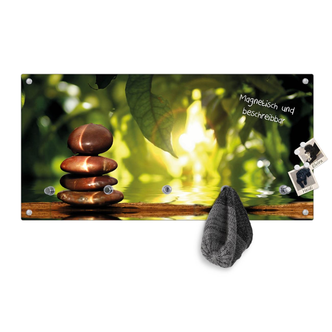 Bitte beachten Sie, dass an dieser Garderobe nur starke Neodym-Magnete halten! FUNKTION: Die banjado Wandgarderobe mit Motiv Feng Shui ist Ihr täglicher Begleiter. Zuverlässig hängen hier Ihre Jacken und Mäntel griffbereit. Gleichzeitig ist die Design Garderobe magnetisch, Sie können Notizen anheften und durch das Echtglas ist Ihr Paneel auch beschreibbar und wieder abwischbar. DESIGN: Sie erhalten eine Garderobenleiste aus elegantem Echtglas mit dem Farbbrillanten Motiv Feng Shui hinterklebt. Das Design ist zeitlos klassisch, ohne dabei auf Funktionalität zu verzichten. Suchen Sie aus einer Vielzahl von Motiven das für Ihre Einrichtung Passende aus. DETAILS: Die Flurgarderobe besteht aus 4mm gehärtetem Sicherheitsglas. Sie ist 80cm breit, 40cm hoch und 6cm tief. Die Garderobenhaken zur Selbstmontage präsentieren sich in Edelstahl-Optik, ebenso die Abstandshalter für die Wandmontage. Ihre neue Garderobe ist sofort einsatzbereit. NUTZEN: Ihre neue Garderobe hält nicht nur zuverlässig Ihre Kleidung, sie ist auch optisch ein Blickfang. Durch die magnetische Wirkung können Sie mit 4 beigefügten extrastarken Neodym-Magneten Notizen anheften und mit wasserlöslichen Kreidestiften oder Whiteboard-Markern auch Nachrichten hinterlassen. BANJADO: Wir sind ein kleines kreatives Team aus Sachsen und entwickeln Produkte die Design und Funktionalität verbinden sollen. Viel Freude mit Ihrer neuen Garderobe wünscht das banjado-Team!