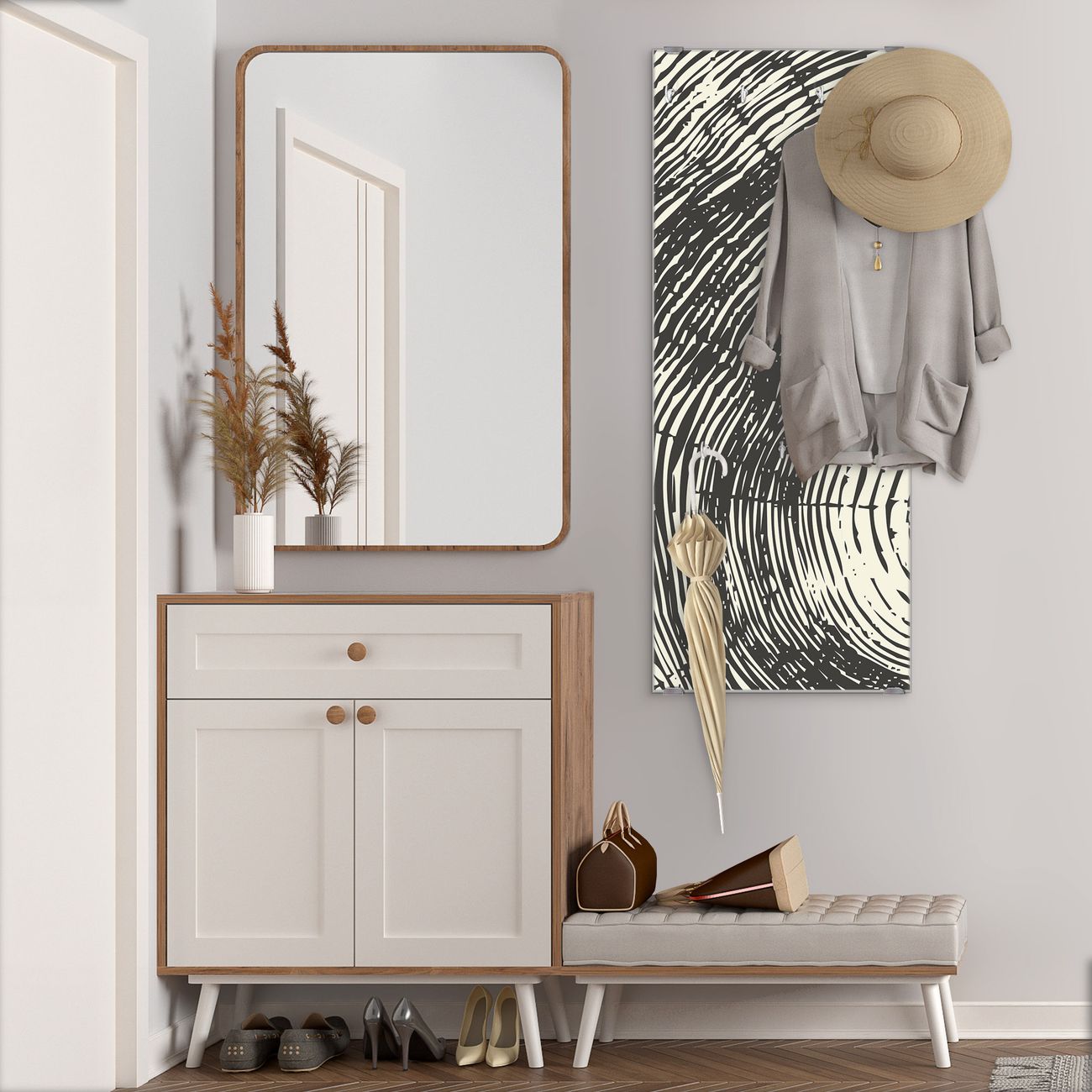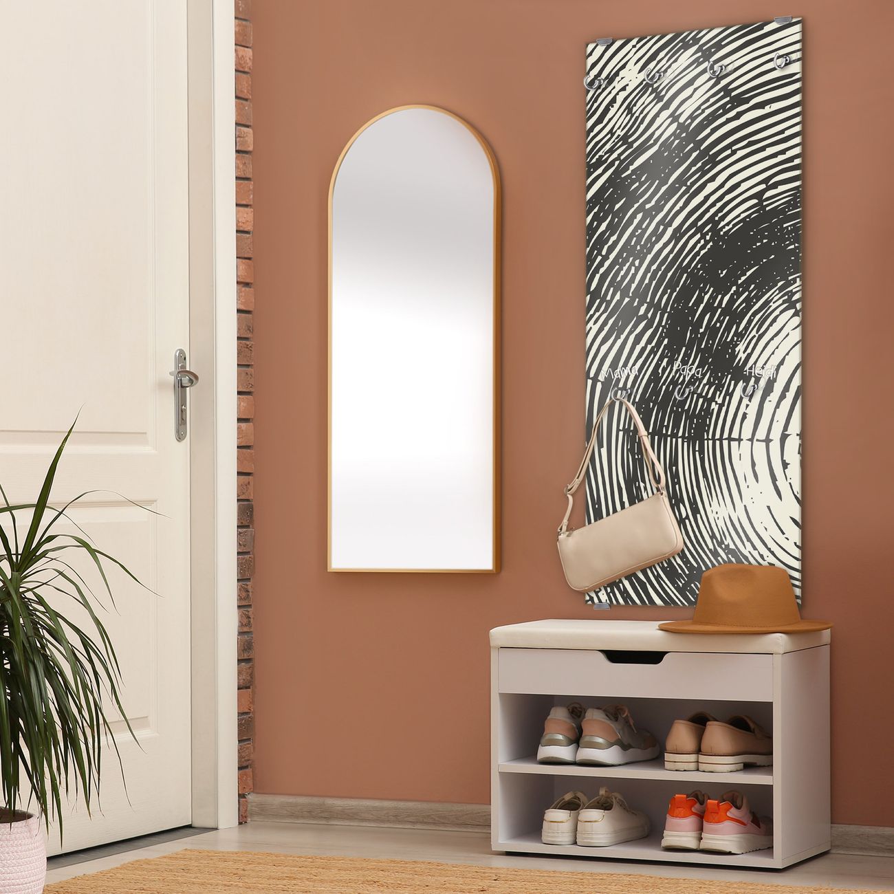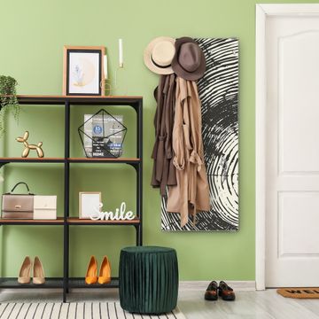 FUNKTION: Die banjado Wandgarderobe mit Motiv Fingerabdruck ist Ihr täglicher Begleiter. Zuverlässig hängen hier Ihre Jacken und Mäntel griffbereit. Das Echtglas ist Ihr Paneel auch beschreibbar und wieder abwischbar. DESIGN: Sie erhalten eine Garderobenleiste aus elegantem Echtglas mit dem Farbbrillanten Motiv Fingerabdruck hinterklebt. Das Design ist zeitlos klassisch, ohne dabei auf Funktionalität zu verzichten. Suchen Sie aus einer Vielzahl von Motiven das für Ihre Einrichtung Passende aus. DETAILS: Die Flurgarderobe besteht aus 4mm gehärtetem Sicherheitsglas. Sie ist 50cm breit, 125cm hoch und 6cm tief. Die Garderobenhaken zur Selbstmontage präsentieren sich in Edelstahl-Optik, ebenso die Abstandshalter für die Wandmontage. Ihre neue Garderobe ist sofort einsatzbereit. NUTZEN: Ihre neue Garderobe hält nicht nur zuverlässig Ihre Kleidung, sie ist auch optisch ein Blickfang. Durch das Glas können Sie an der Garderobe mit wasserlöslichen Kreidestiften oder Whiteboard-Markern auch Nachrichten hinterlassen. BANJADO: Wir sind ein kleines kreatives Team aus Sachsen und entwickeln Produkte die Design und Funktionalität verbinden sollen. Viel Freude mit Ihrer neuen Garderobe wünscht das banjado-Team!