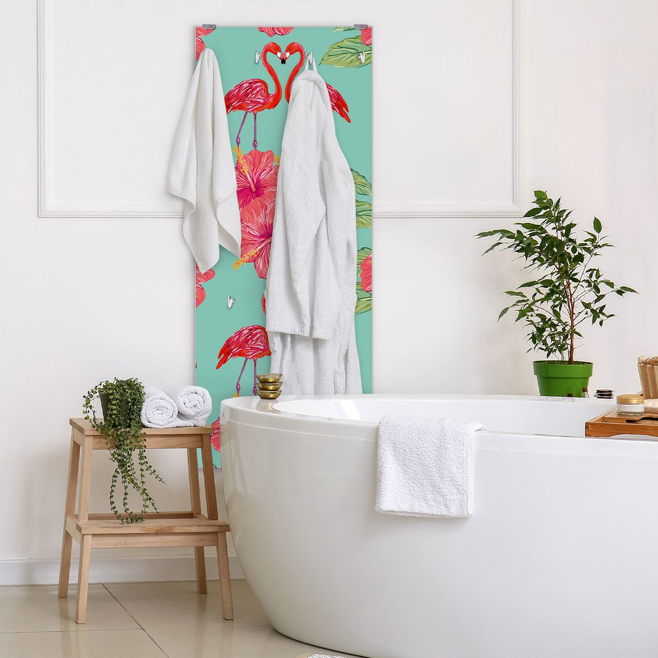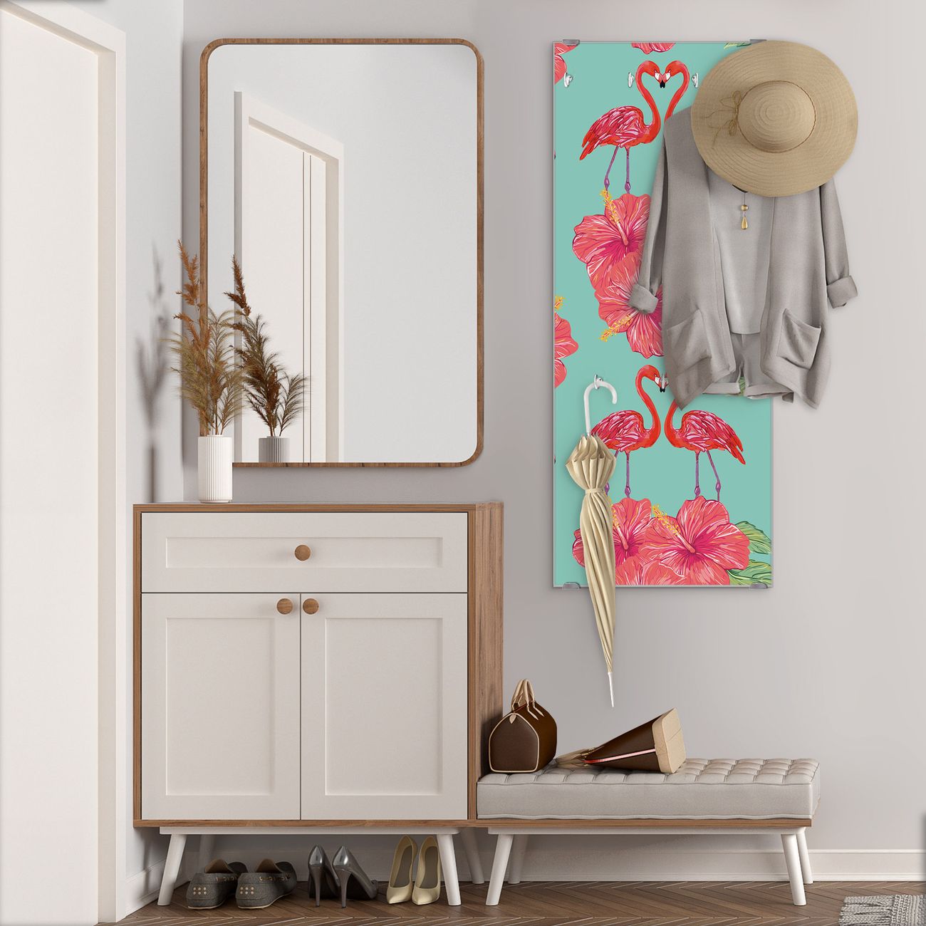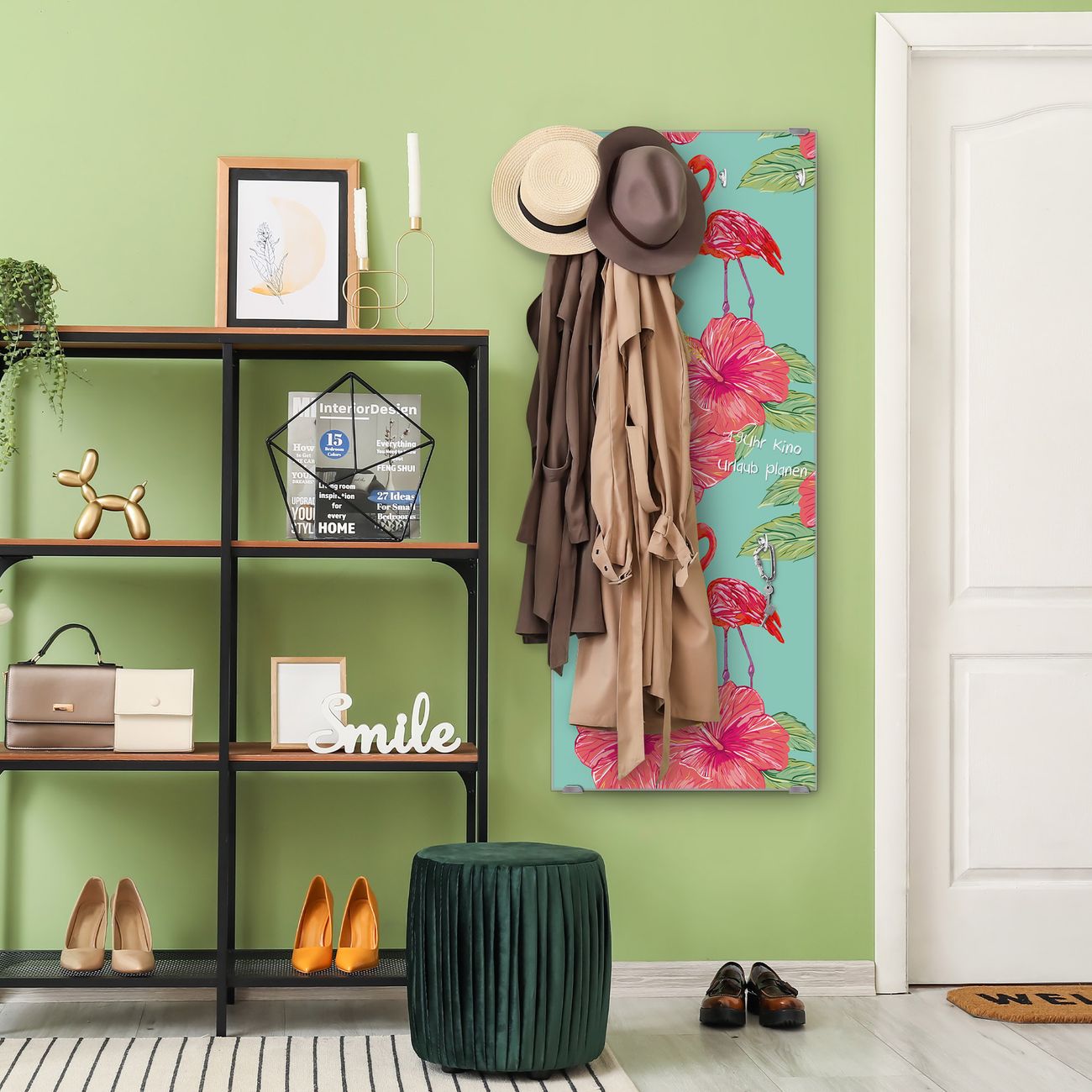 FUNKTION: Die banjado Wandgarderobe mit Motiv Flamingo Liebe ist Ihr täglicher Begleiter. Zuverlässig hängen hier Ihre Jacken und Mäntel griffbereit. Das Echtglas ist Ihr Paneel auch beschreibbar und wieder abwischbar. DESIGN: Sie erhalten eine Garderobenleiste aus elegantem Echtglas mit dem Farbbrillanten Motiv Flamingo Liebe hinterklebt. Das Design ist zeitlos klassisch, ohne dabei auf Funktionalität zu verzichten. Suchen Sie aus einer Vielzahl von Motiven das für Ihre Einrichtung Passende aus. DETAILS: Die Flurgarderobe besteht aus 4mm gehärtetem Sicherheitsglas. Sie ist 50cm breit, 125cm hoch und 6cm tief. Die Garderobenhaken zur Selbstmontage präsentieren sich in Edelstahl-Optik, ebenso die Abstandshalter für die Wandmontage. Ihre neue Garderobe ist sofort einsatzbereit. NUTZEN: Ihre neue Garderobe hält nicht nur zuverlässig Ihre Kleidung, sie ist auch optisch ein Blickfang. Durch das Glas können Sie an der Garderobe mit wasserlöslichen Kreidestiften oder Whiteboard-Markern auch Nachrichten hinterlassen. BANJADO: Wir sind ein kleines kreatives Team aus Sachsen und entwickeln Produkte die Design und Funktionalität verbinden sollen. Viel Freude mit Ihrer neuen Garderobe wünscht das banjado-Team!