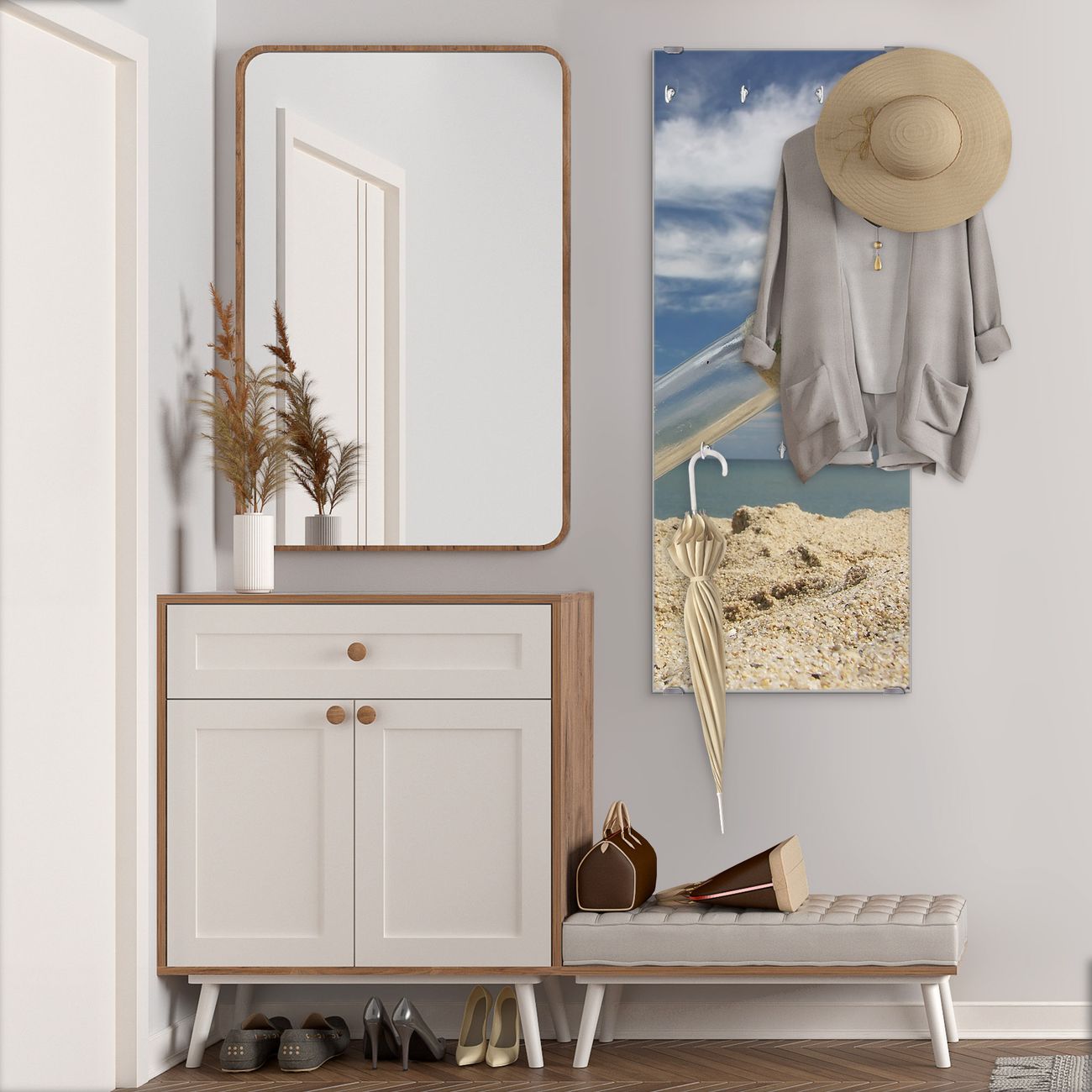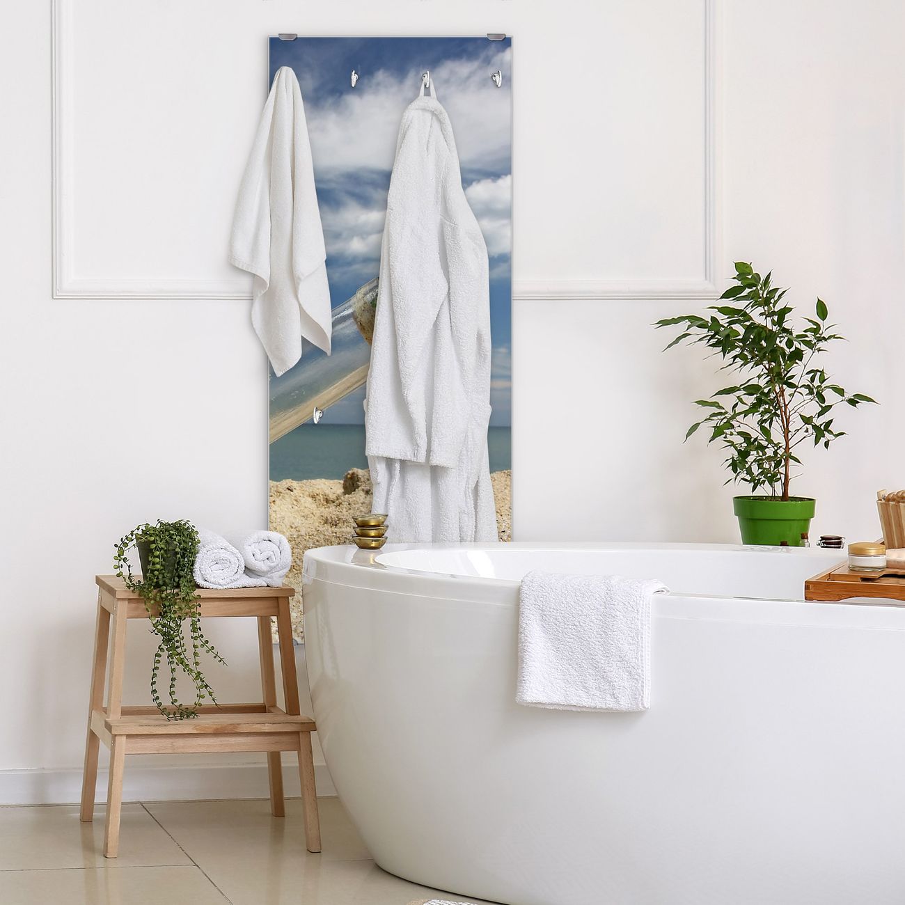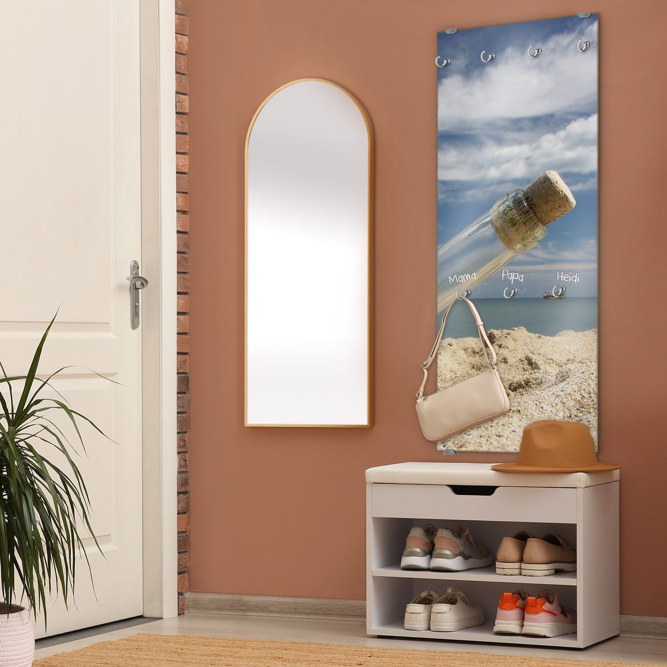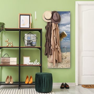 FUNKTION: Die banjado Wandgarderobe mit Motiv Flaschenpost ist Ihr täglicher Begleiter. Zuverlässig hängen hier Ihre Jacken und Mäntel griffbereit. Das Echtglas ist Ihr Paneel auch beschreibbar und wieder abwischbar. DESIGN: Sie erhalten eine Garderobenleiste aus elegantem Echtglas mit dem Farbbrillanten Motiv Flaschenpost hinterklebt. Das Design ist zeitlos klassisch, ohne dabei auf Funktionalität zu verzichten. Suchen Sie aus einer Vielzahl von Motiven das für Ihre Einrichtung Passende aus. DETAILS: Die Flurgarderobe besteht aus 4mm gehärtetem Sicherheitsglas. Sie ist 50cm breit, 125cm hoch und 6cm tief. Die Garderobenhaken zur Selbstmontage präsentieren sich in Edelstahl-Optik, ebenso die Abstandshalter für die Wandmontage. Ihre neue Garderobe ist sofort einsatzbereit. NUTZEN: Ihre neue Garderobe hält nicht nur zuverlässig Ihre Kleidung, sie ist auch optisch ein Blickfang. Durch das Glas können Sie an der Garderobe mit wasserlöslichen Kreidestiften oder Whiteboard-Markern auch Nachrichten hinterlassen. BANJADO: Wir sind ein kleines kreatives Team aus Sachsen und entwickeln Produkte die Design und Funktionalität verbinden sollen. Viel Freude mit Ihrer neuen Garderobe wünscht das banjado-Team!