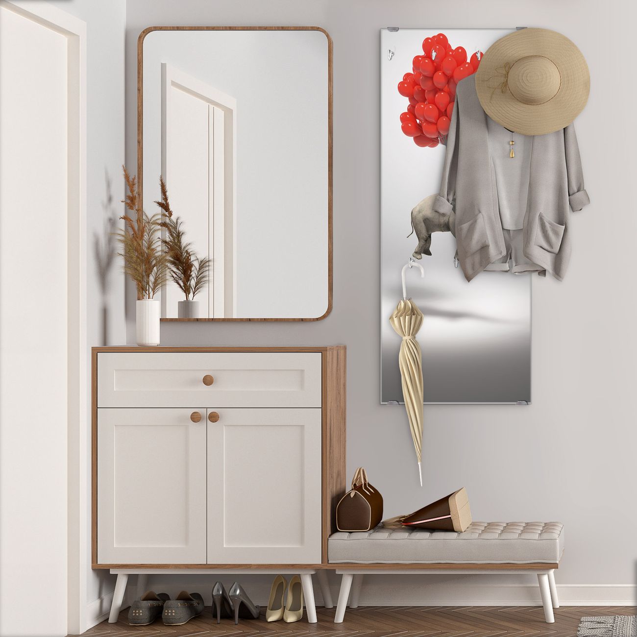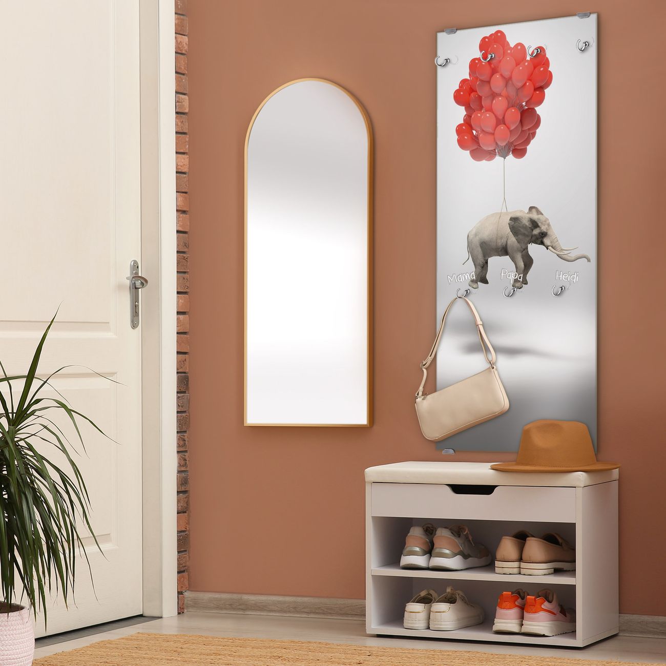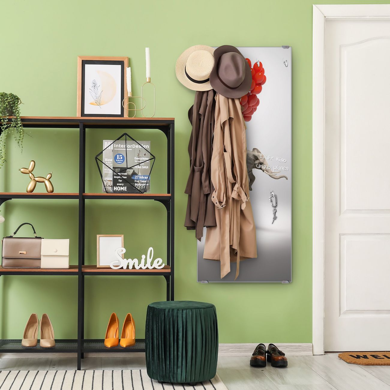 FUNKTION: Die banjado Wandgarderobe mit Motiv Fliegender Elefant ist Ihr täglicher Begleiter. Zuverlässig hängen hier Ihre Jacken und Mäntel griffbereit. Das Echtglas ist Ihr Paneel auch beschreibbar und wieder abwischbar. DESIGN: Sie erhalten eine Garderobenleiste aus elegantem Echtglas mit dem Farbbrillanten Motiv Fliegender Elefant hinterklebt. Das Design ist zeitlos klassisch, ohne dabei auf Funktionalität zu verzichten. Suchen Sie aus einer Vielzahl von Motiven das für Ihre Einrichtung Passende aus. DETAILS: Die Flurgarderobe besteht aus 4mm gehärtetem Sicherheitsglas. Sie ist 50cm breit, 125cm hoch und 6cm tief. Die Garderobenhaken zur Selbstmontage präsentieren sich in Edelstahl-Optik, ebenso die Abstandshalter für die Wandmontage. Ihre neue Garderobe ist sofort einsatzbereit. NUTZEN: Ihre neue Garderobe hält nicht nur zuverlässig Ihre Kleidung, sie ist auch optisch ein Blickfang. Durch das Glas können Sie an der Garderobe mit wasserlöslichen Kreidestiften oder Whiteboard-Markern auch Nachrichten hinterlassen. BANJADO: Wir sind ein kleines kreatives Team aus Sachsen und entwickeln Produkte die Design und Funktionalität verbinden sollen. Viel Freude mit Ihrer neuen Garderobe wünscht das banjado-Team!