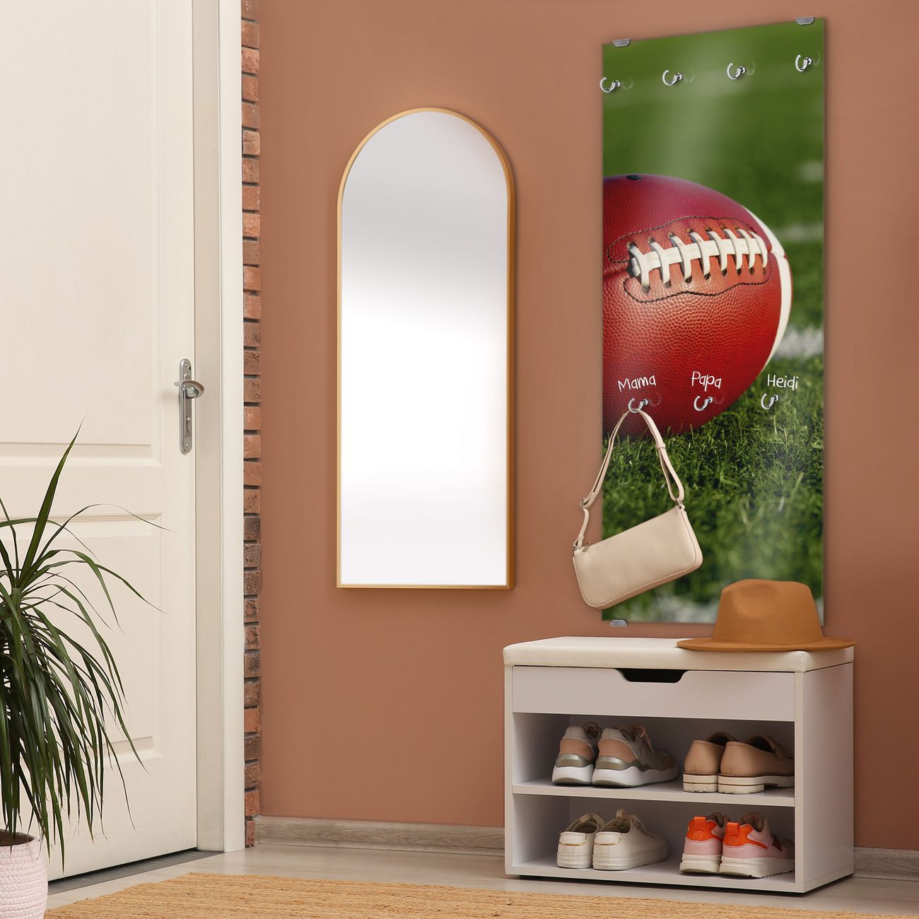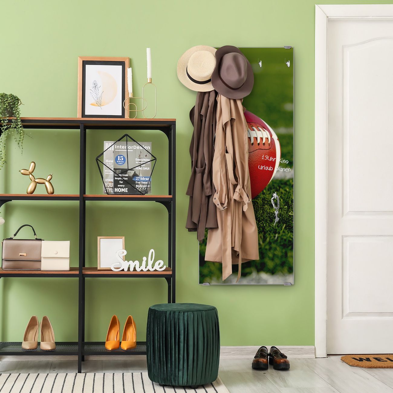 FUNKTION: Die banjado Wandgarderobe mit Motiv Football ist Ihr täglicher Begleiter. Zuverlässig hängen hier Ihre Jacken und Mäntel griffbereit. Das Echtglas ist Ihr Paneel auch beschreibbar und wieder abwischbar. DESIGN: Sie erhalten eine Garderobenleiste aus elegantem Echtglas mit dem Farbbrillanten Motiv Football hinterklebt. Das Design ist zeitlos klassisch, ohne dabei auf Funktionalität zu verzichten. Suchen Sie aus einer Vielzahl von Motiven das für Ihre Einrichtung Passende aus. DETAILS: Die Flurgarderobe besteht aus 4mm gehärtetem Sicherheitsglas. Sie ist 50cm breit, 125cm hoch und 6cm tief. Die Garderobenhaken zur Selbstmontage präsentieren sich in Edelstahl-Optik, ebenso die Abstandshalter für die Wandmontage. Ihre neue Garderobe ist sofort einsatzbereit. NUTZEN: Ihre neue Garderobe hält nicht nur zuverlässig Ihre Kleidung, sie ist auch optisch ein Blickfang. Durch das Glas können Sie an der Garderobe mit wasserlöslichen Kreidestiften oder Whiteboard-Markern auch Nachrichten hinterlassen. BANJADO: Wir sind ein kleines kreatives Team aus Sachsen und entwickeln Produkte die Design und Funktionalität verbinden sollen. Viel Freude mit Ihrer neuen Garderobe wünscht das banjado-Team!