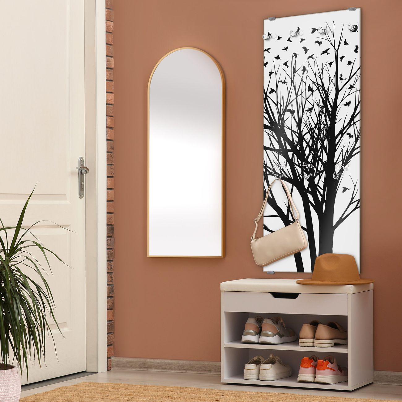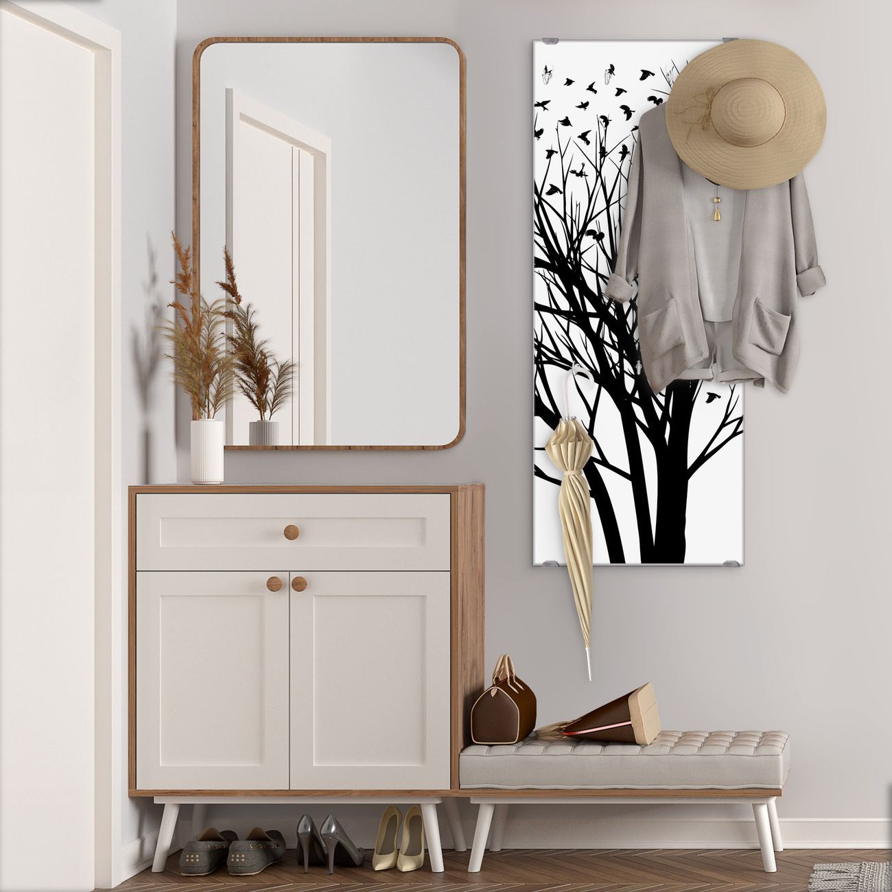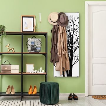 FUNKTION: Die banjado Wandgarderobe mit Motiv Fortfliegen ist Ihr täglicher Begleiter. Zuverlässig hängen hier Ihre Jacken und Mäntel griffbereit. Das Echtglas ist Ihr Paneel auch beschreibbar und wieder abwischbar. DESIGN: Sie erhalten eine Garderobenleiste aus elegantem Echtglas mit dem Farbbrillanten Motiv Fortfliegen hinterklebt. Das Design ist zeitlos klassisch, ohne dabei auf Funktionalität zu verzichten. Suchen Sie aus einer Vielzahl von Motiven das für Ihre Einrichtung Passende aus. DETAILS: Die Flurgarderobe besteht aus 4mm gehärtetem Sicherheitsglas. Sie ist 50cm breit, 125cm hoch und 6cm tief. Die Garderobenhaken zur Selbstmontage präsentieren sich in Edelstahl-Optik, ebenso die Abstandshalter für die Wandmontage. Ihre neue Garderobe ist sofort einsatzbereit. NUTZEN: Ihre neue Garderobe hält nicht nur zuverlässig Ihre Kleidung, sie ist auch optisch ein Blickfang. Durch das Glas können Sie an der Garderobe mit wasserlöslichen Kreidestiften oder Whiteboard-Markern auch Nachrichten hinterlassen. BANJADO: Wir sind ein kleines kreatives Team aus Sachsen und entwickeln Produkte die Design und Funktionalität verbinden sollen. Viel Freude mit Ihrer neuen Garderobe wünscht das banjado-Team!