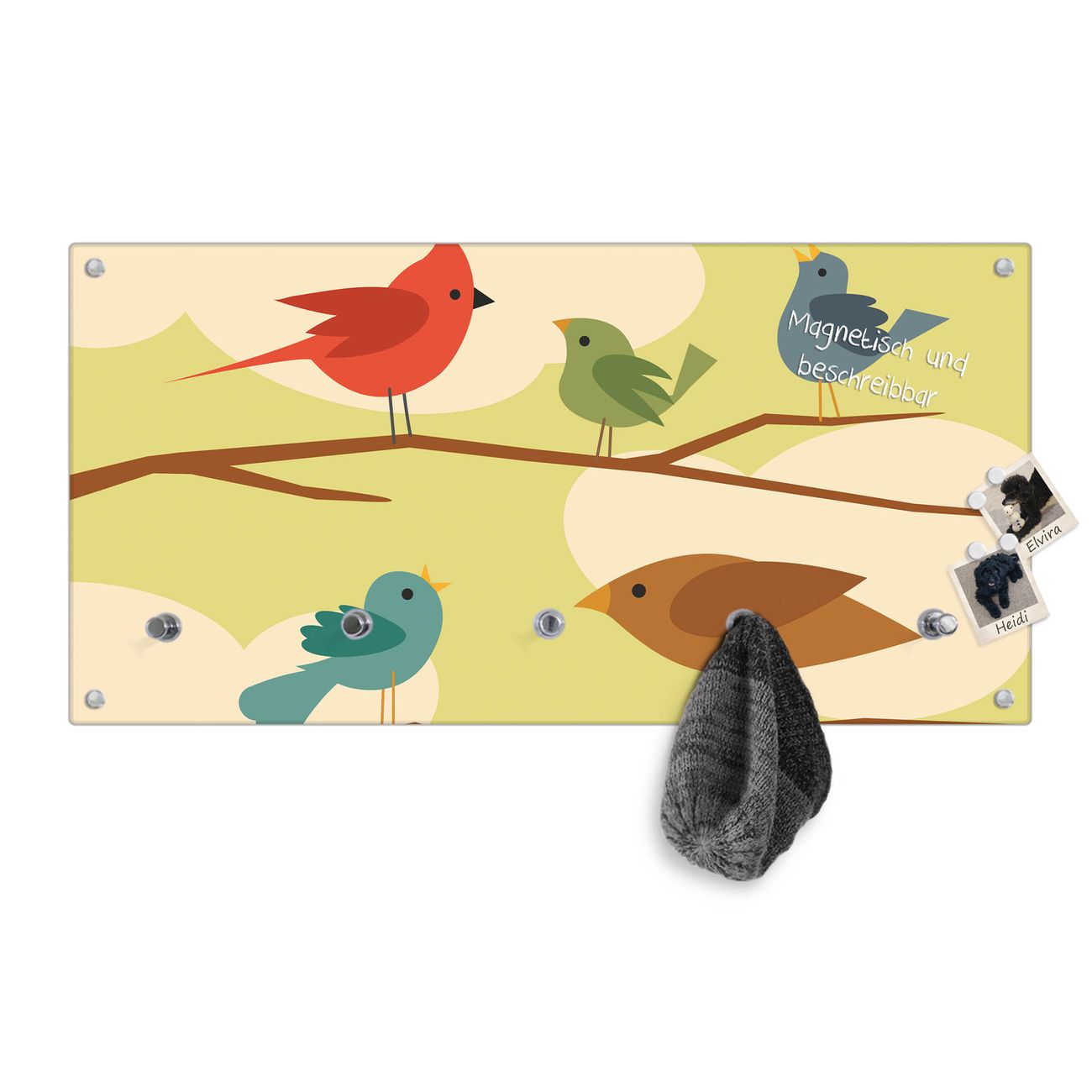 Bitte beachten Sie, dass an dieser Garderobe nur starke Neodym-Magnete halten! FUNKTION: Die banjado Wandgarderobe mit Motiv Fünf Vögel ist Ihr täglicher Begleiter. Zuverlässig hängen hier Ihre Jacken und Mäntel griffbereit. Gleichzeitig ist die Design Garderobe magnetisch, Sie können Notizen anheften und durch das Echtglas ist Ihr Paneel auch beschreibbar und wieder abwischbar. DESIGN: Sie erhalten eine Garderobenleiste aus elegantem Echtglas mit dem Farbbrillanten Motiv Fünf Vögel hinterklebt. Das Design ist zeitlos klassisch, ohne dabei auf Funktionalität zu verzichten. Suchen Sie aus einer Vielzahl von Motiven das für Ihre Einrichtung Passende aus. DETAILS: Die Flurgarderobe besteht aus 4mm gehärtetem Sicherheitsglas. Sie ist 80cm breit, 40cm hoch und 6cm tief. Die Garderobenhaken zur Selbstmontage präsentieren sich in Edelstahl-Optik, ebenso die Abstandshalter für die Wandmontage. Ihre neue Garderobe ist sofort einsatzbereit. NUTZEN: Ihre neue Garderobe hält nicht nur zuverlässig Ihre Kleidung, sie ist auch optisch ein Blickfang. Durch die magnetische Wirkung können Sie mit 4 beigefügten extrastarken Neodym-Magneten Notizen anheften und mit wasserlöslichen Kreidestiften oder Whiteboard-Markern auch Nachrichten hinterlassen. BANJADO: Wir sind ein kleines kreatives Team aus Sachsen und entwickeln Produkte die Design und Funktionalität verbinden sollen. Viel Freude mit Ihrer neuen Garderobe wünscht das banjado-Team!